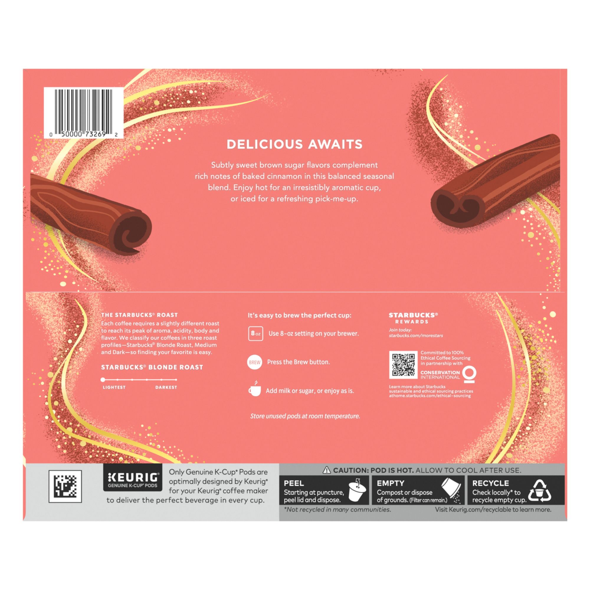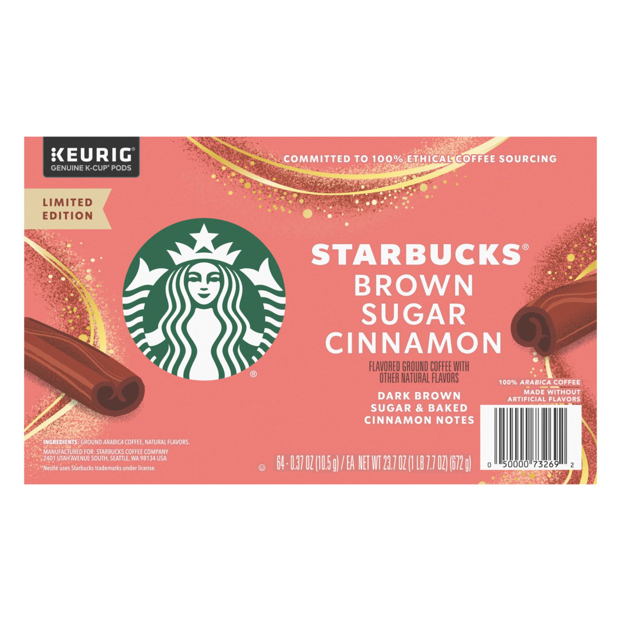 Premium coffee in a K-Cup pod: Starbucks delivers fresh-tasting roasted coffee with their new limited-edition Starbucks Brown Sugar Cinnamon Naturally Flavored Coffee in this 10-count box of coffee pods for Keurig coffee makers