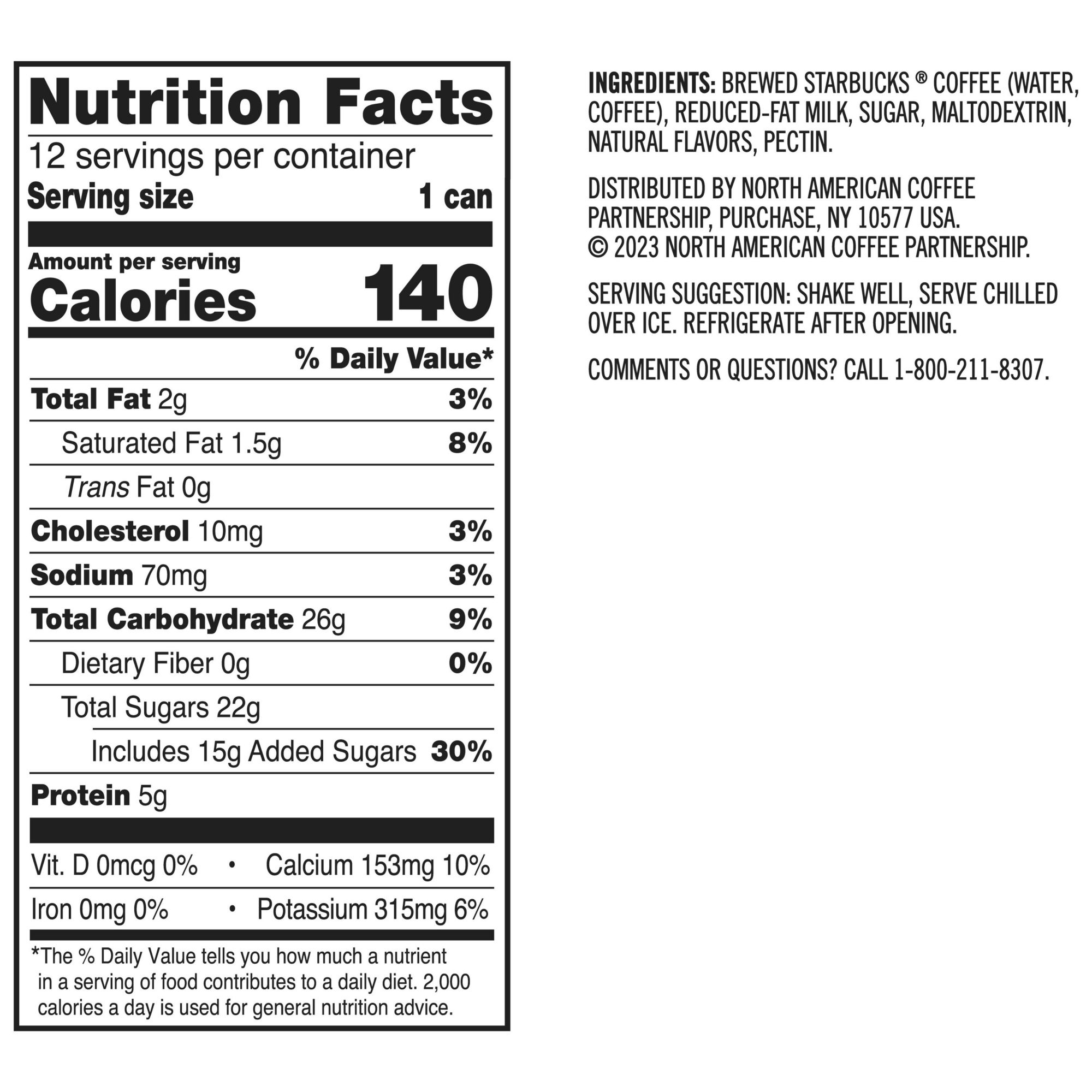Ingredients: Brewed Starbucks Coffee (Water, Coffee), Reduced-fat Milk, Sugar, Maltodextrin, Natural Flavors, Pectin.