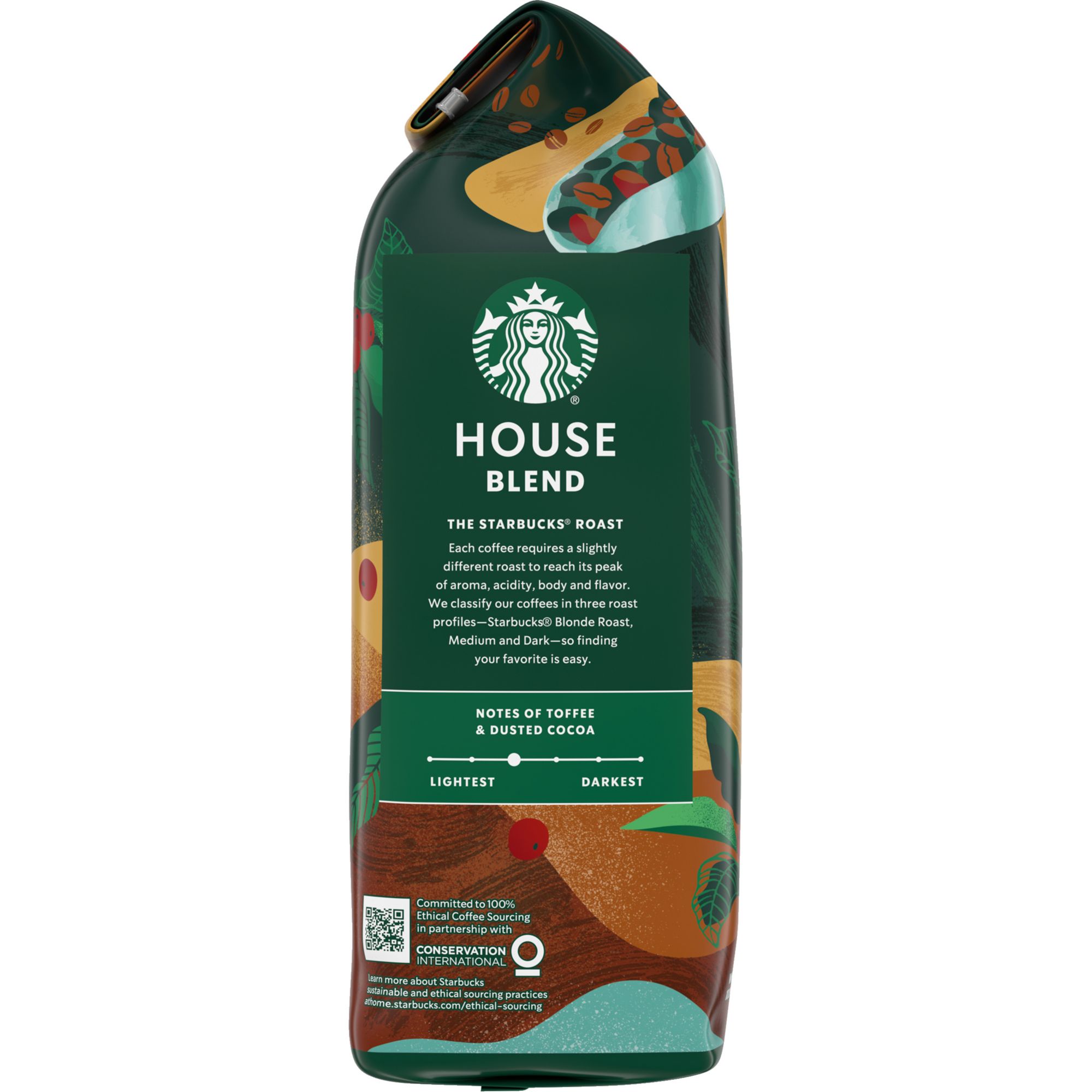 With balanced aroma, body and flavor, this Starbucks House Blend 40 Oz. Whole-Bean Medium-Roast Coffee is a perfect choice to warm your cup each morning. The medium-roast Arabica beans feature tastes of nuts and cocoa that are brought to life during the roasting process.
