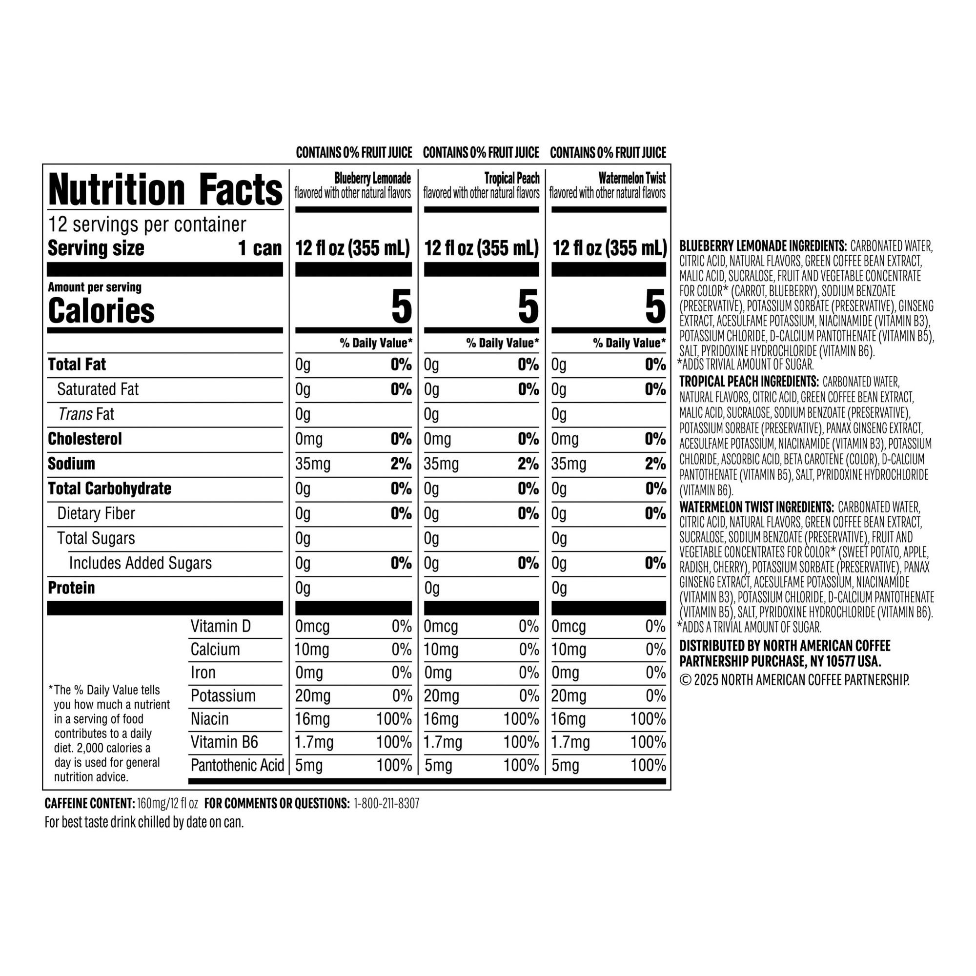 Ingredients: Blueberry Lemoade: Carbonated Water, Citric Acid, Natural Flavors, Green Coffee Bean Extract, Malic Acid, Sucralose, Fruit and Vegtable Concentrate for Color* (Carrot, Bluerberry), Sodium Benzdate (Preservative), Potassium Sorbate (Preservative), Ginsing Extract, Acesulfume Potasium, Niacinamide (Vitamin B3), Potassium Chloride, D-Calcium Pantothenate (Vitamin B5), Salt, Pyridoxine Hydrochloride (Vitamin B5), Salt, Pyridoxine Hydrochloride (Vitamin B6). *Adds trivial ammount of sugar Tropical Peach: Carbonated Water, Natural Flavors,Citric Acid, Green Coffee Bean Extract, Malic Acid, Sucralose, Sodium Benzdate (Preservative), Potassium Sorbate (Preservative), Panax Ginsing Extract, Acesulfume Potasium, Niacinamide (Vitamin B3), Potassium Chloride, Ascorbic Acid, Beta Carotine (Color), D-Calcium Panthenate (Vitamin B5), Salt, Pyridoxine Hydrochloride (Vitamin B6). Watermelon Twist: Carbonated Water, Citric Acid, Natural Flavors, Green Bean Extract, Sucralose, Sodium Benzdate (Preservative) Fruit and Vegtable Concentrates for Color* (Sweet Potato, Apple, Raddish, and Cherry), Potassium Sorbate (Preservative), Panax Ginsing Extract, Acesulfame Potassium, Niacinamide (Vitamin B3) Potassium Chloride, D-Calcium Panthenate (Vitamin B5), Salt, Pyridoxine Hydrochloride (Vitamin B6) *Adds a trival amount of sugar.
