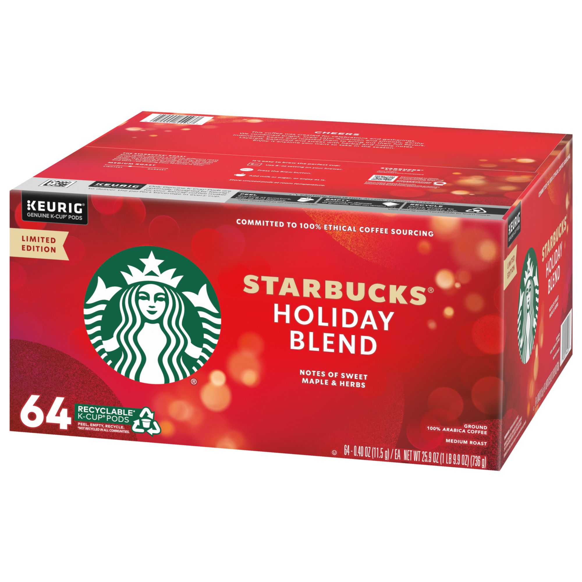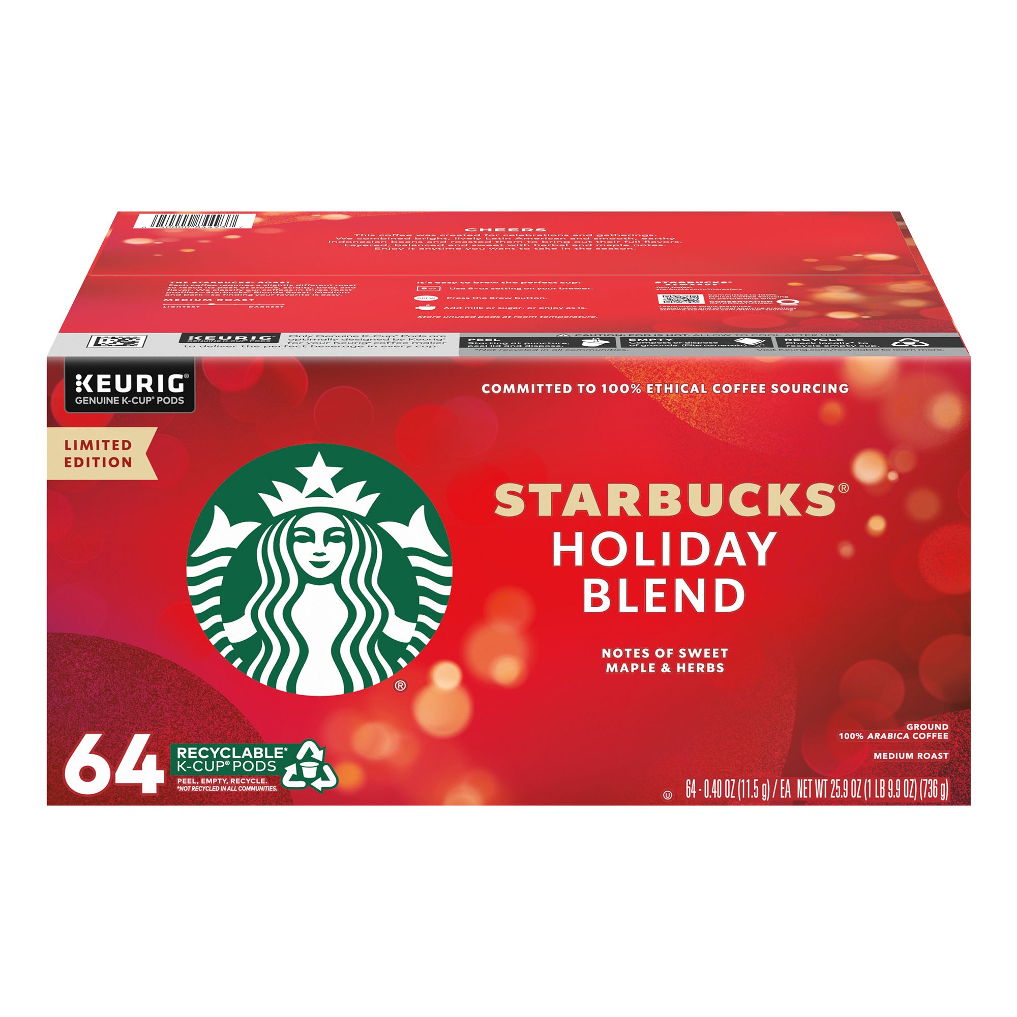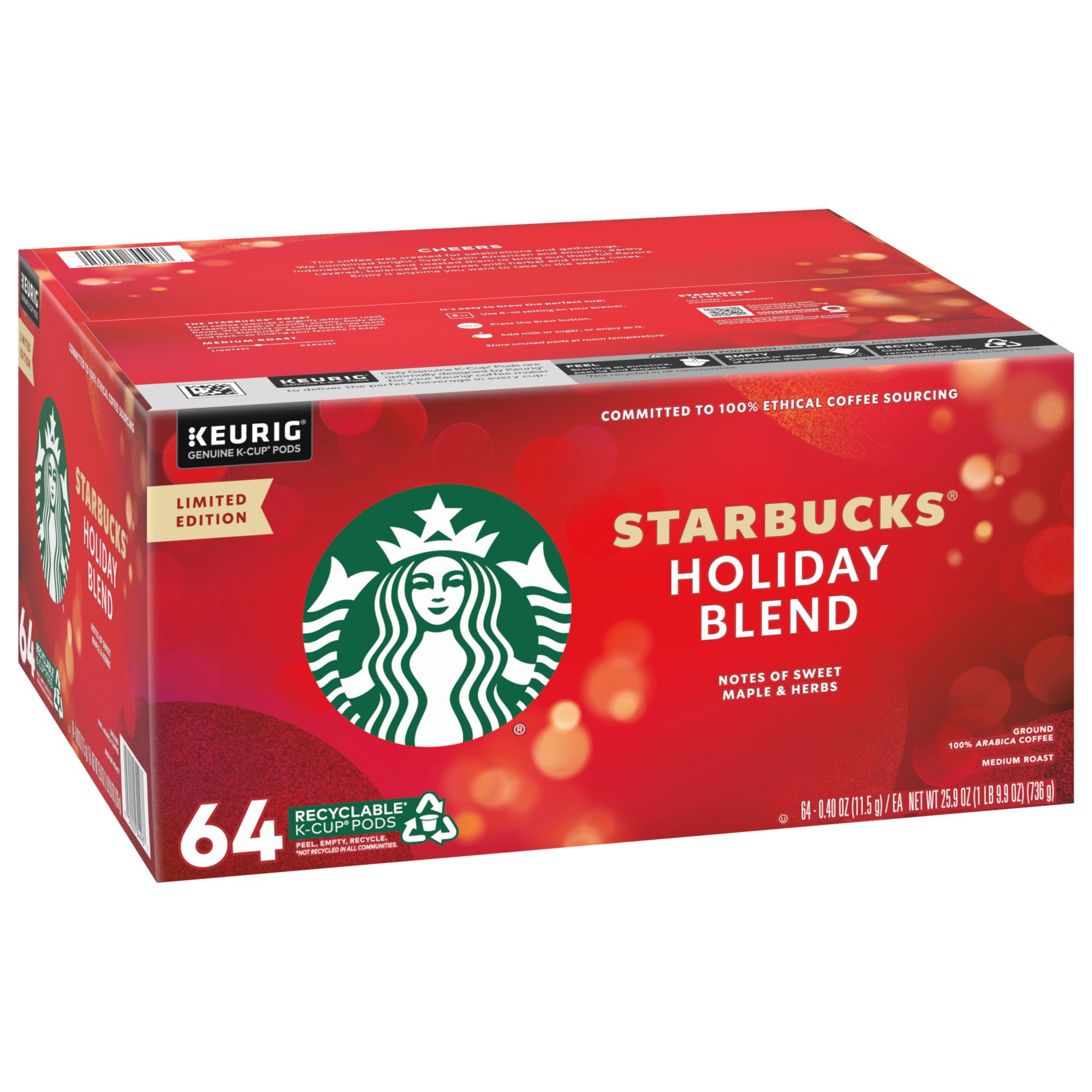 Premium coffee in a K-cup pod: Invite joy into your holiday with Starbucks Holiday Blend Medium Roast Coffee—bring home the holiday gift everyone loves with this 64-count box of K-Cup pods.