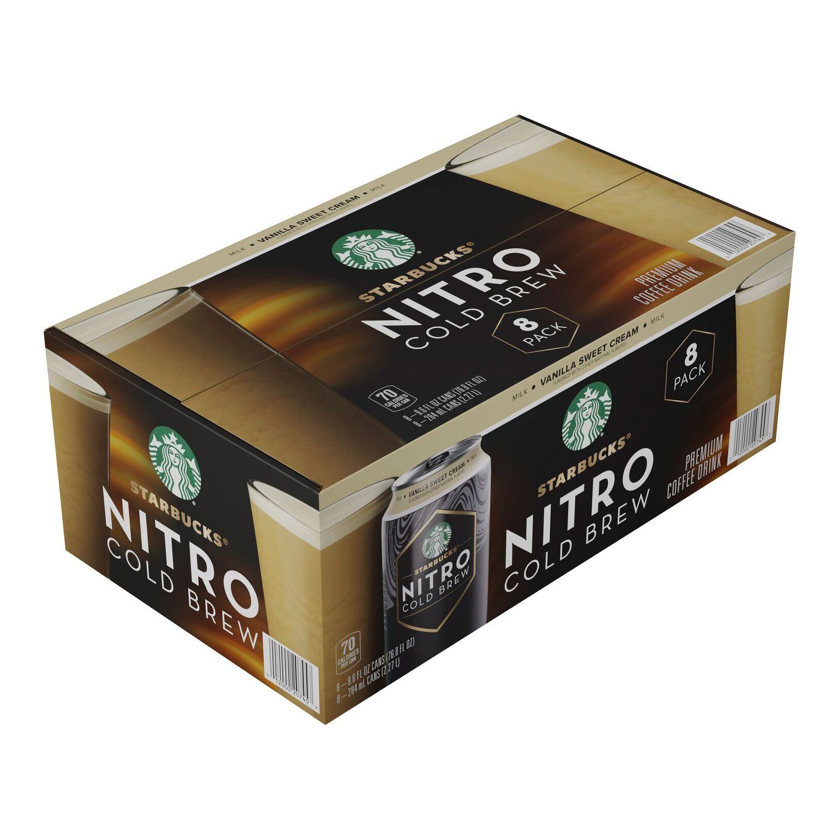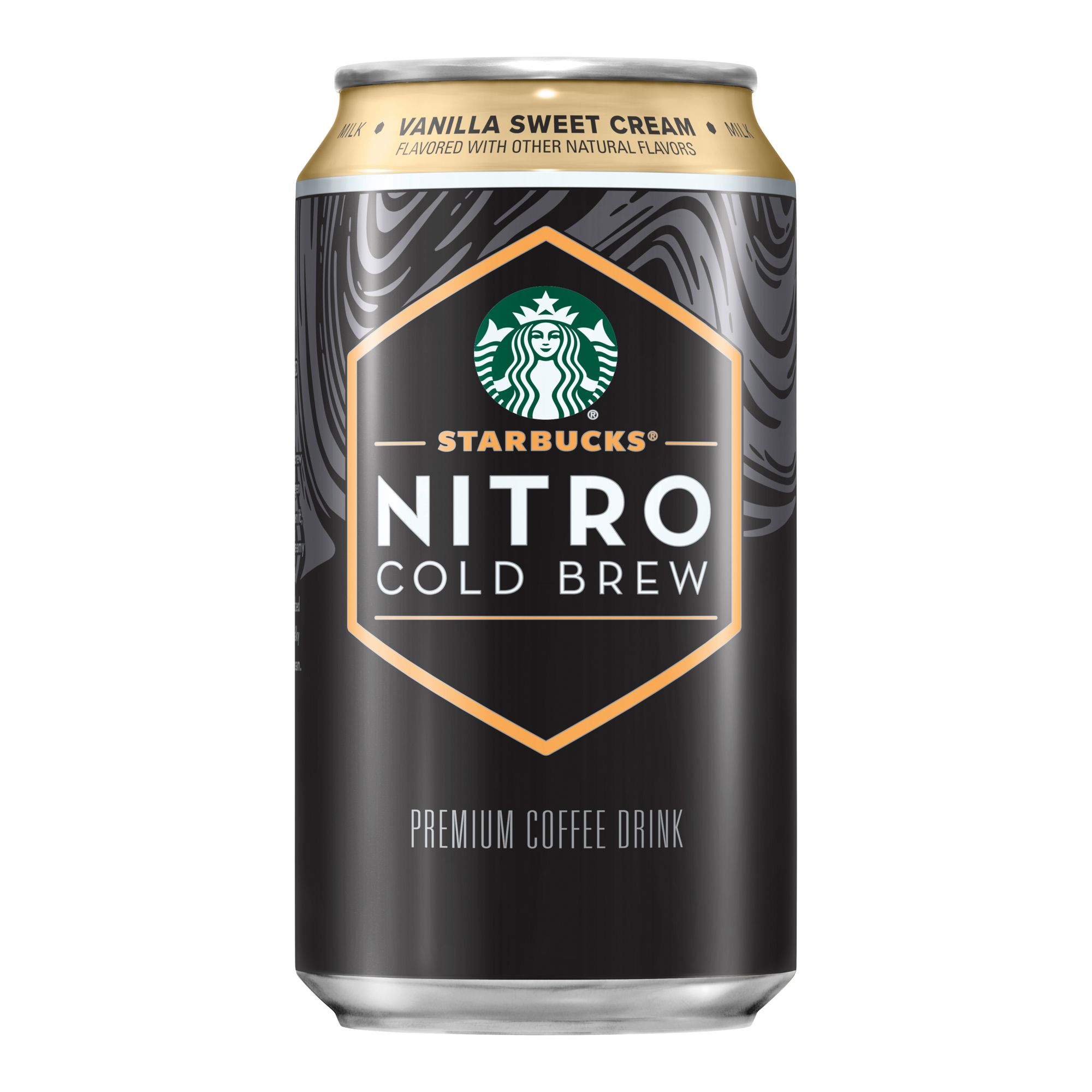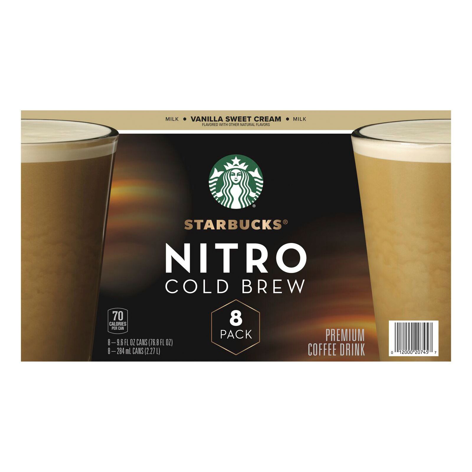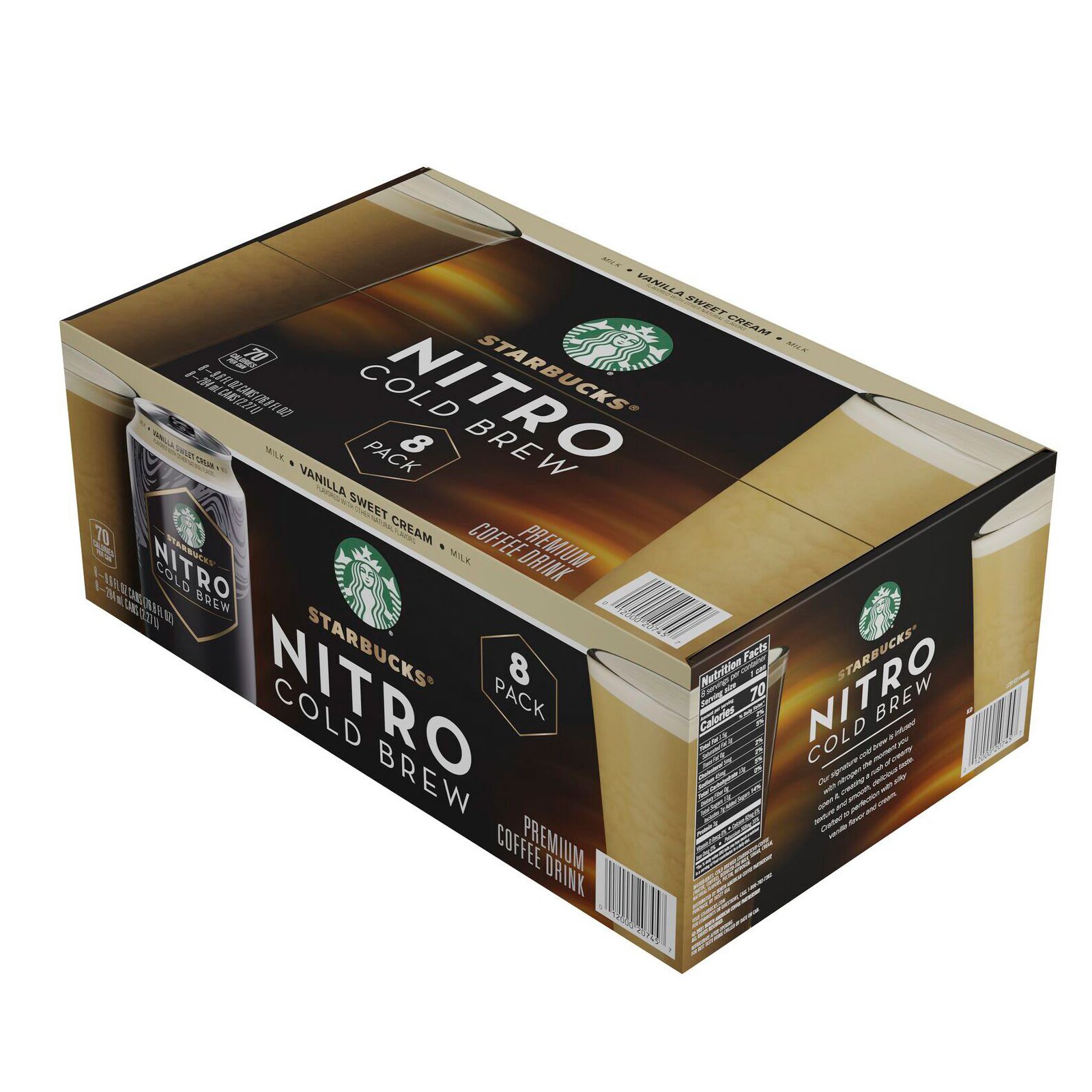 The cold brew coffee is infused with nitrogen the moment you open it, creating a rush of creamy texture and velvety smooth taste Gently tilt the can once, pop open, and pour into a cold glass for maximum enjoyment. Enjoy cold Smooth. Velvety. Delicious. Nitro cold brew Vanilla sweet cream flavor Includes eight 9.6 fl. oz. cans of Starbucks nitro cold brew coffee drink vanilla sweet cream flavor