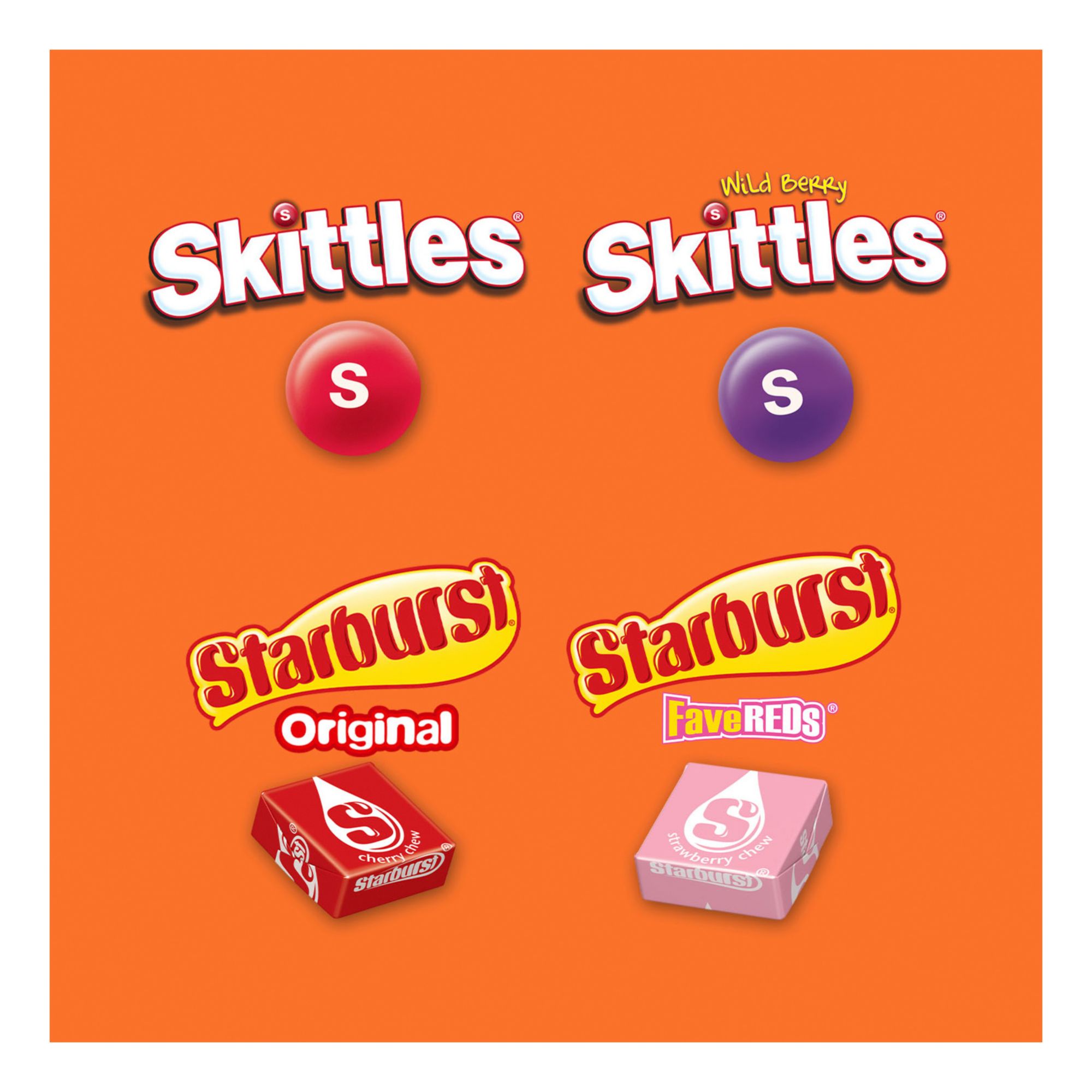 Features Skittles Original, Skittles Wild Berry, Starburst Original and Starburst FaveReds Candy