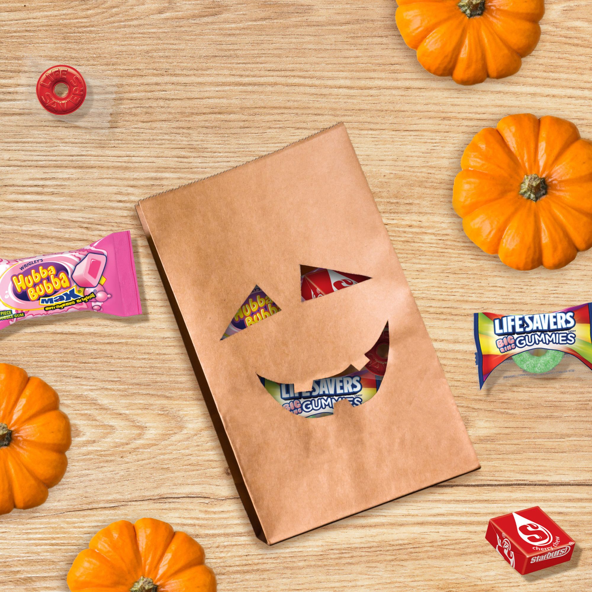 Use this 4.29-pound nut free bulk candy bag of Starburst Original, Life Savers, Hubba Bubba Max, and Life Savers Gummies Big Ring Halloween Candy to fill the boo bags of your trick or treat visitors
