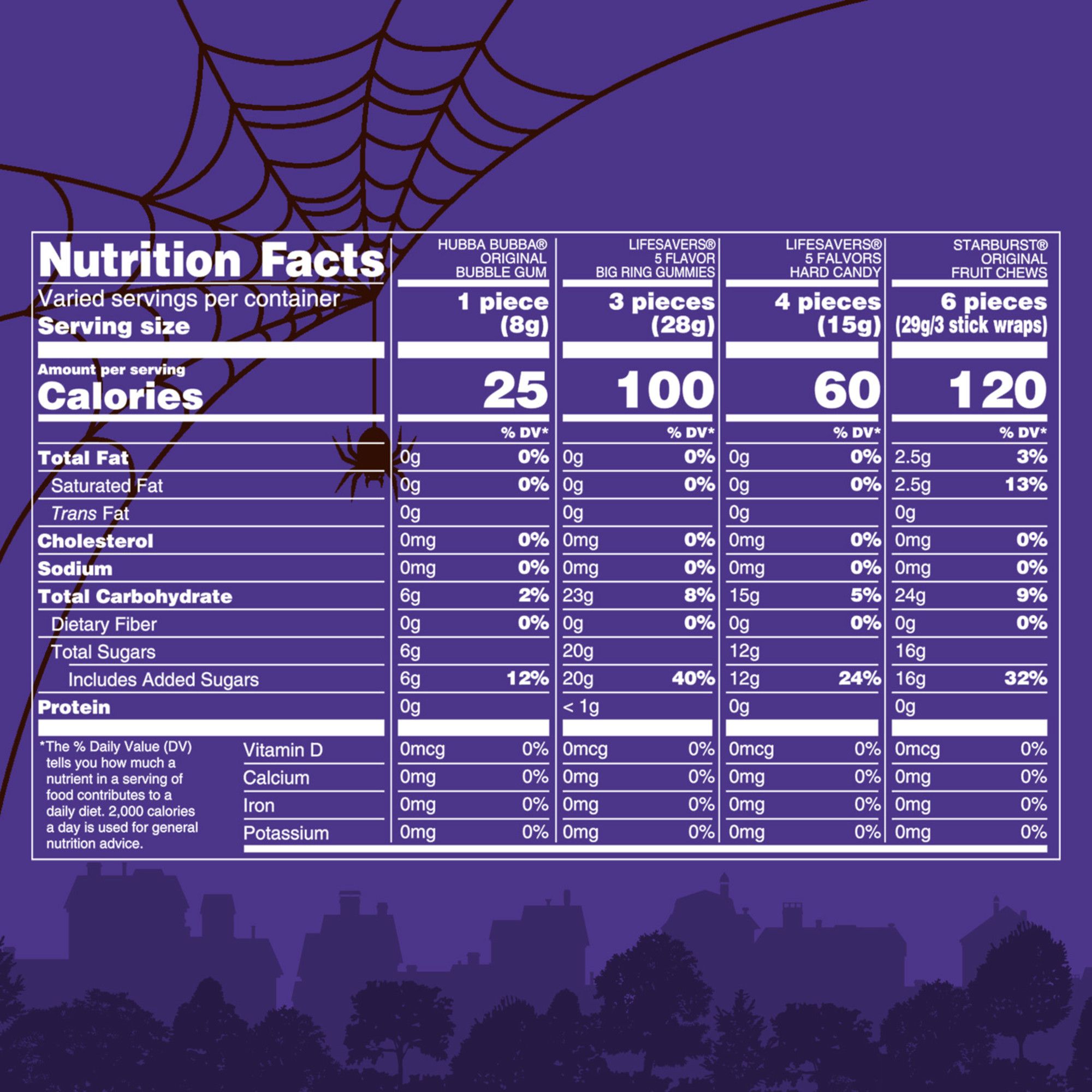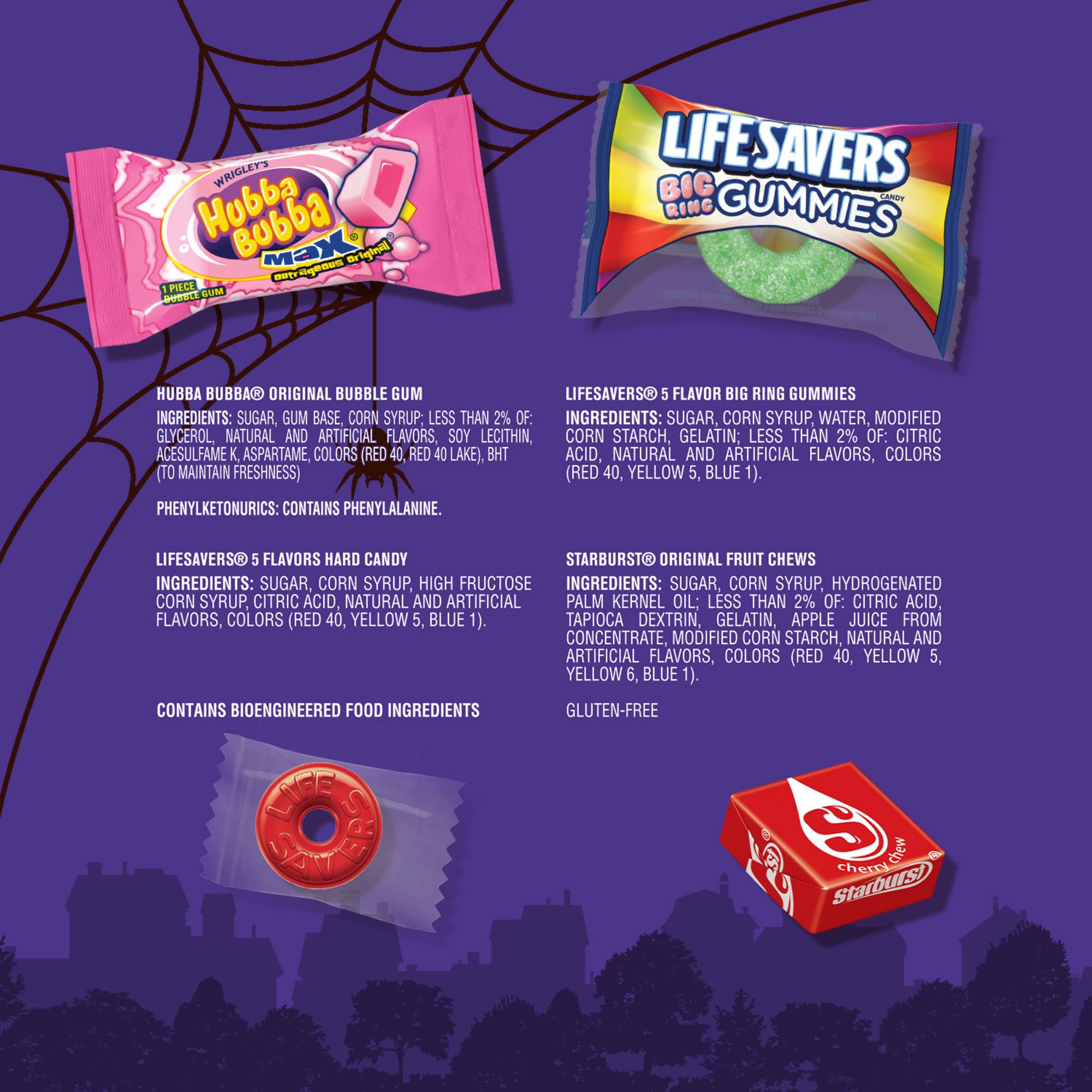 Ingredients: Hubba Bubba Original Bubble Gum Ingredients: Sugar, Gum Base, Corn Syrup; Less Than 2% Of: Glycerol, Natural And Artificial Flavors, Soy Lecithin, Acesulfame K, Aspartame, Colors (Red 40, Red 40 Lake), Bht (To Maintain Freshness) - Lifesavers 5 Flavor Big Ring Gummies Ingredients: Sugar, Corn Syrup, Water, Modified Corn Starch, Gelatin; Less Than 2% Of: Citric Acid, Natural And Artificial Flavors, Colors (Red 40, Yellow 5, Blue 1). - Lifesavers 5 Flavors Hard Candy Ingredients: Sugar, Corn Syrup, High Fructose Corn Syrup, Citric Acid, Natural And Artificial Flavors, Colors (Red 40, Yellow 5, Blue 1). - Starburst Original Fruit Chews Ingredients: Sugar, Corn Syrup, Hydrogenated Palm Kernel Oil; Less Than 2% Of: Citric Acid, Tapioca Dextrin, Gelatin, Apple Juice From Concentrate, Modified Corn Starch, Natural And Artificial Flavors, Colors (Red 40, Yellow 5, Yellow 6, Blue 1).