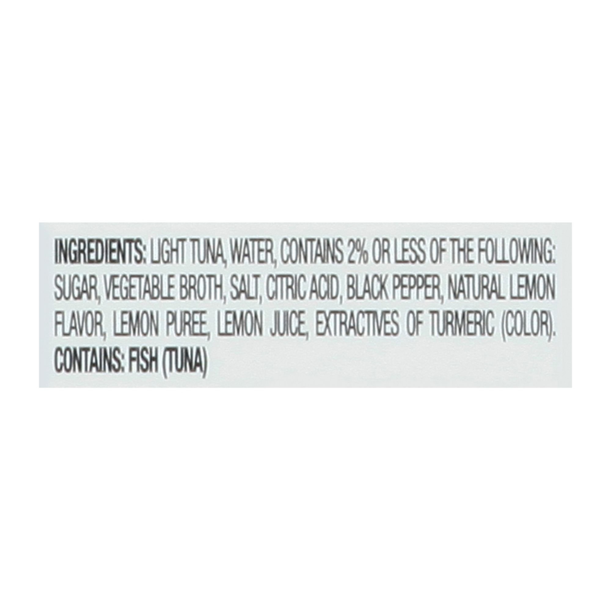 Ingredients: Light Tuna Water, Contains 2% or Less of the Following: Sugar, Vegetable Broth, Salt, Citric Acid, Black Pepper, Natural Lemon Flavor, Lemon Puree, Lemon Juice, Extractives of Turmeric (Color).