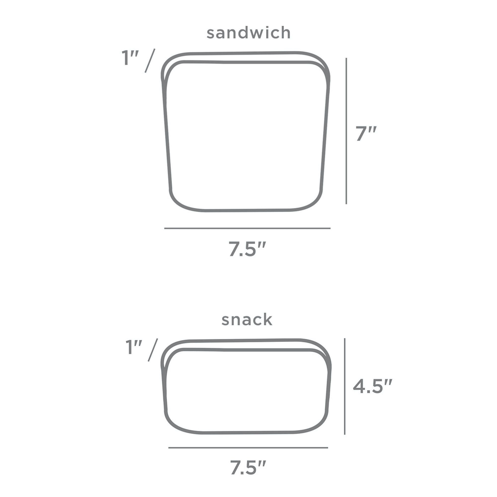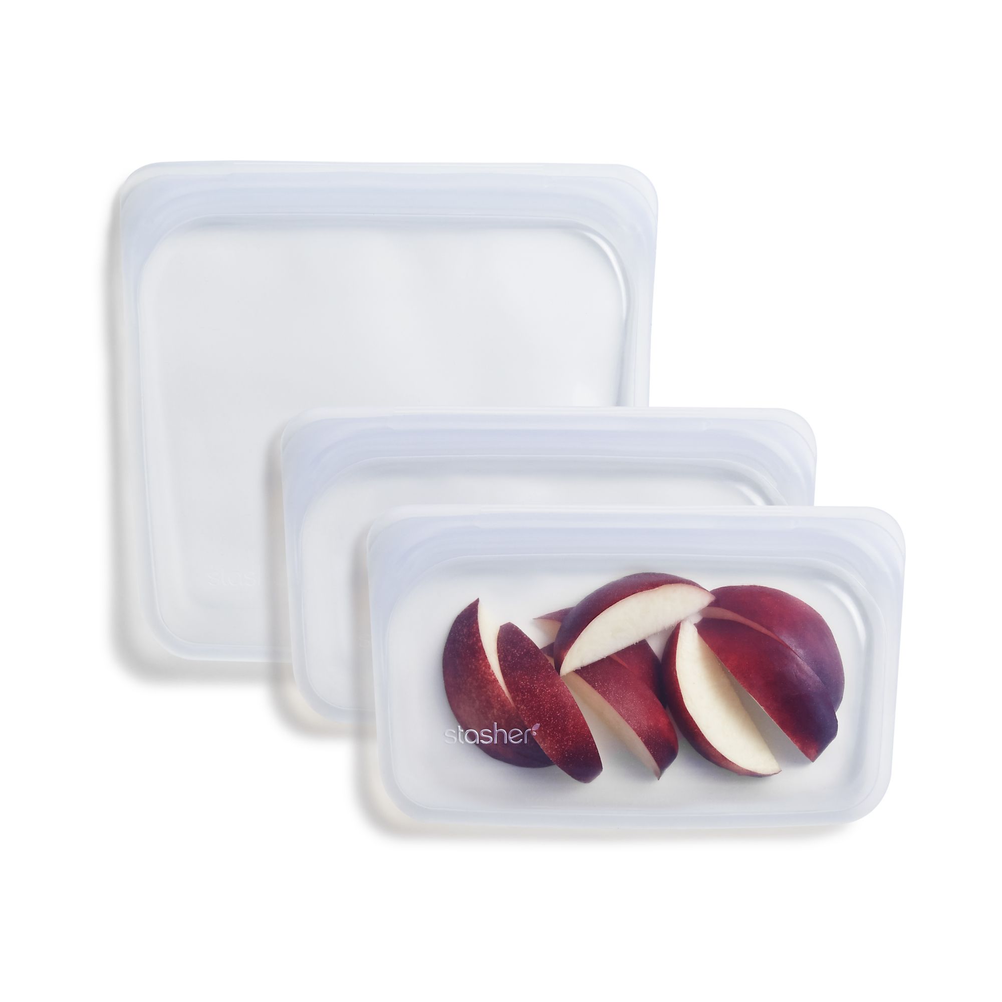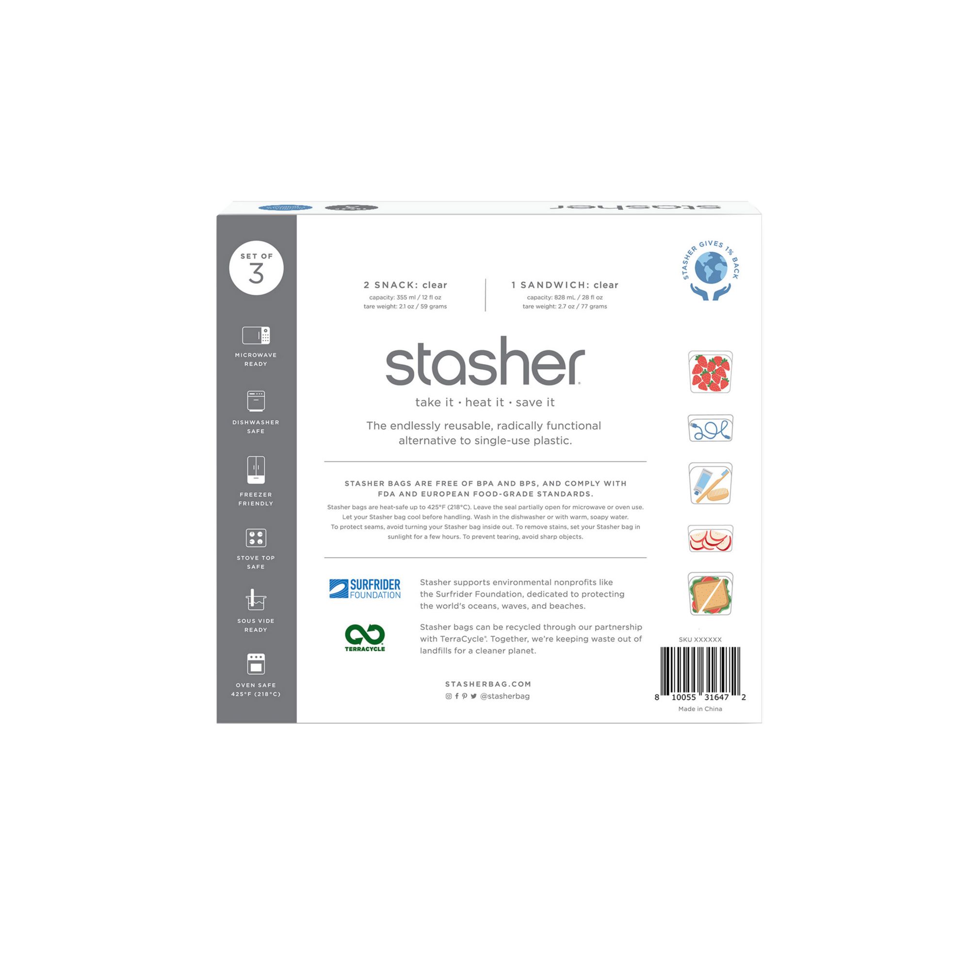 This 3 pk. of one Sandwich Stasher bag and two Snack Stasher bags is the ideal trio for a sandwich and snacks, travel necessities and purse organization, and even laptop cords and portable phone chargers. The Sandwich Stasher bag is the size that started it all - ideal for sandwiches, personal care products, and more. The Snack Stasher bag is the perfect reusable container for bite-sized food, travel and home organization. Fill with trail mix, paper clips, pet treats, or anything worth keeping neat and dry. Plus, Stasher bags are dishwasher, microwave, and oven safe up to 425°. Made of pure platinum food-grade silicone, Stasher silicone bags contain no harmful chemicals and can be used as reusable freezer bags or as sous vide bags. Prep meals and take your snacks or lunch with you to school, work, or the gym. A reusable everyday essential for the kitchen and life on the go.