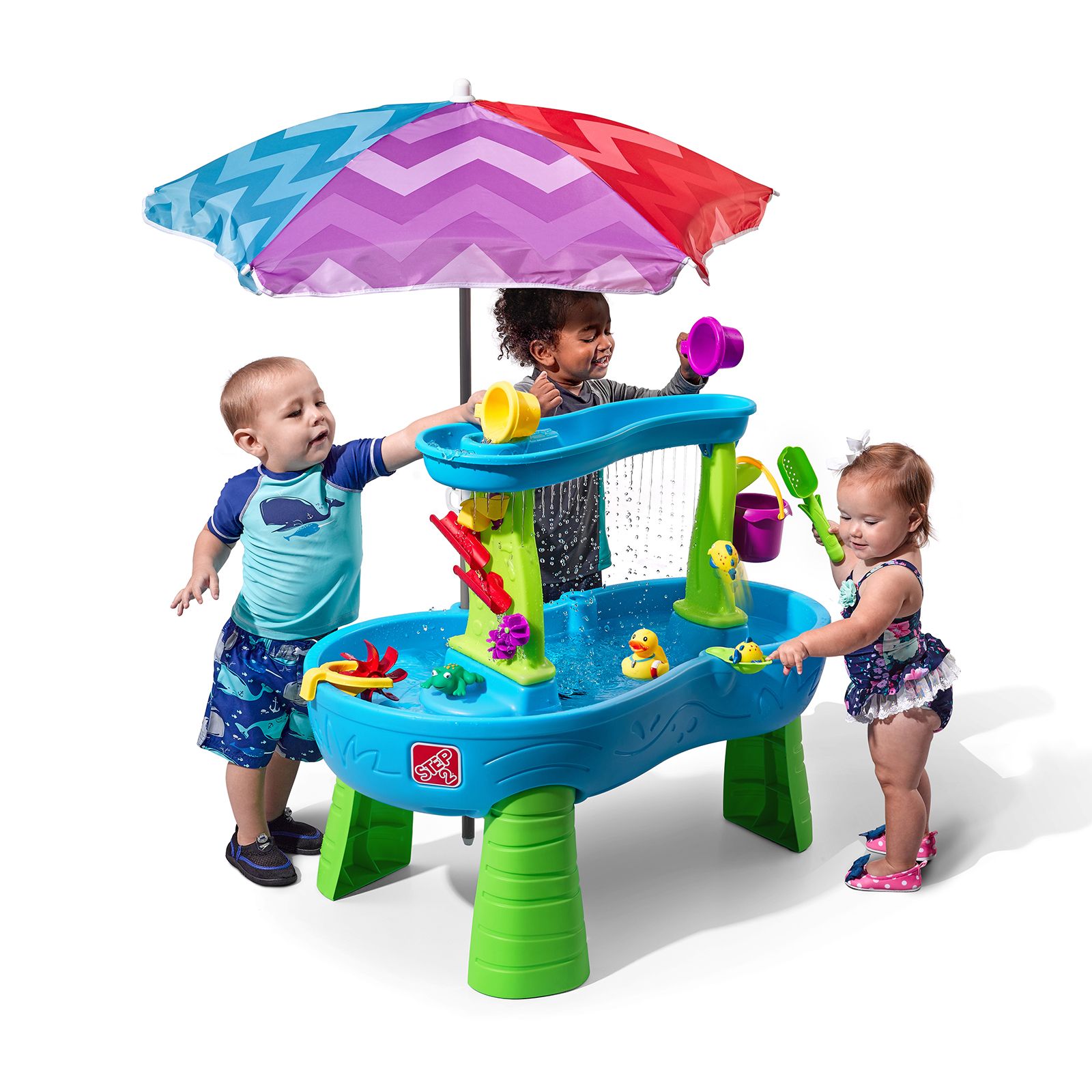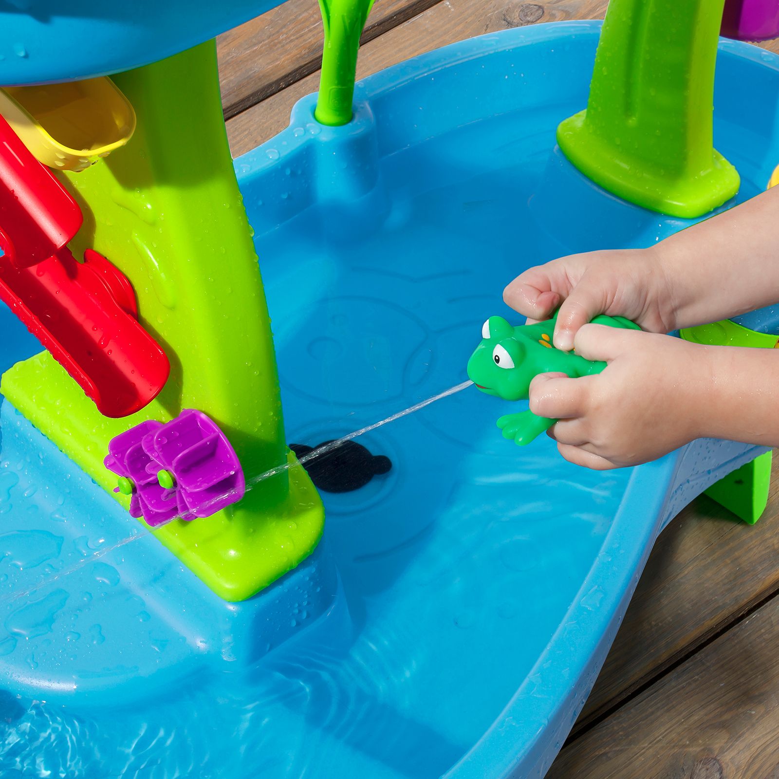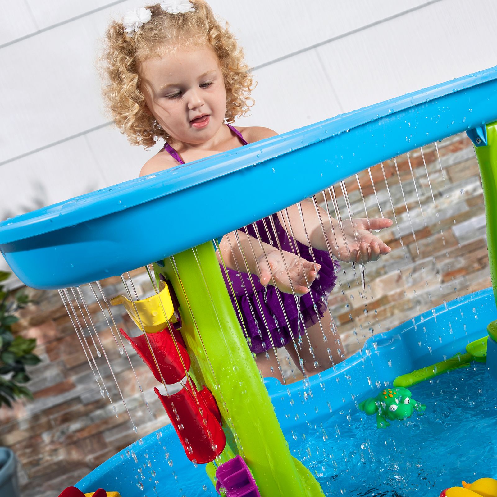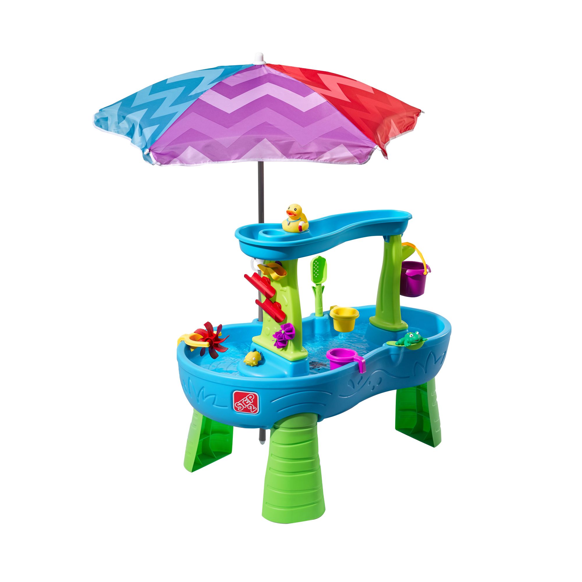 Use the large bucket to scoop up water from the pond and pour into the top tier to make a showering splash below Rain shower effect makes it sound like it’s real rainfall As the rainwater drizzles back into the pond, maze-like spinners, ramps and buckets will be activated, creating a cool cascade on the water wall Rearrange the put-and-place maze pieces again and again to create new waterfalls for fun cause-and-effect and STEM play Use the hand-held spinning wheel in the “rain” to make a spinning splash Use the side flipper to flip the figures back into the pond Catch the frog with the cattail scoop Large table platform lets multiple kids play together, great for social and interactive play Molded-in hole in back of table accommodates umbrella Includes rain showers splash pond with umbrella