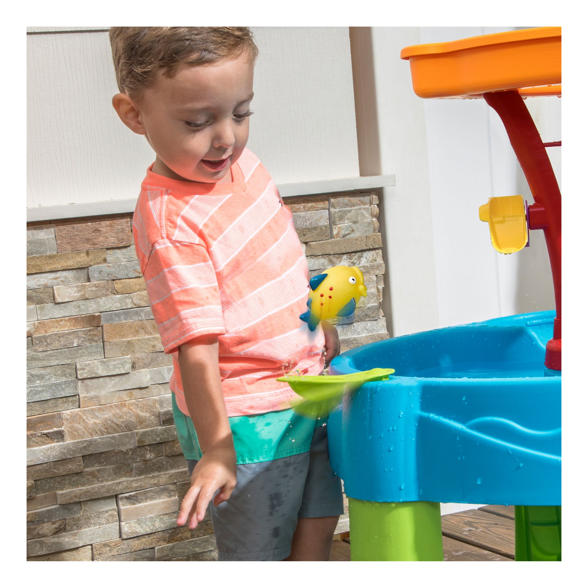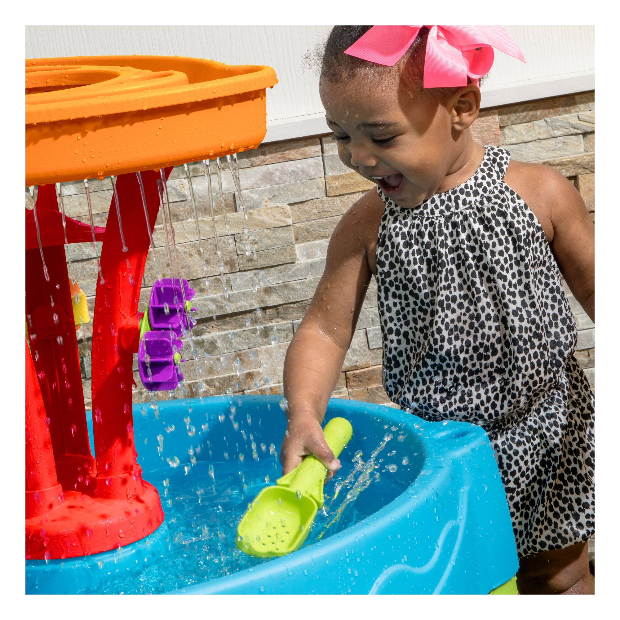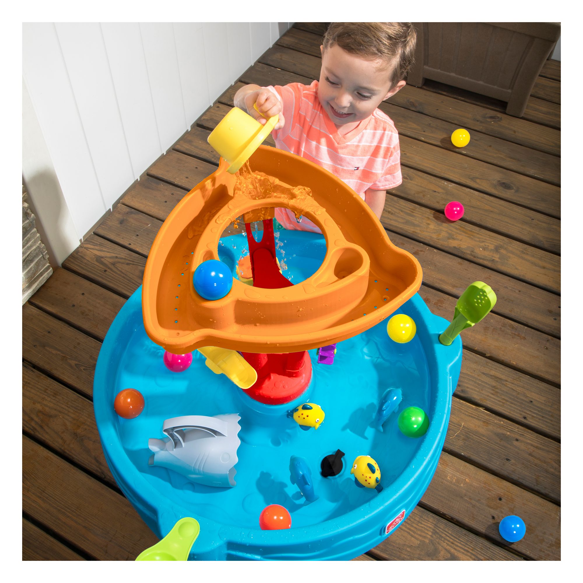 Get ready to have buckets of fun in your backyard with the Seaside Water Table by Step2. The 360° towering play table allows for a boatload of action, from ball play to swimming sea animals to waterfall effects. Just scoop up water from the pond and pour in the top tier to make a showering splash. Little ones can watch as the different put-and-place maze pieces create new waterfalls, a great way to use STEM play. From the assortment of ocean animal toys to a cat tail scoop, kids will have a ball with the included water table accessories. Made in USA of US and imported parts.