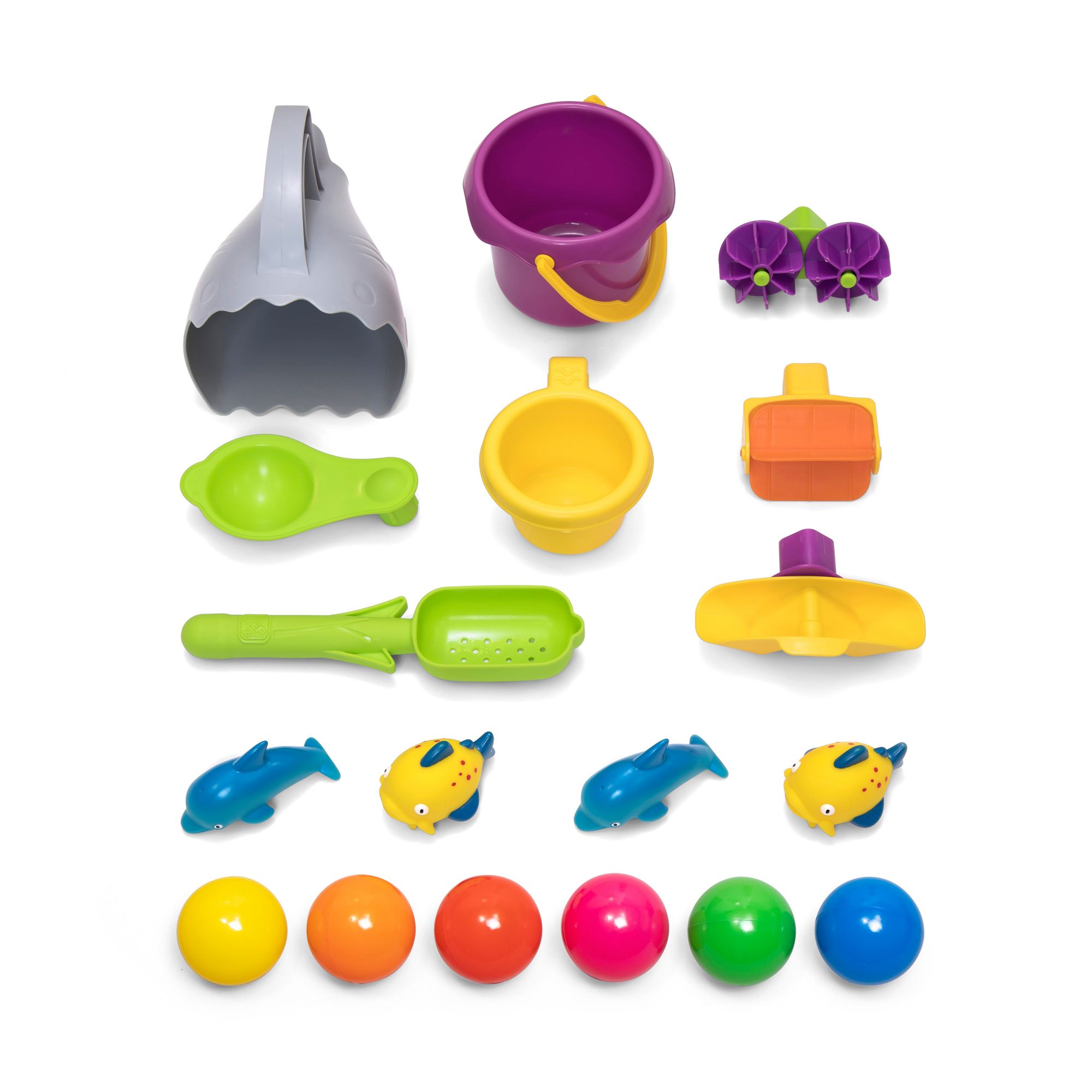 Includes water table base with legs, six play balls, cat tail scoop, bucket, cup, fish, and dolphin