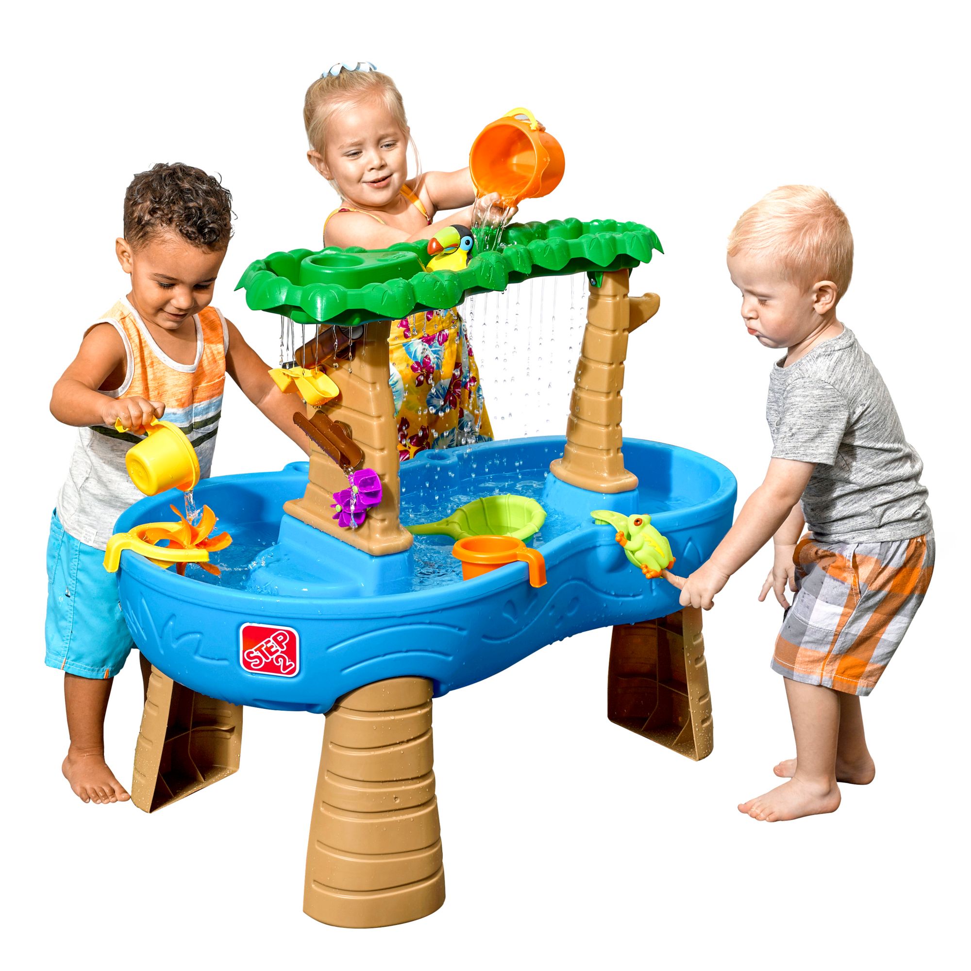 Rain shower effect from the treetop canopy makes realistic rainfall sounds Large footprint lets several kids play together, encouraging social and sharing skills Molded-in rainforest detail and jungle-themed critter toys spark kids' imaginations, taking water play to a new level of splish-splash fun Non-leak drain plug keeps water in the basin during play and allows for easy drainage when playtime fun is done Made EverTough, this outdoor water activity toy is uniquely indestructible, ready to outlast hours of playtime fun Water basin holds up to 5-gal. (18.92 L) of water Adult assembly required Includes water table base, rainforest canopy tray, and 13-piece accessory set featuring a tree-frog, toucan, and tropical fish squish toys