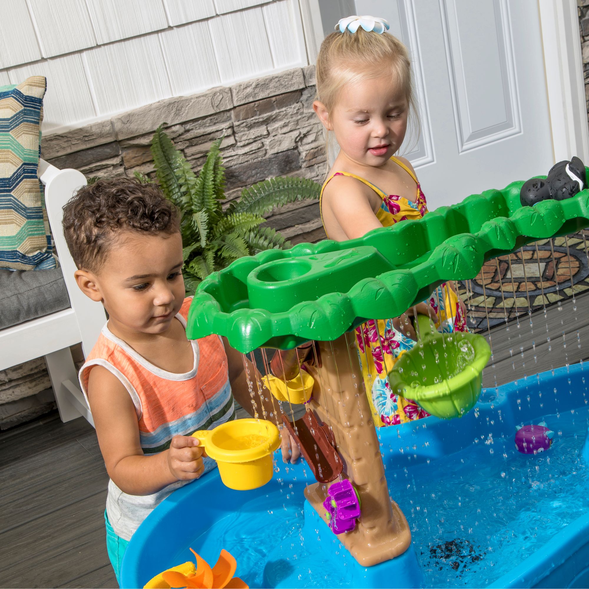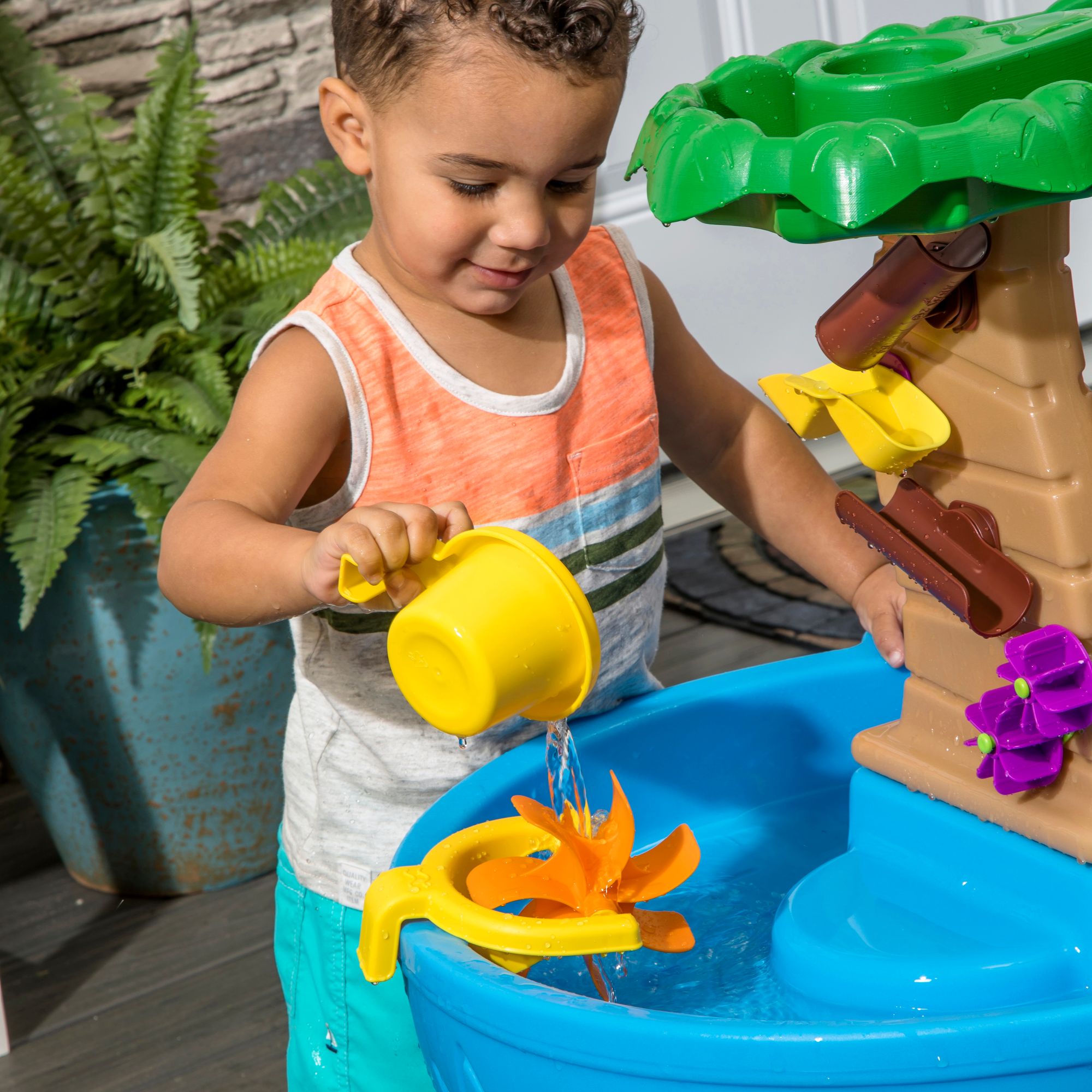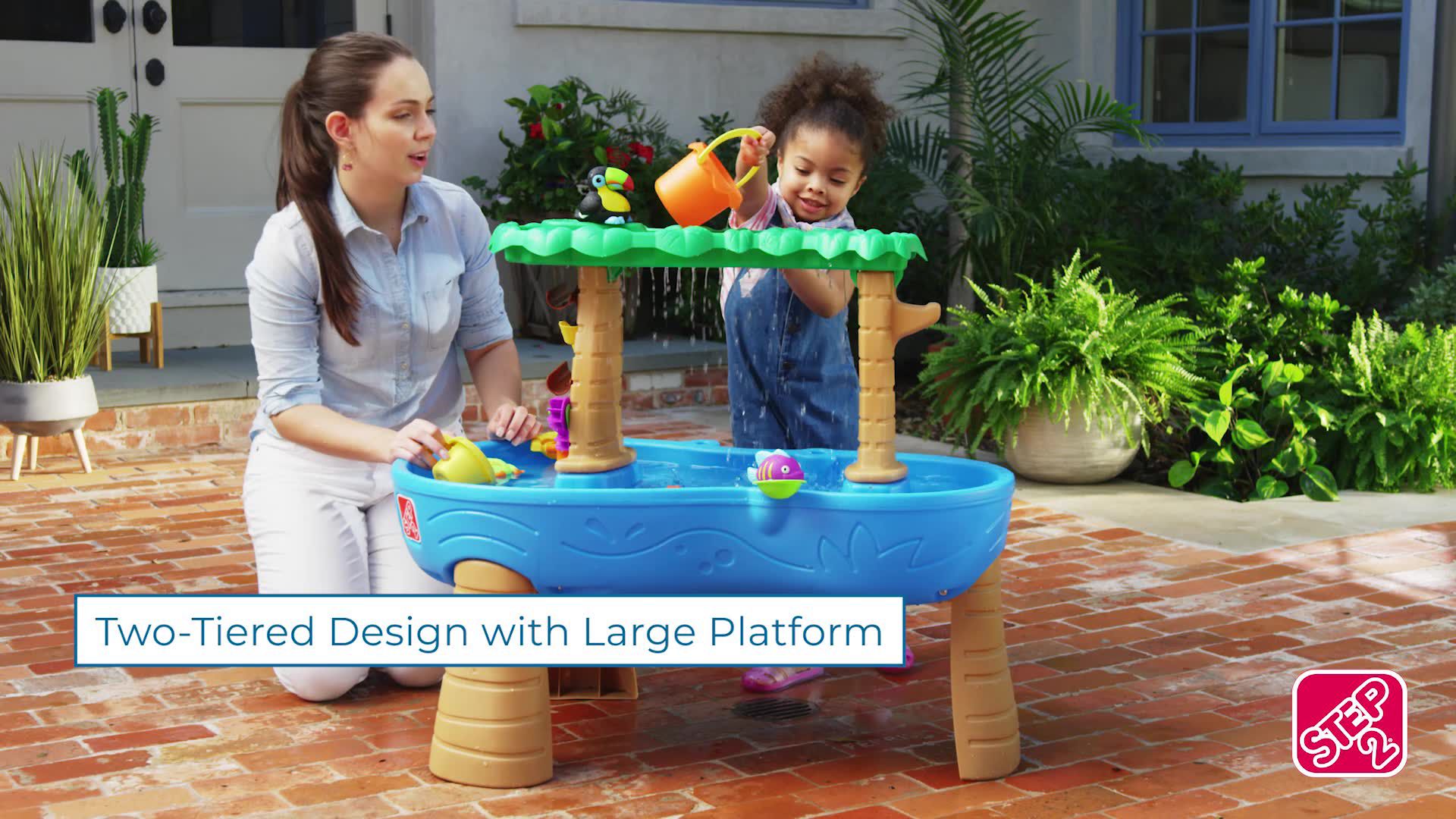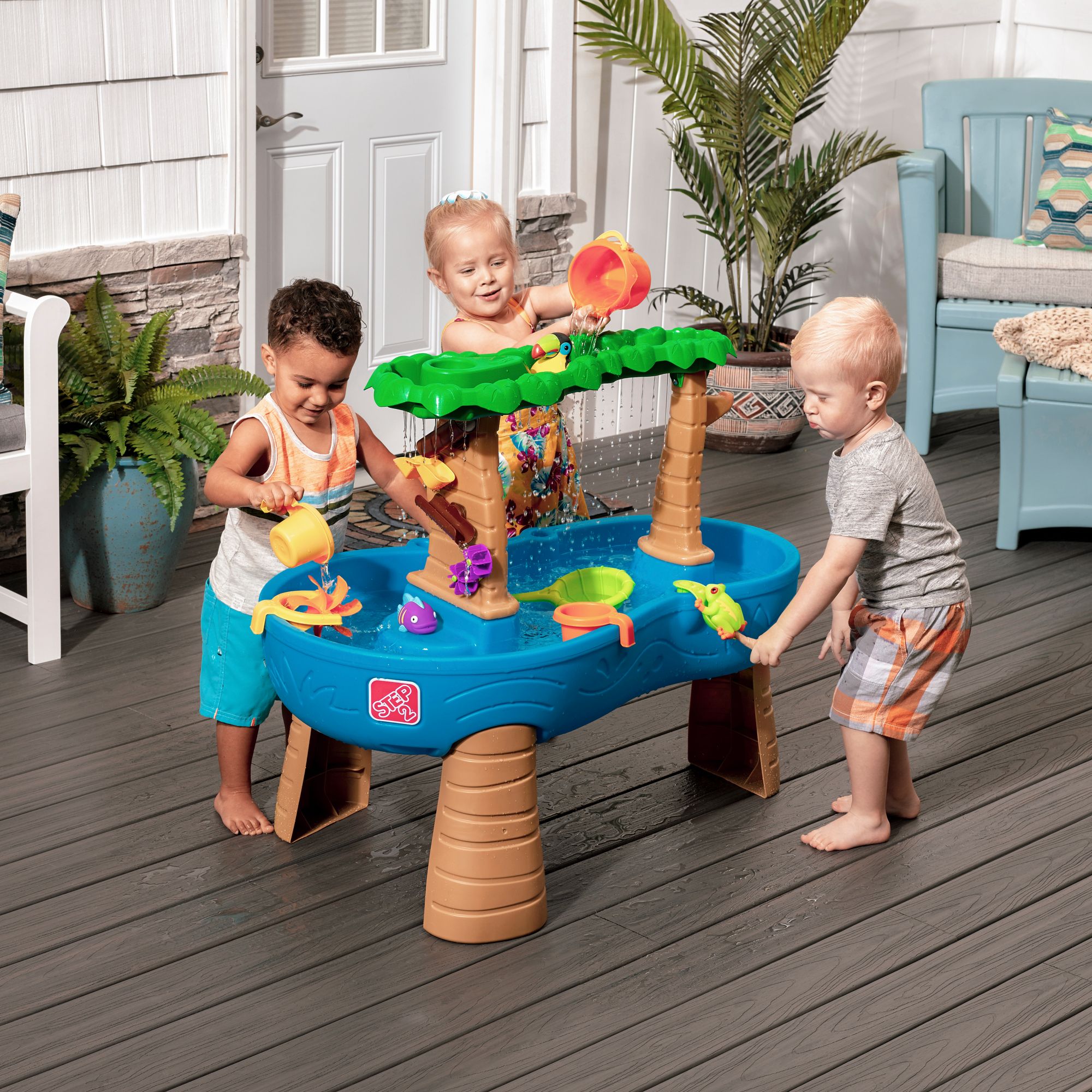 Turn your backyard into a tropical paradise with the Step2 Tropical Rainforest Water Table. The top tier of this jungle-themed toddler water table is styled as the rainforest canopy, creating a fun tropical experience. Little ones can use the large bucket scoop to pour water over the treetops, making it rain into the water basin below. Watch as the waterfall flows down the tree trunks to activate the put-and-place water maze spinner and teeter-totter, teaching cause and effect principles through play. This large water play table for toddlers also features a spacious design, allowing multiple kids to play together to practice sharing and taking turns.