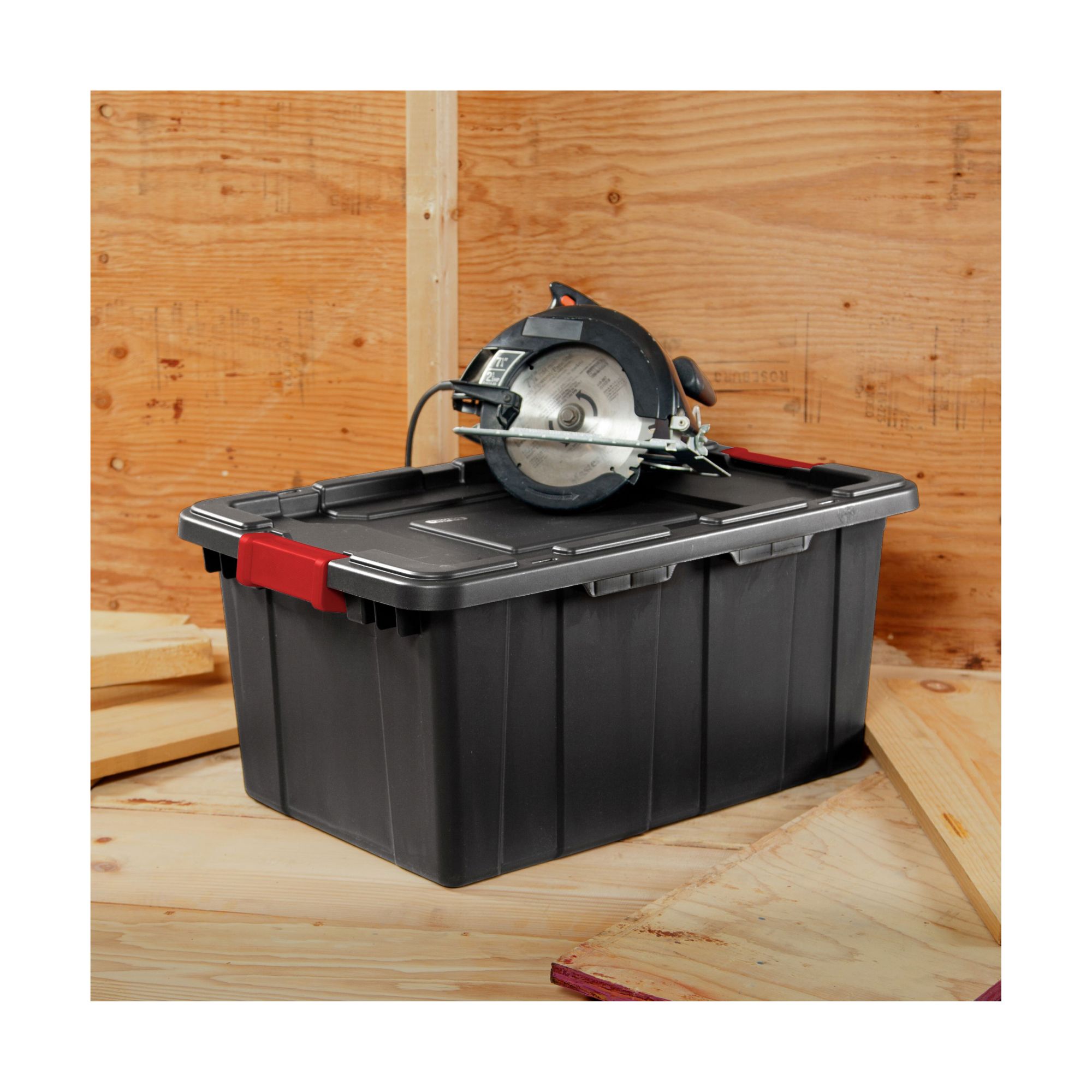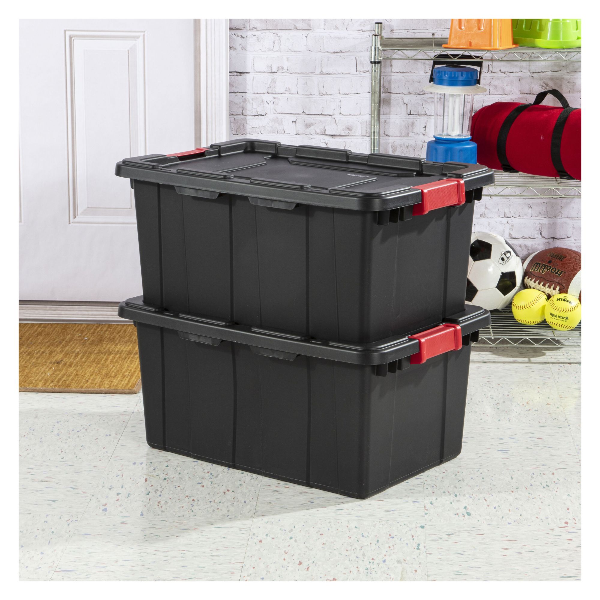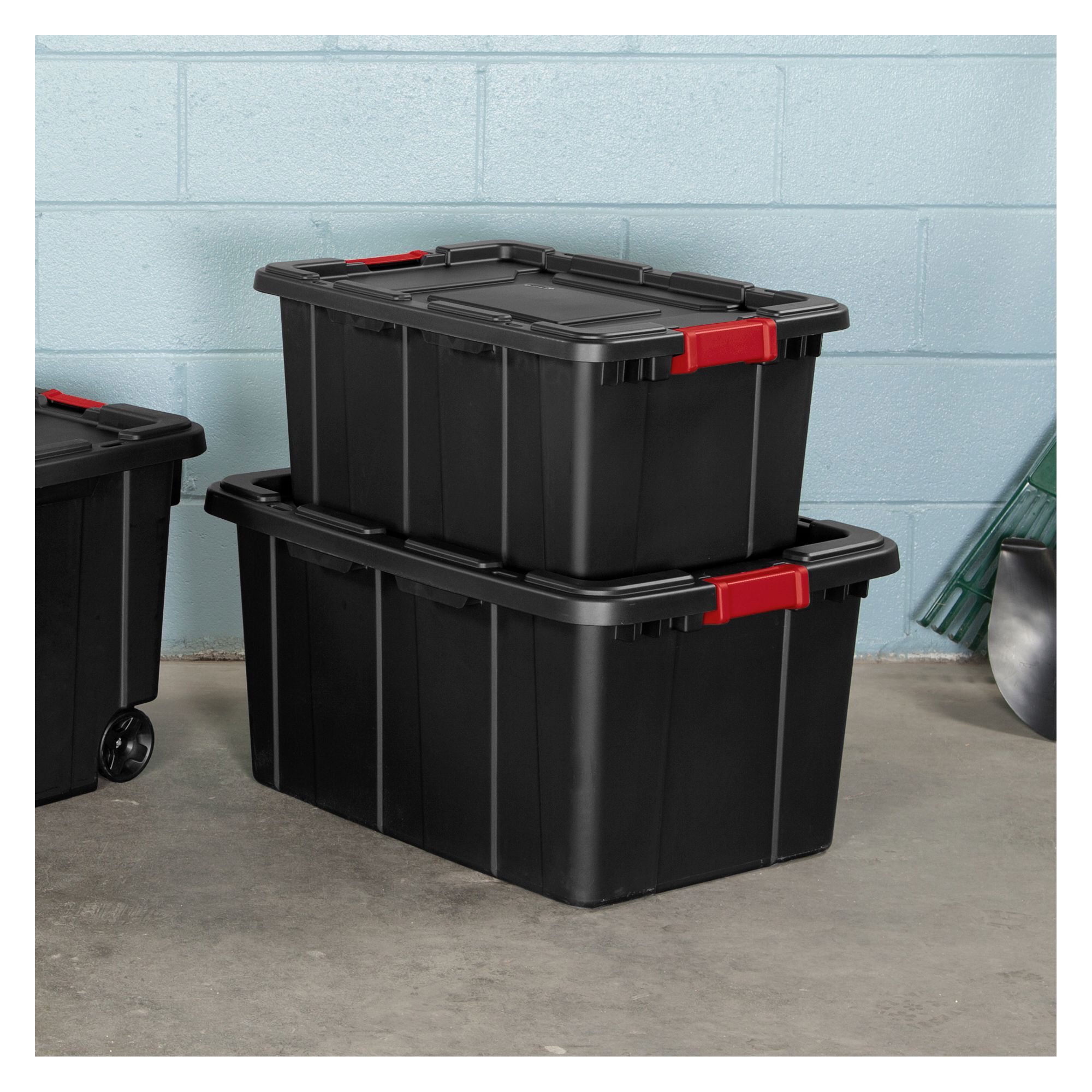 Bring order to garages, basements, and attics with the rugged design and unique features of Sterilite’s Industrial Tote line. Be confident that stored items will stay protected in the durable 15-gallon industrial tote, even when on the go. The grooved lid design and keyholes provide options for tie-downs to simplify transportation and keep totes in place in the back of a pick-up truck. The innovative drip-resistant lid provides maximum protection against items getting wet, while the tight-fit lid keeps items contained. The robust latches offer extra security that the lid will stay attached to the base, and the textured surface makes for a sure grip when carrying. The deep recessed lids provide stability when stacking for efficient use of storage space. Channeled walls provide added strength and help to resist crushing under heavier loads. The 15 Gallon Industrial Tote is ideal for more active storage needs, storing gardening supplies, sports gear, tools and more.
