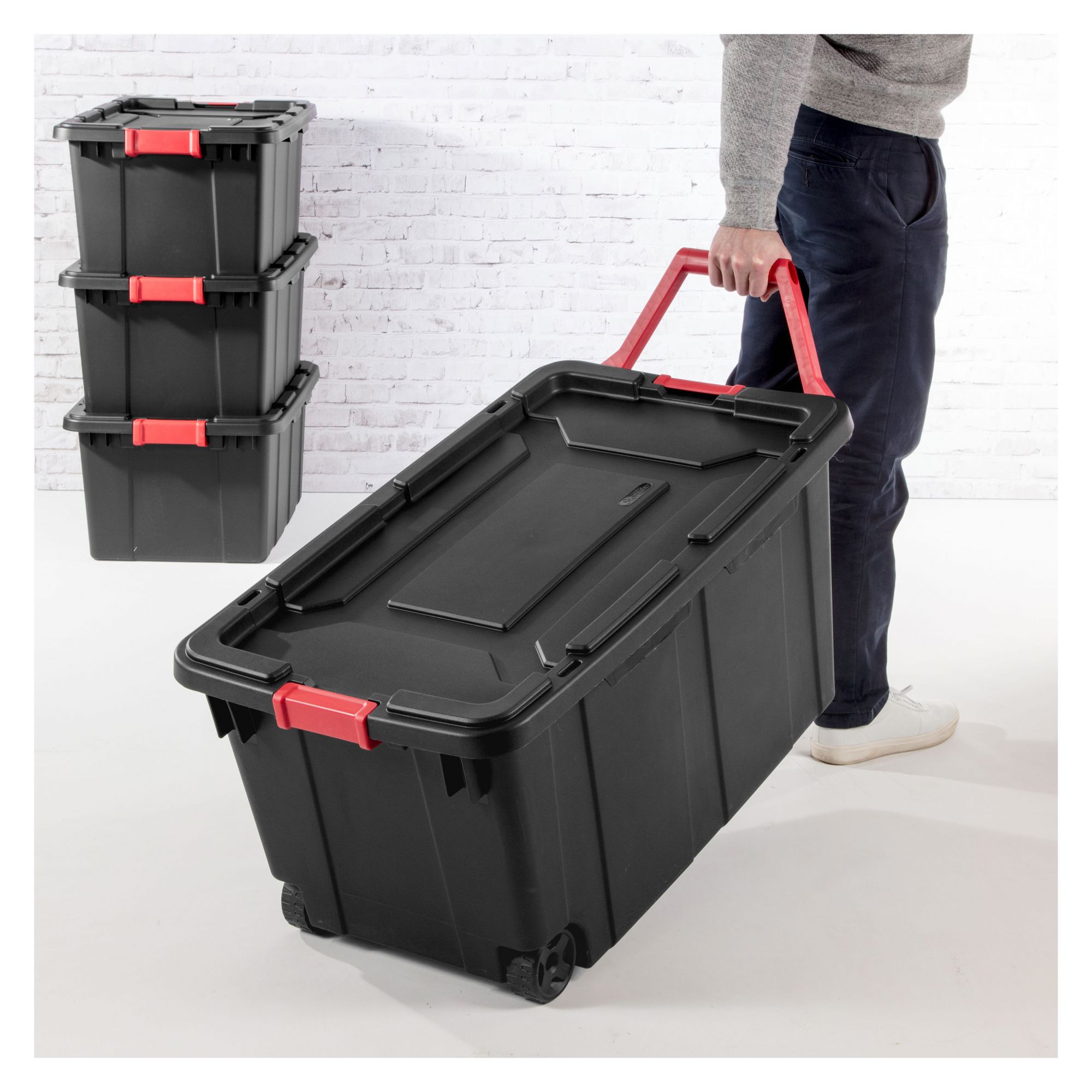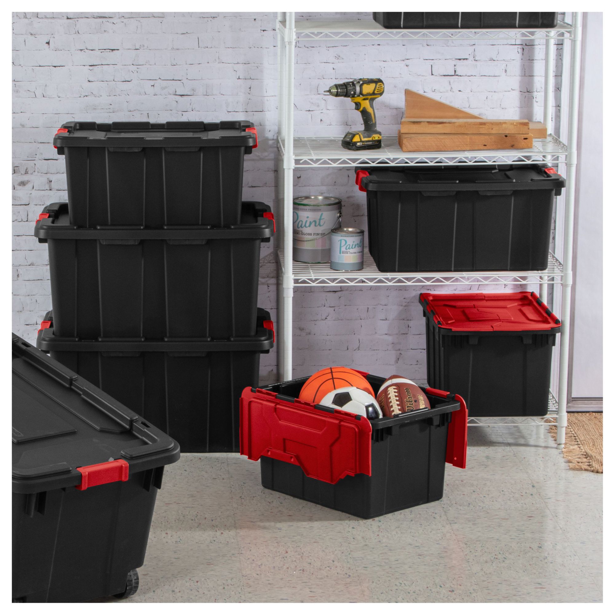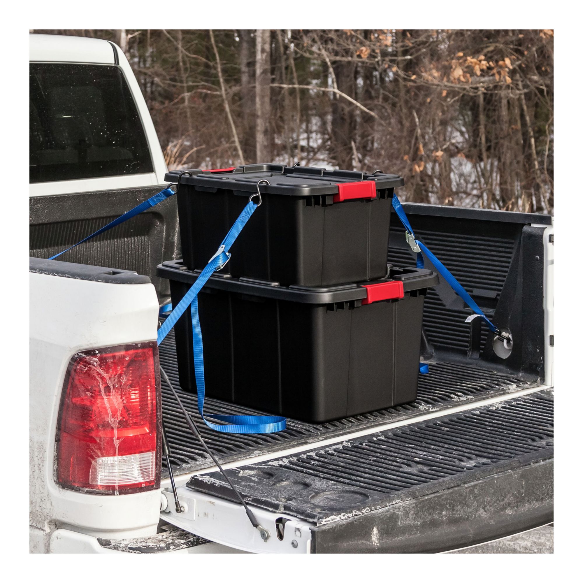 Bring order to garages, basements, and attics with the rugged design and unique features of Sterilite’s Industrial Tote line. Be confident that stored items will stay protected in the durable 15-gallon industrial tote, even when on the go. The grooved lid design and keyholes provide options for tie-downs to simplify transportation and keep totes in place in the back of a pick-up truck. The innovative drip-resistant lid provides maximum protection against items getting wet, while the tight-fit lid keeps items contained. The robust latches offer extra security that the lid will stay attached to the base, and the textured surface makes for a sure grip when carrying. The deep recessed lids provide stability when stacking for efficient use of storage space. Channeled walls provide added strength and help to resist crushing under heavier loads. The 15 Gallon Industrial Tote is ideal for more active storage needs, storing gardening supplies, sports gear, tools and more.