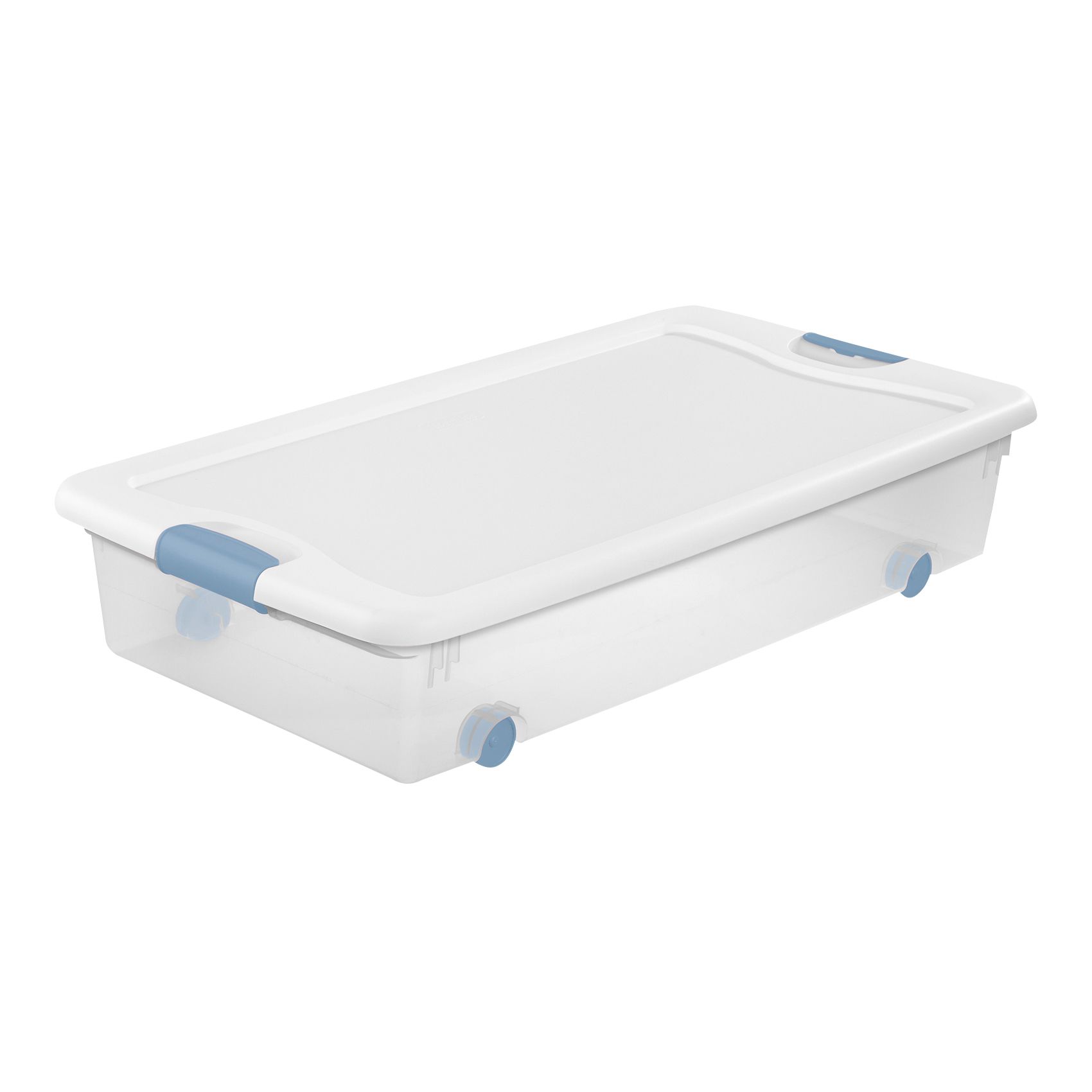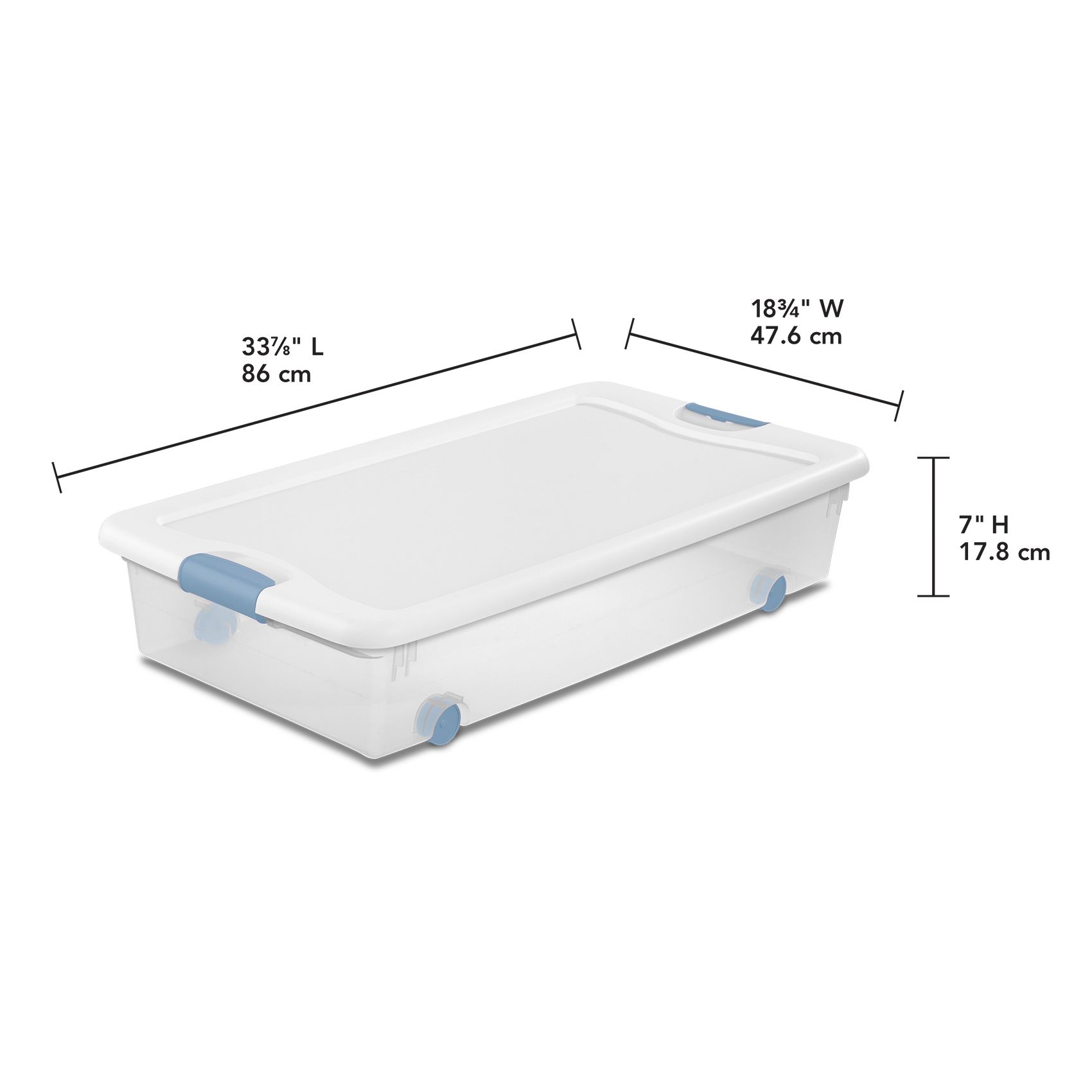 Need help getting organized? Step up to the Sterilite 56 Quart Wheeled Latching Box, featuring a modern space saving shape and an innovative hinging lid. Simply undo one latch and lift the lid for easy access, all with one hand. The other latch stays attached and acts as a hinge, even when the lid is opened all of the way. Better yet, the smooth gliding wheels allow this Latching Box to be easily slid out from storage beneath a bed. The 56 Quart Wheeled Latching box is the perfect solution for taking back control of your bedroom and organizing blankets, sweaters, and extra shoes. The recessed lids allow same size storage boxes to stack neatly on top of each other to use vertical storage space efficiently. The 56 Qt and 106 Qt Latching Boxes use the same lid, allowing both the shallow and deep sizes to be stacked in same footprint. The overall assembled dimensions of this item are 33 7/8" L x 18 3/4" W x 7" H.