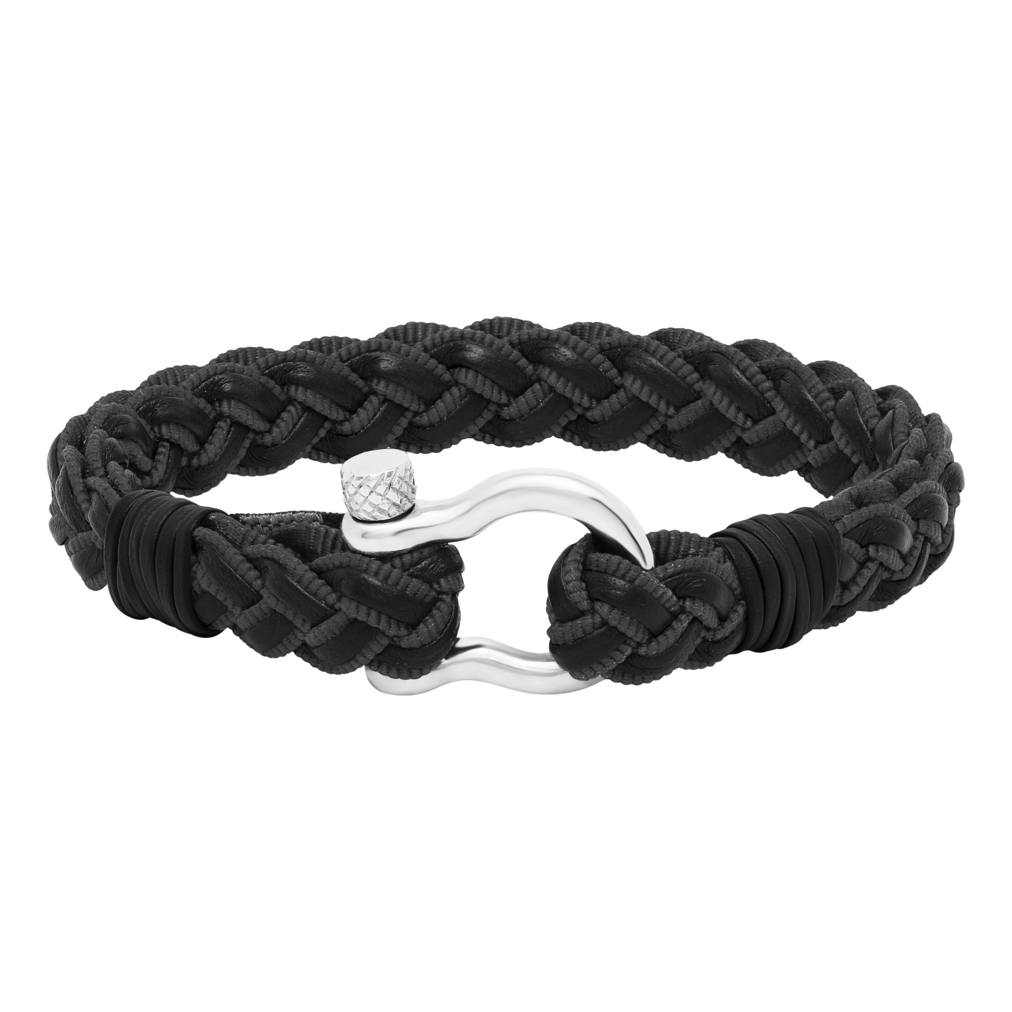 Sterling Silver Shackle Bracelet with Black Braided Leather