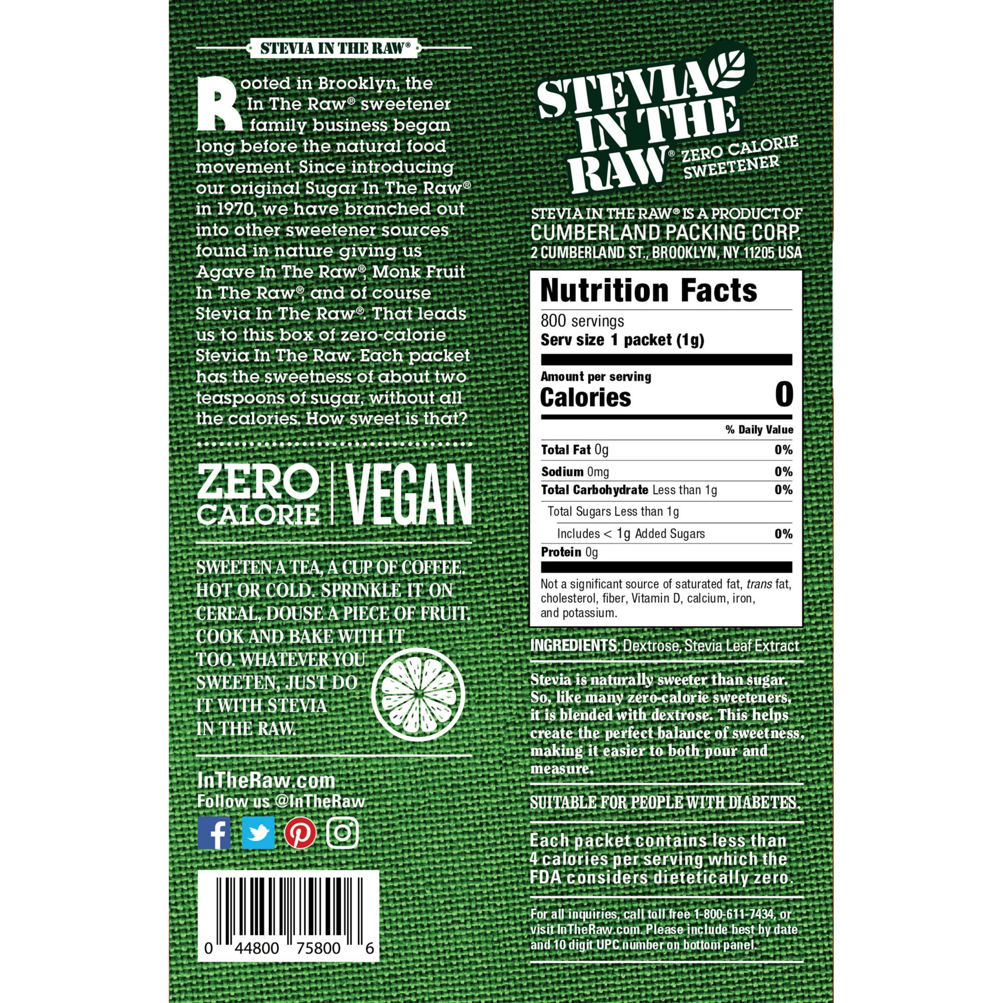 Enjoy your sweet moments with Stevia In The Raw zero-calorie sweetener. It's an extract from the sweet leaves of the stevia plant, and the delicious flavor comes without any calories. Sweeten a tea, hot or cold, sprinkle it on cereal and bake and cook with it too.