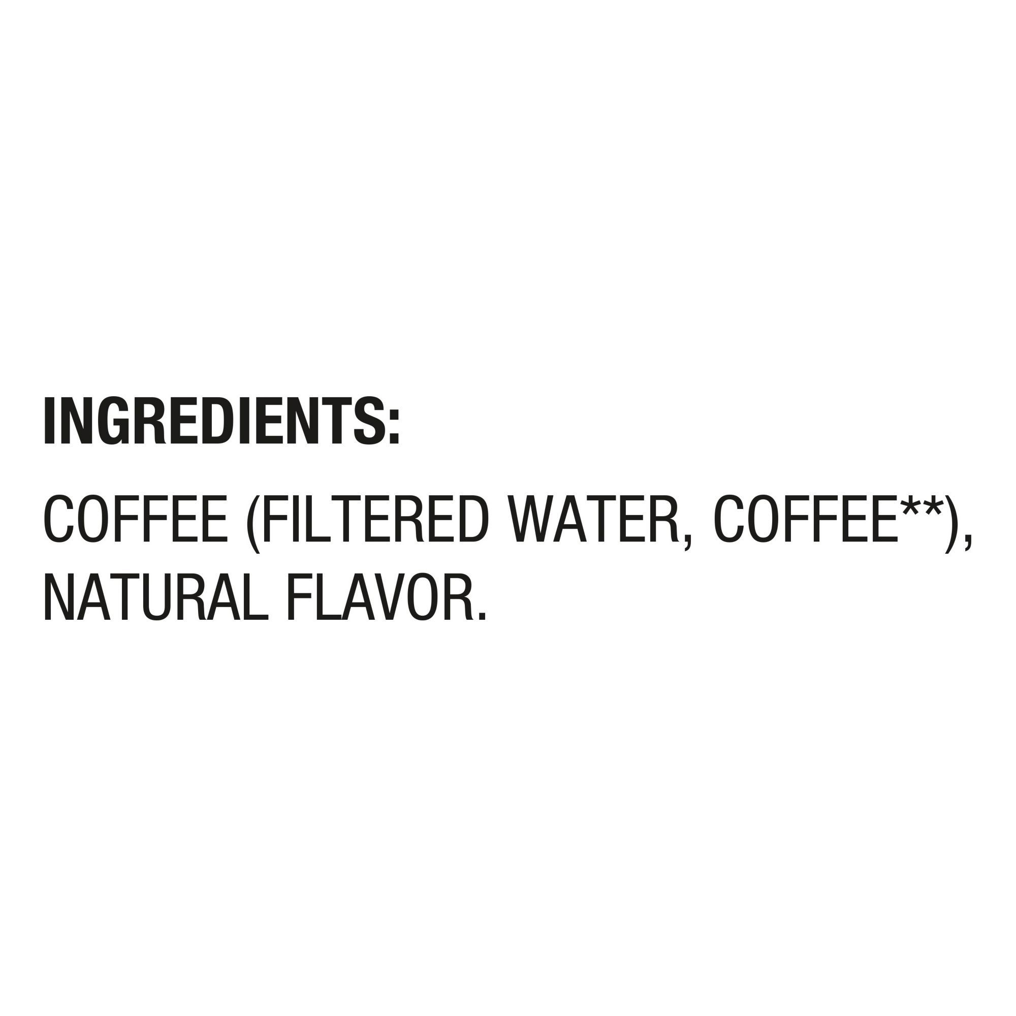 Ingredients: Coffee (Filtered Water, Coffee Extract), Natural Flavor (With Natural Coffee Flavor).