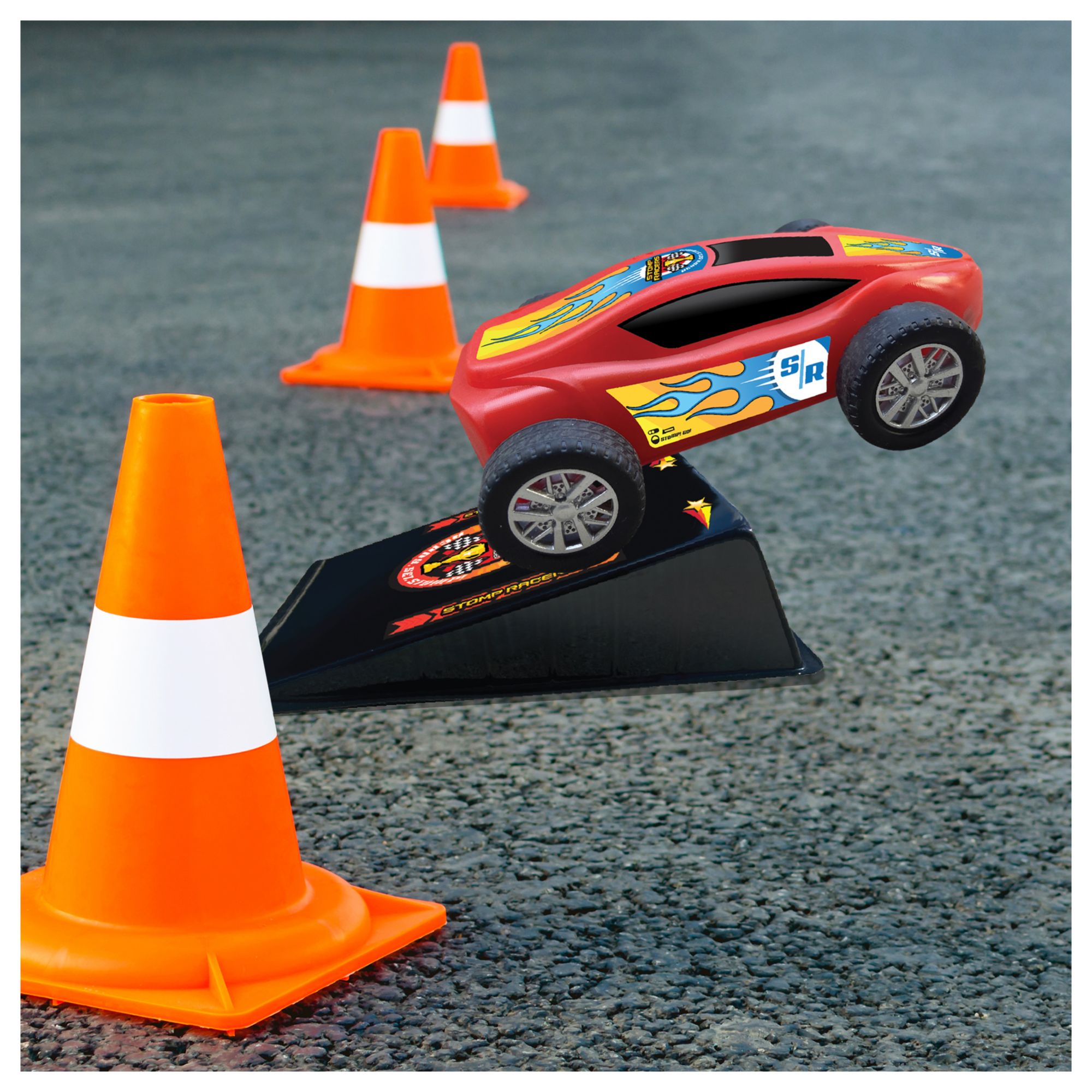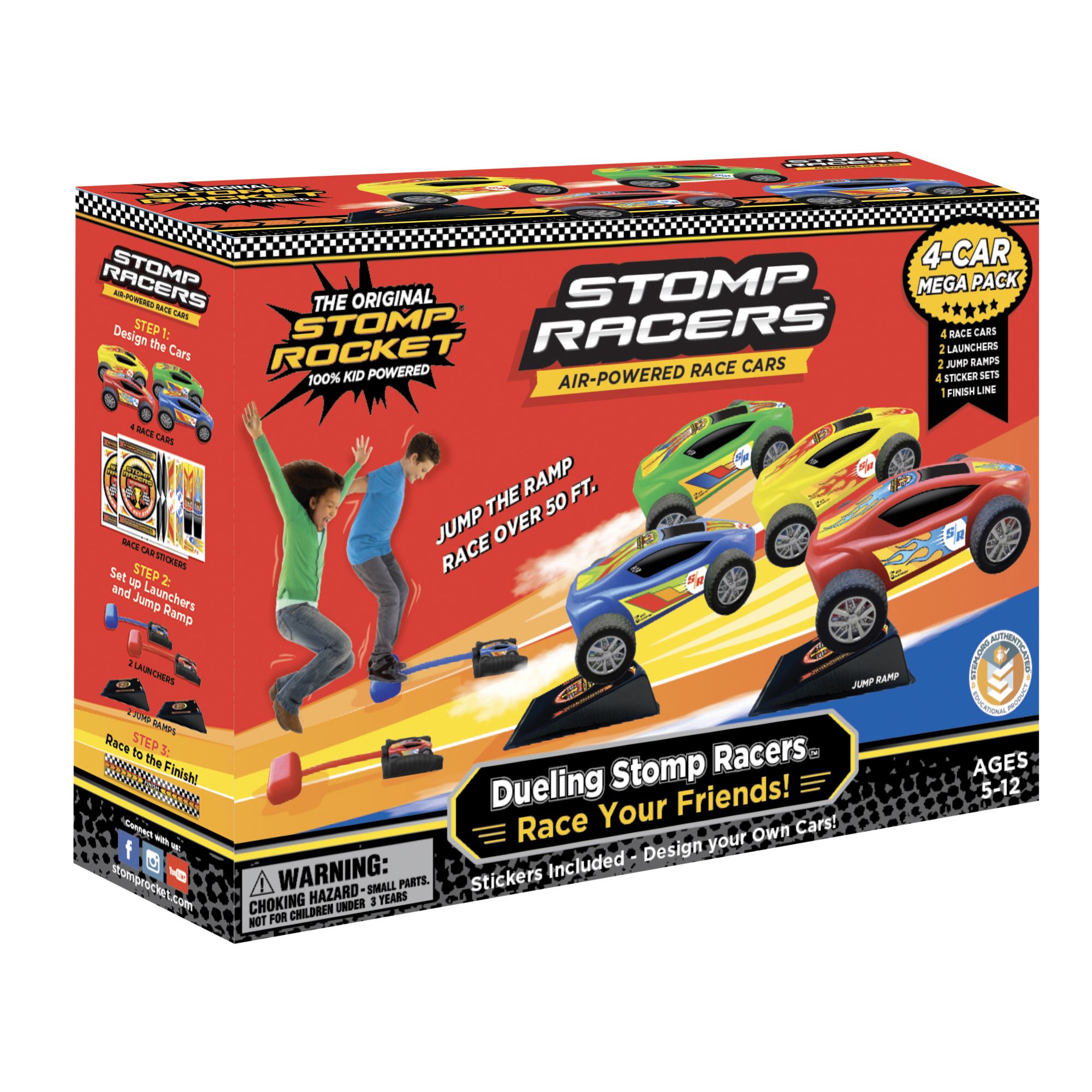 Includes four stomp racer air-powered race cars, two jump ramps, two stomp launchers, four sets of decals, one finish line