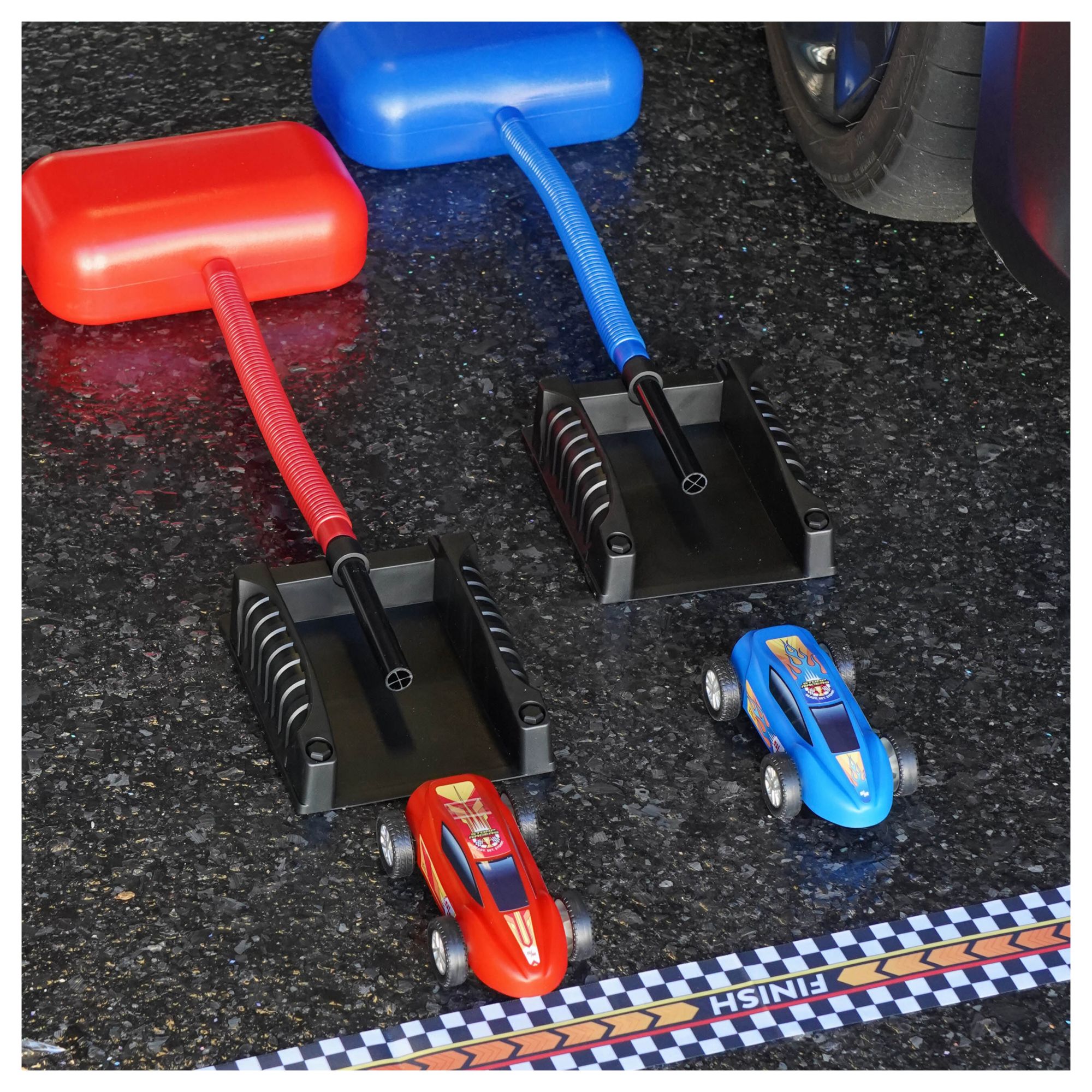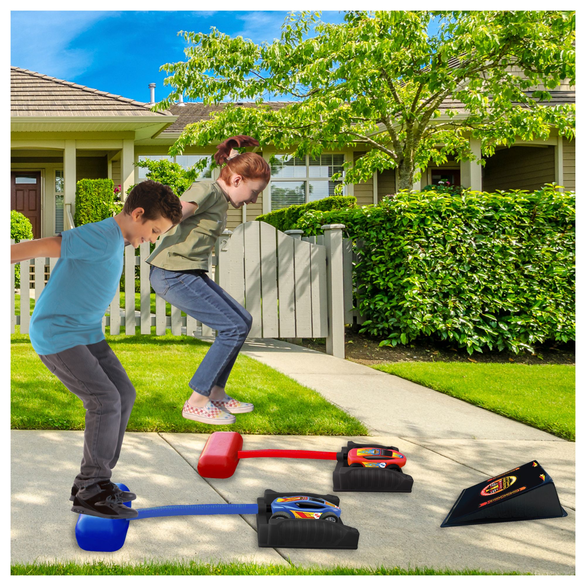 This special Dueling Set lets two kids launch cars at the same time. Race your friends to the finish or jump off the ramp for extreme racing and tricks. These are kid-powered race cars that race, jump, tumble, crash and perform epic stunts. Great for year-round fun to get kids away from screen time and instead get them playing with outdoor toys. No batteries required; easy and fast assembly.