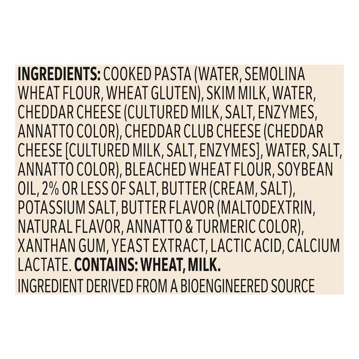 Ingredients: Cooked Pasta (Water, Semolina Wheat Flour,wheat Gluten), Skim Milk, Water, Cheddar Cheese (Cultured Milk, Salt, Enzymes, Annatto Color), Cheddar Club Cheese (Cheddar Cheese [Cultured Milk, Salt, Enzymes], Water, Salt, Annatto Color), Bleached Wheat Flour, Soybean Oil, 2% Or Less Of Salt, Butter (Cream, Salt), Potassium Salt, Butter Flavor (Maltodextrin, Natural Flavor, Annatto & Turmeric Color), Xanthan Gum, Yeast Extract, Lactic Acid, Calcium Lactate.