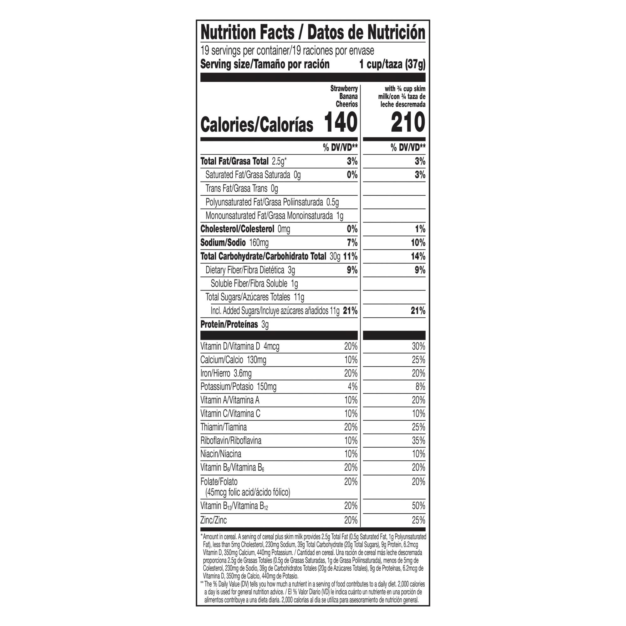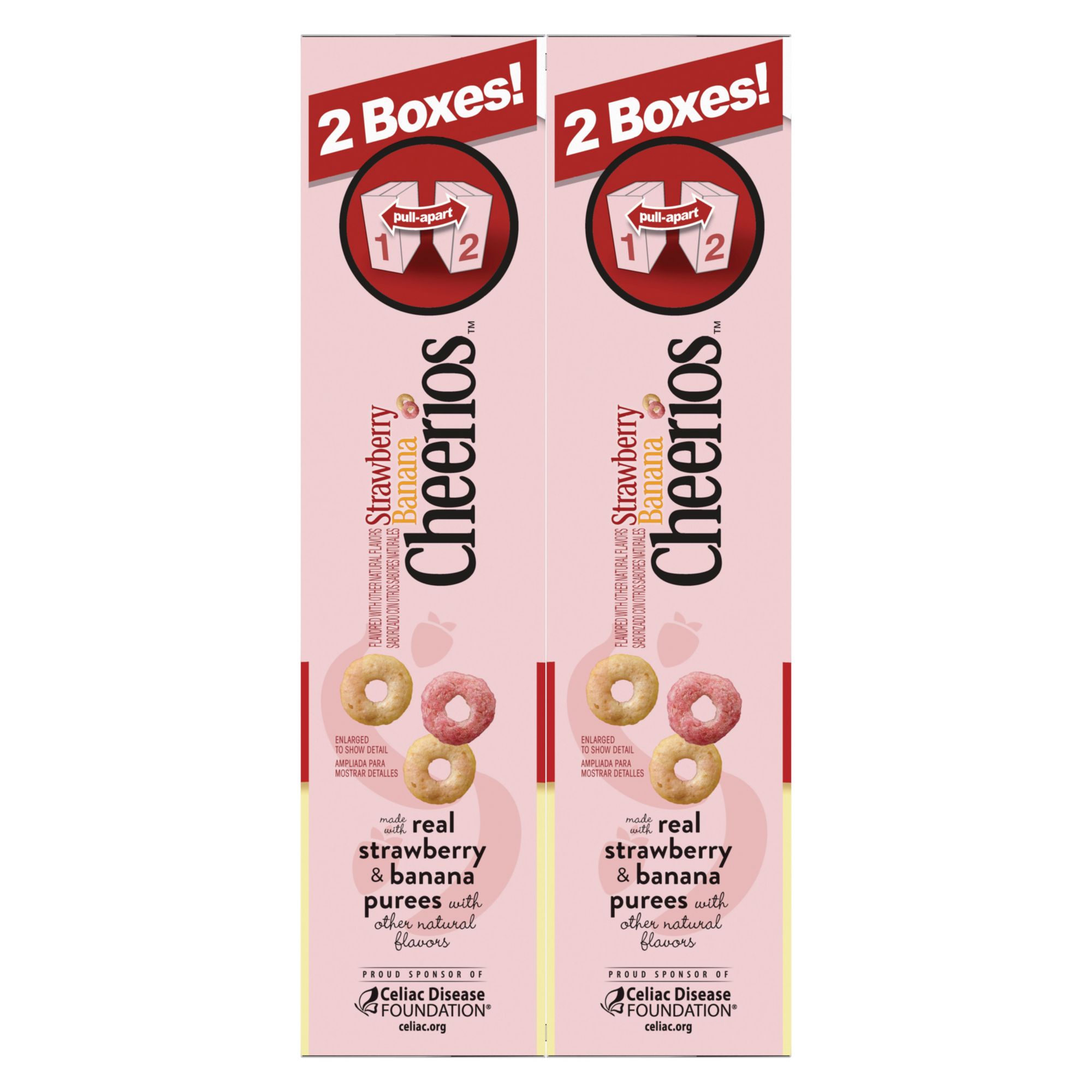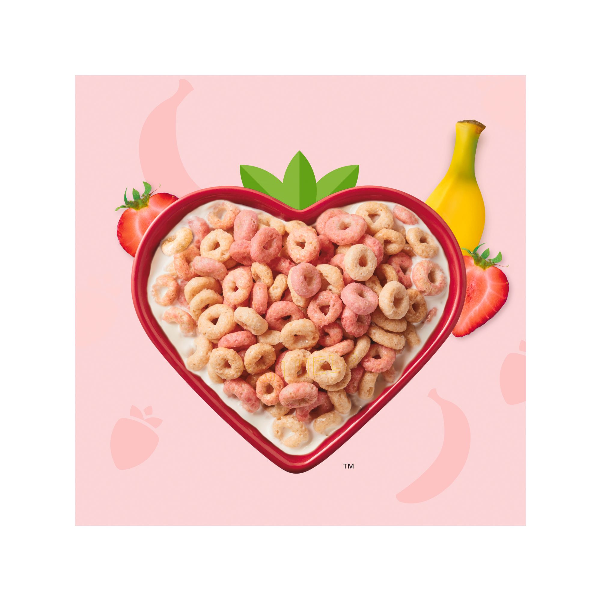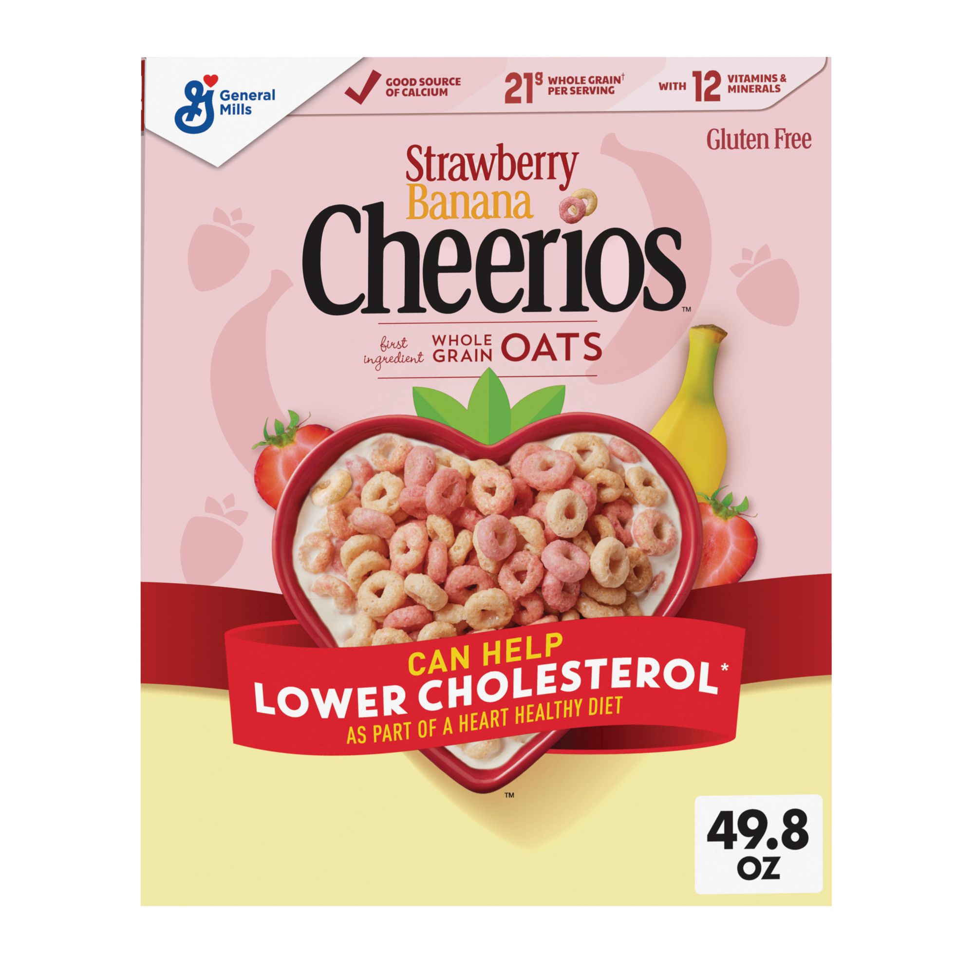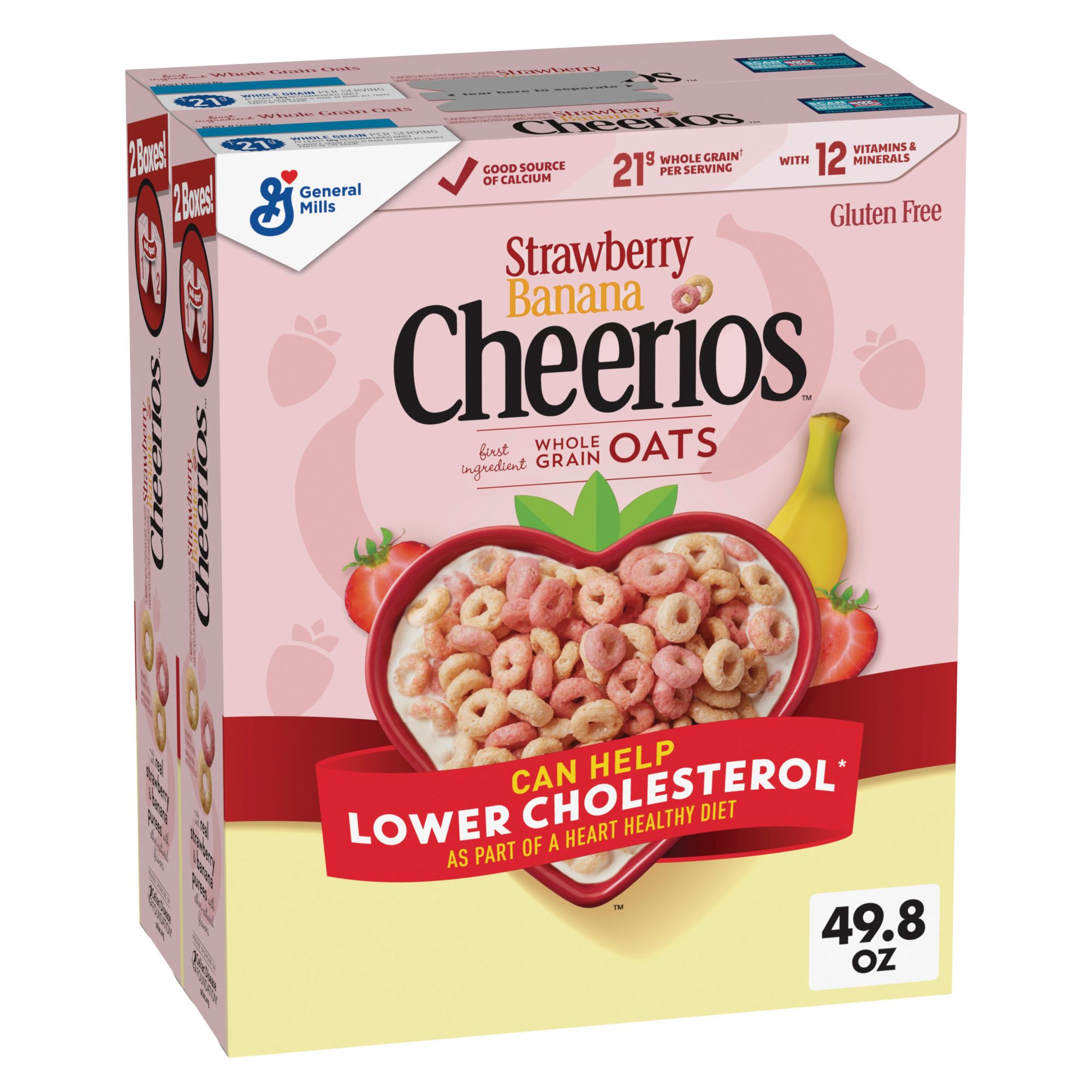 Fall head over peels for breakfast with General Mills Strawberry Banana Cheerios Cereal. Bring the taste of juicy strawberries and ripe bananas to your cereal bowl. Made with real fruit puree and other natural flavors and whole grain oats, these tasty Os fill you up with wholesome goodness. Share this heart healthy cereal with your family as part of breakfast. Make strawberry and banana cereal bars to give your friends. Or offer the little Os as gluten free snacks for kids. The gluten free cereal is made with no artificial flavors or colors from artificial sources. Whole grain oats are the first ingredient, and every serving provides 21 grams of whole grains per serving (at least 48 grams recommended daily). Strawberry Banana Cheerios cereal can help lower cholesterol as part of a heart healthy diet. Three grams of soluble fiber daily from whole grain oat foods in a diet low in saturated fat and cholesterol may reduce the risk of heart disease.