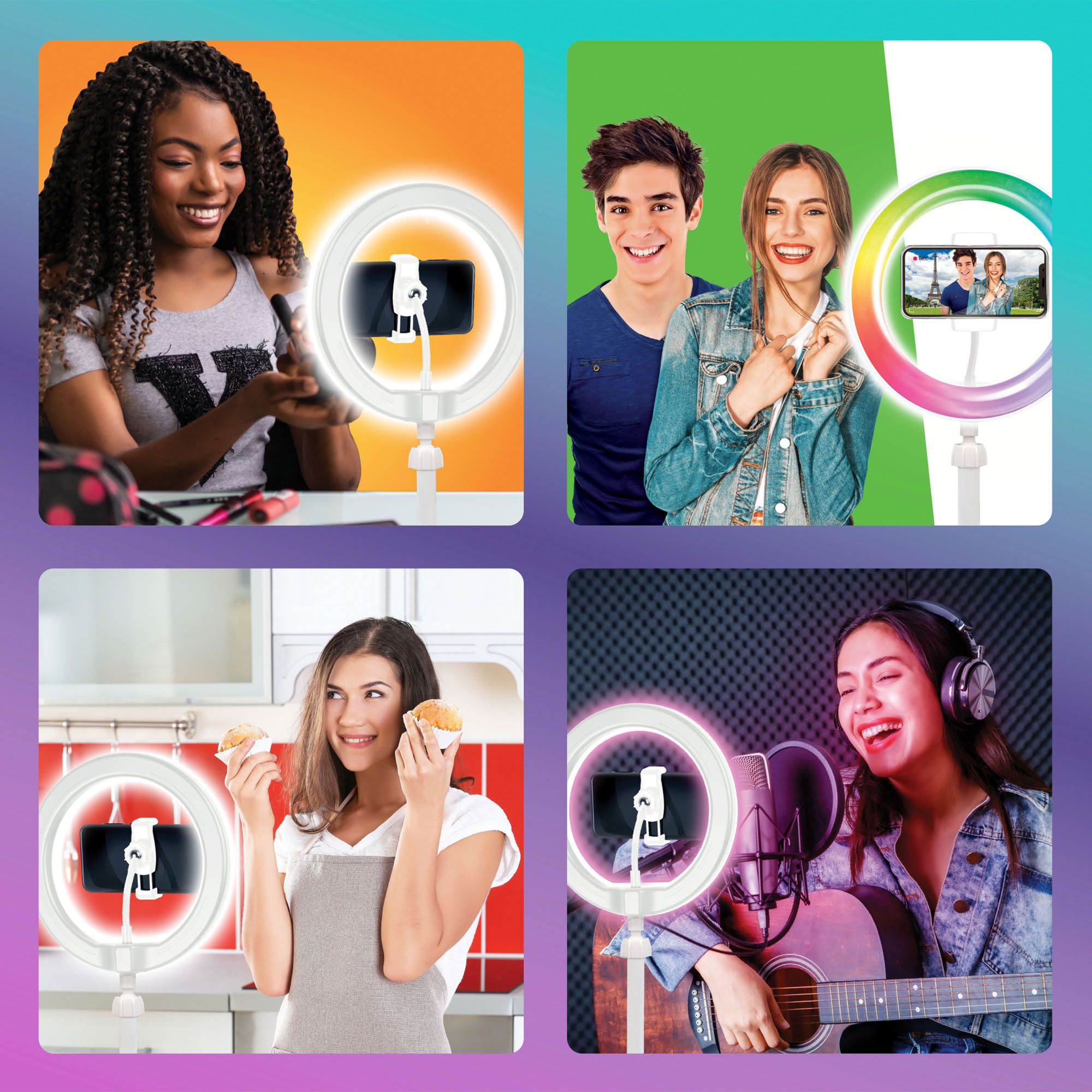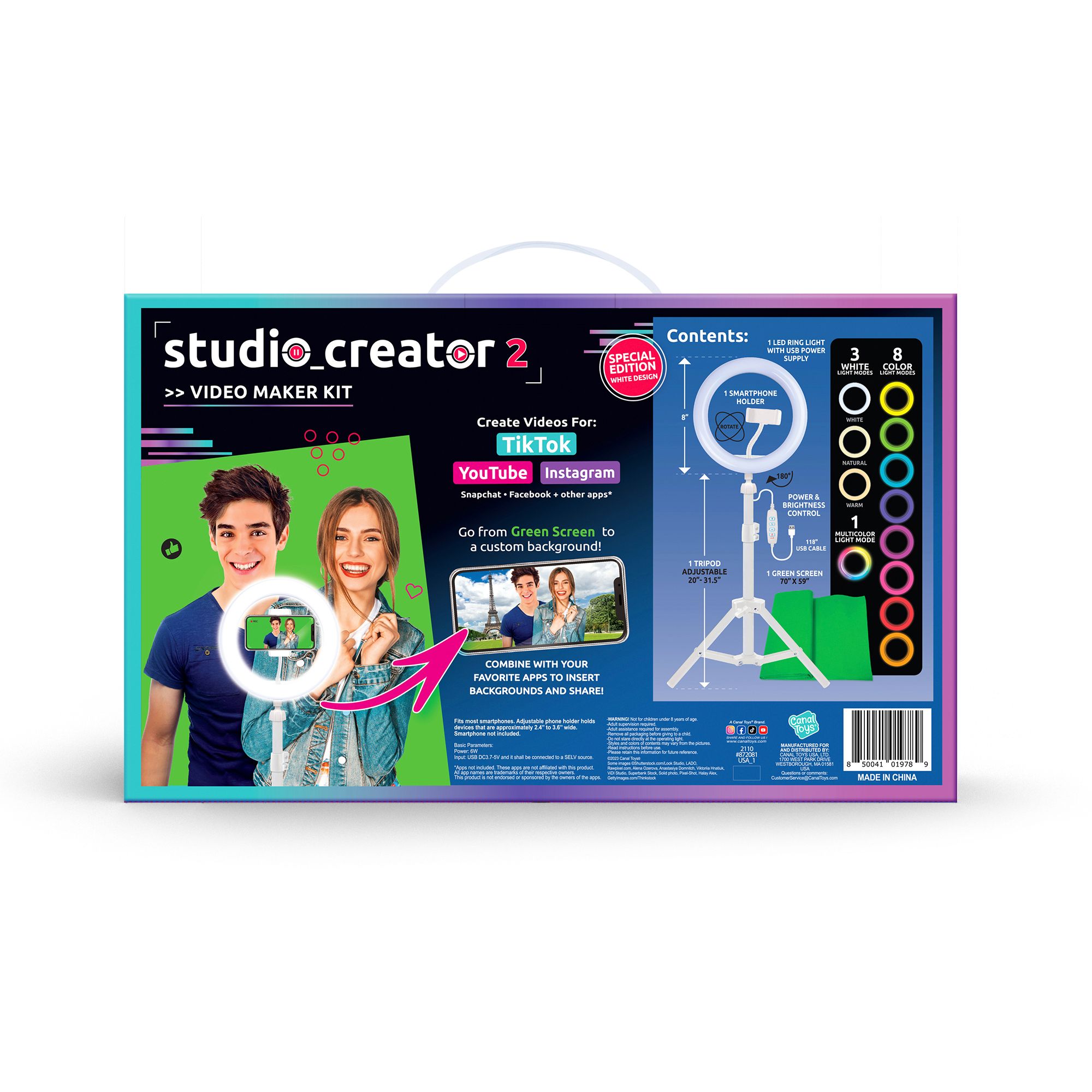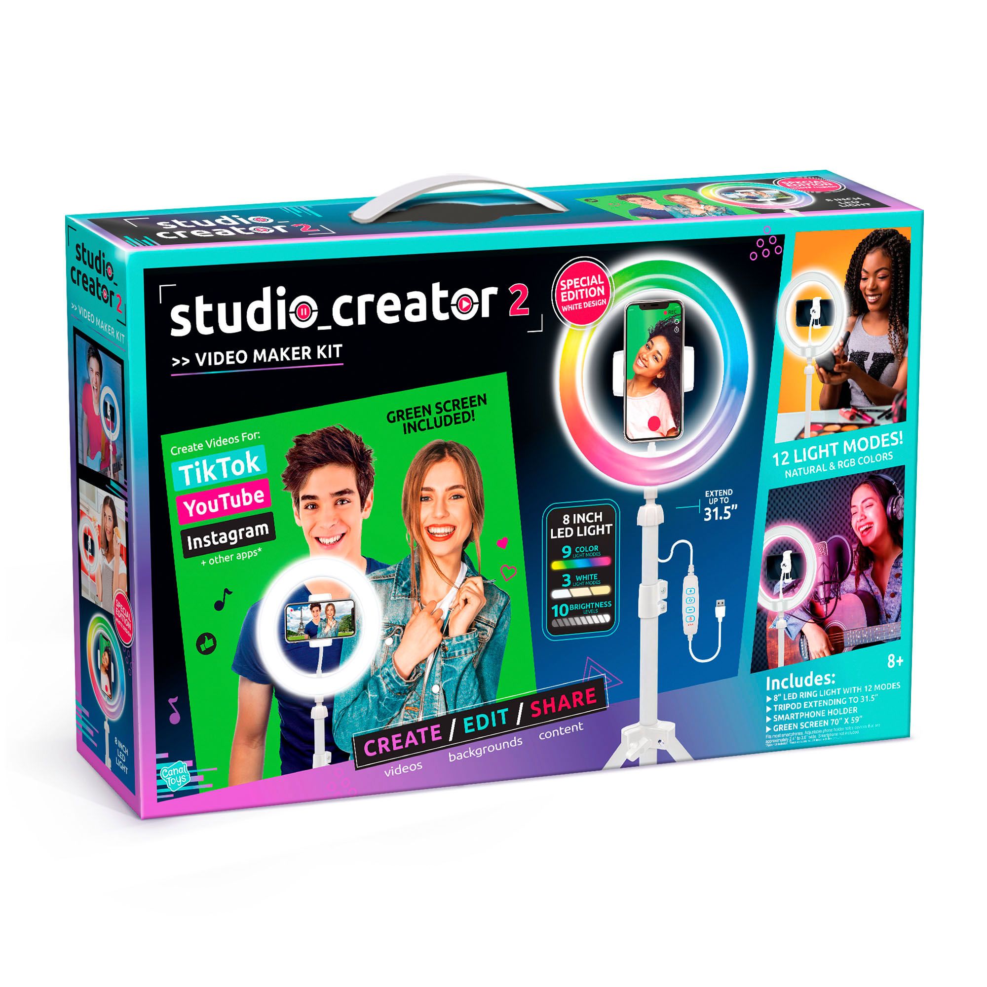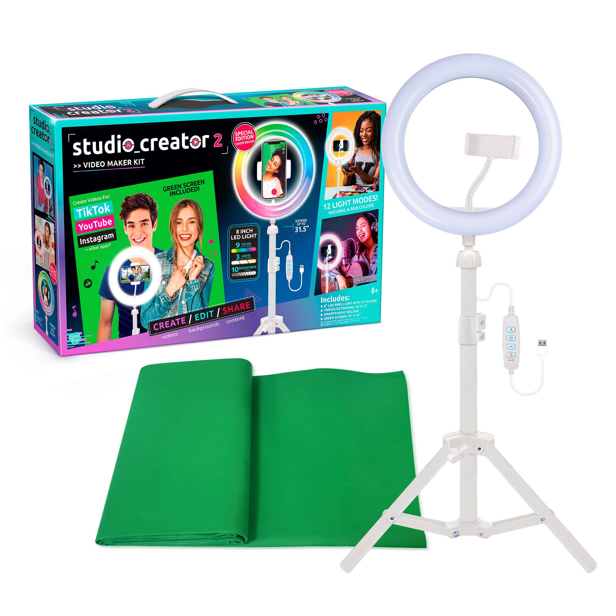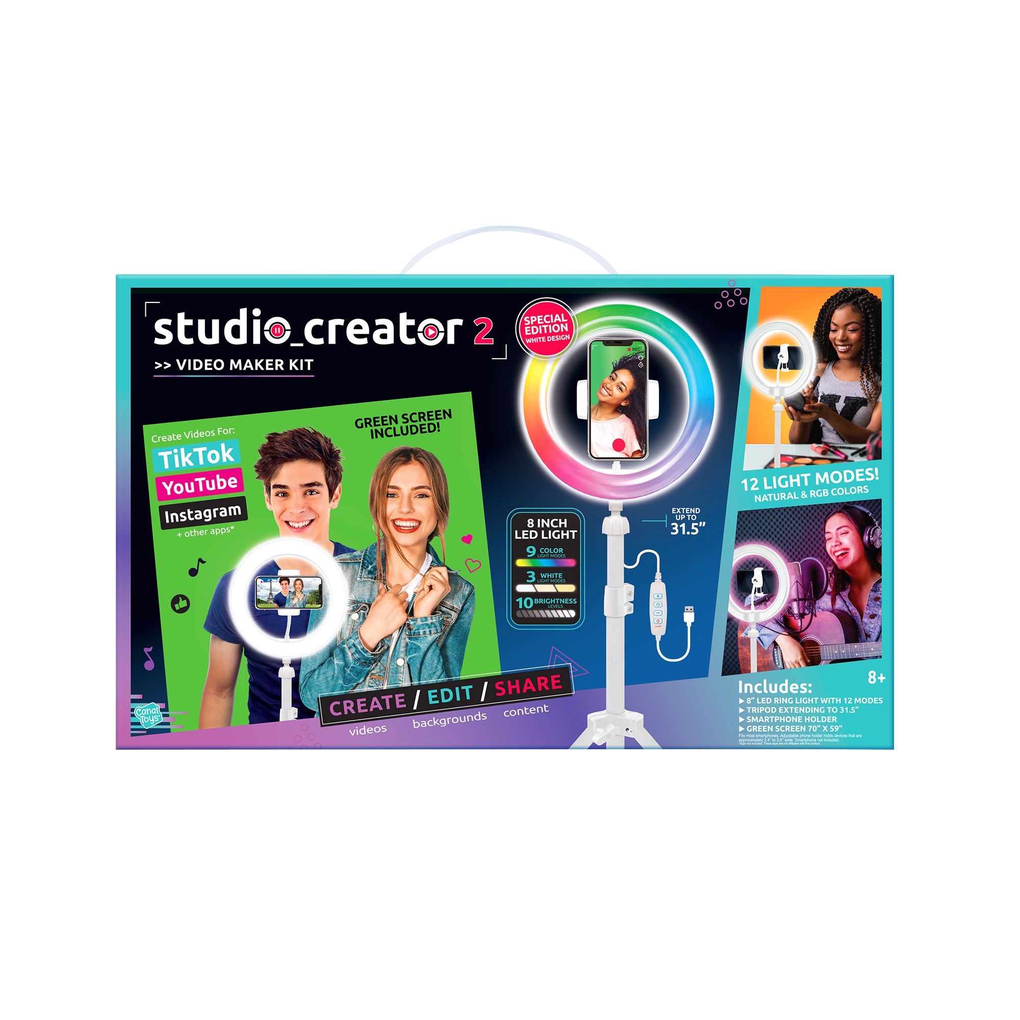 Create amazing videos like your favorite influencers with the Studio Creator 2 Video Maker Kit. Use the LED multicolored ring light, adjustable tripod, and green screen to create 100% original content that will be #fyp worthy. The completely adjustable tripod and smartphone mount will help you record hands-free from any POV and ensure you can easily participate in trends and challenges. Easily adjust the smartphone mount to capture your best angles and choose between three LED white light modes plus eight more LED color modes to help you get professional lighting at home. Your selfies and videos will look better than ever, no filter is needed.