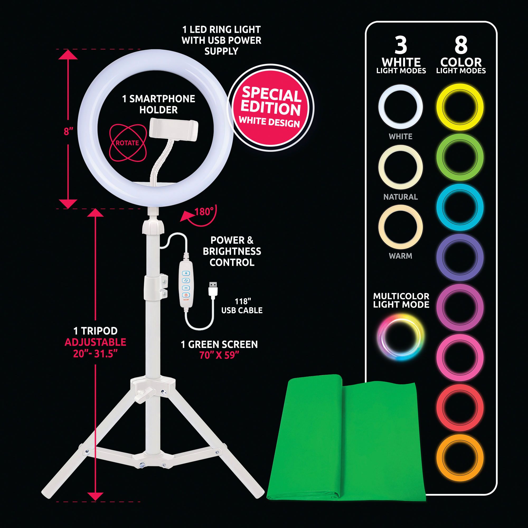 Includes 8” LED ring light, 70”x59” green screen, extendable tripod up to 31.5”, smartphone holder, USB power cord with controller, and guide