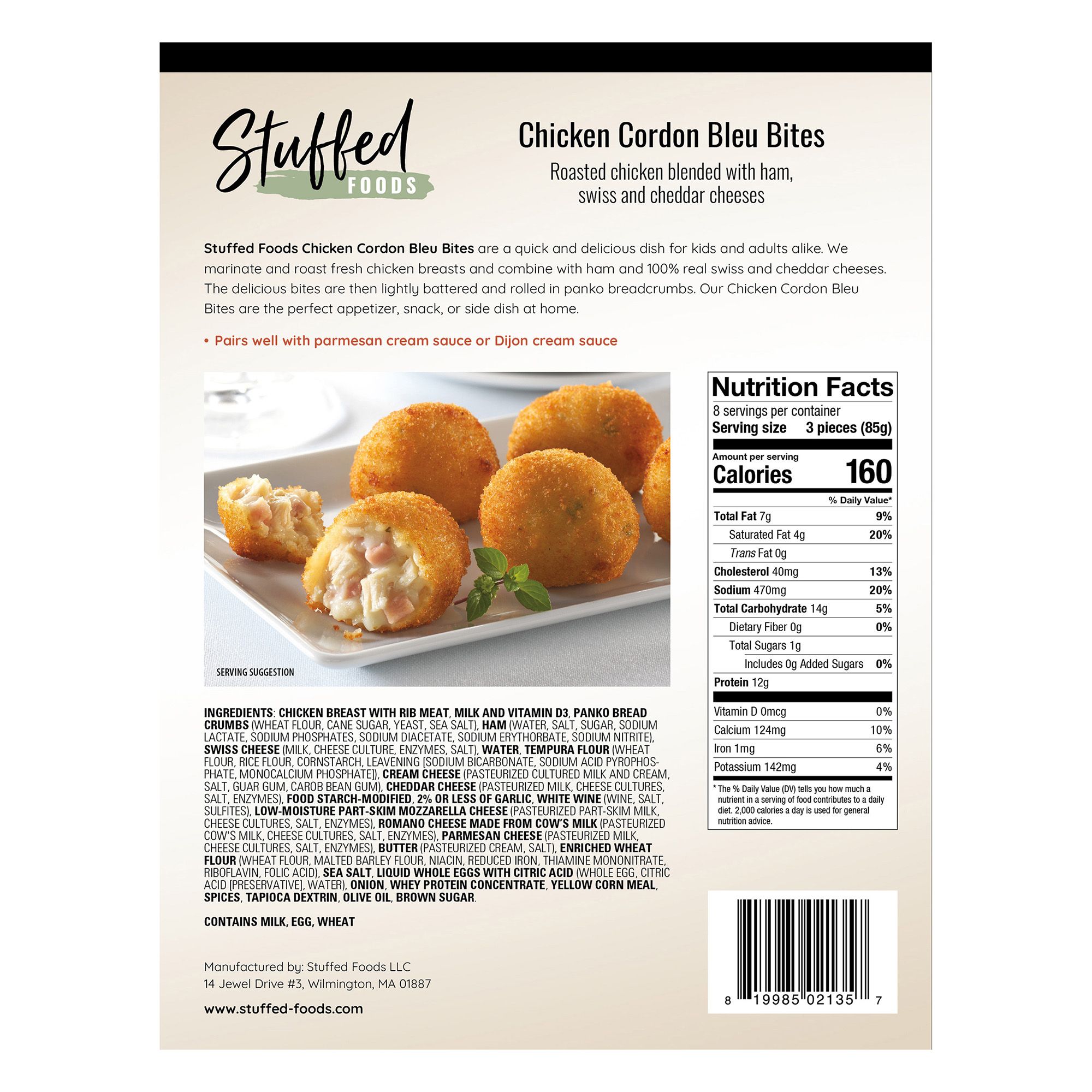 Stuffed Foods Chicken Cordon Bleu Bites are a quick and delicious dish for kids and adults alike. The fresh chicken breasts are marinated and roasted, then combined with ham and 100% real swiss and cheddar cheeses. The delicious bites are then lightly battered and rolled in panko breadcrumbs. These Chicken Cordon Bleu Bites are the perfect appetizer, snack, or side dish at home.