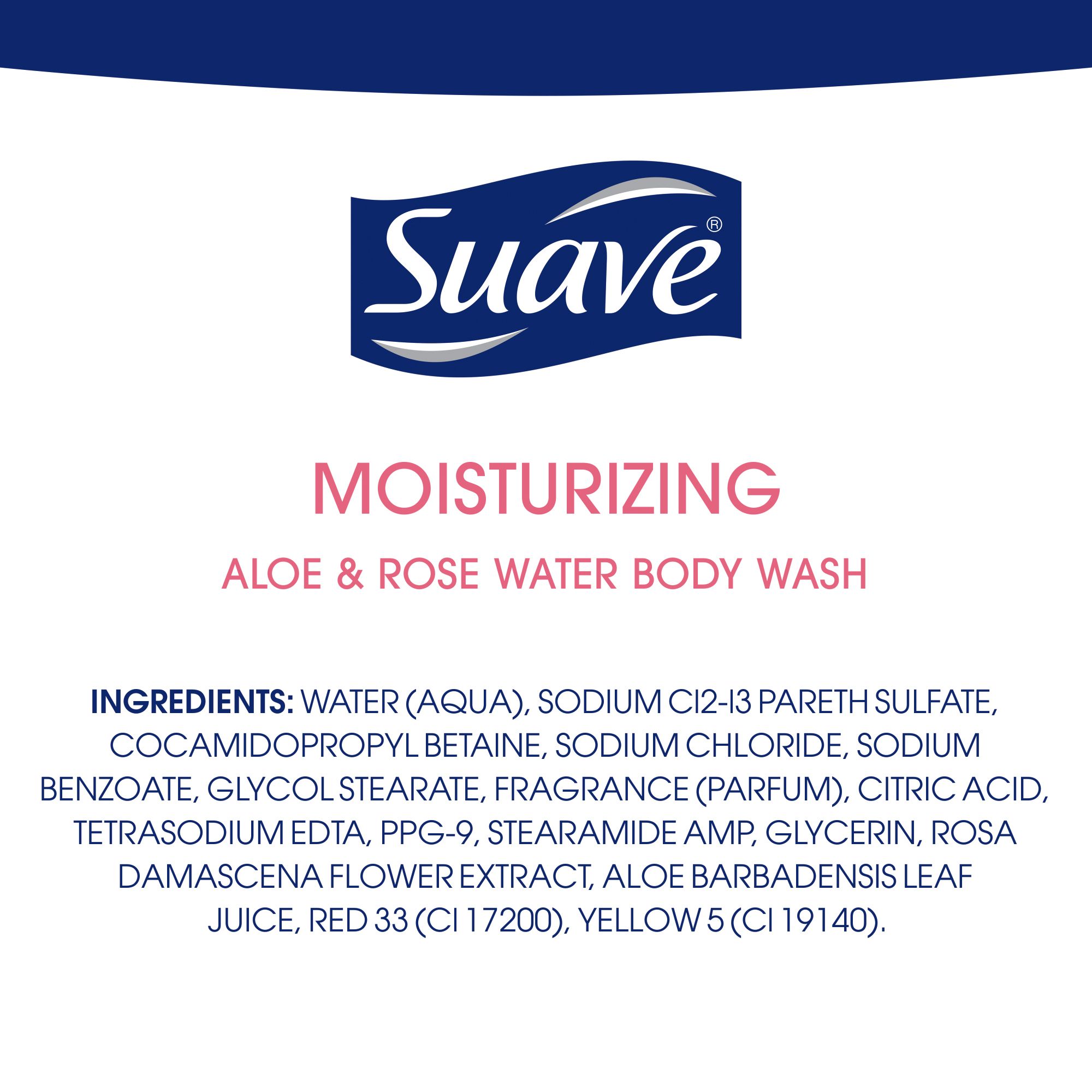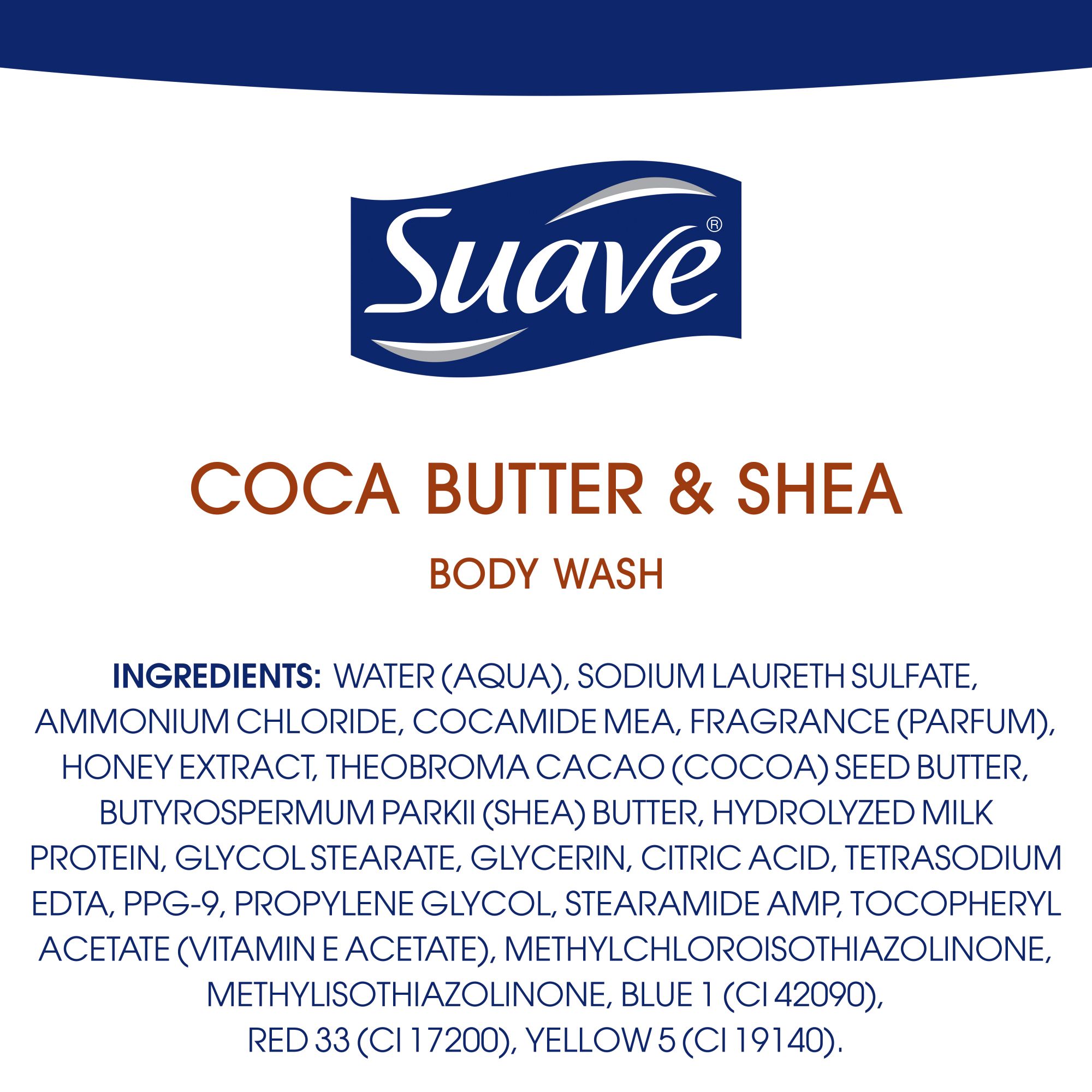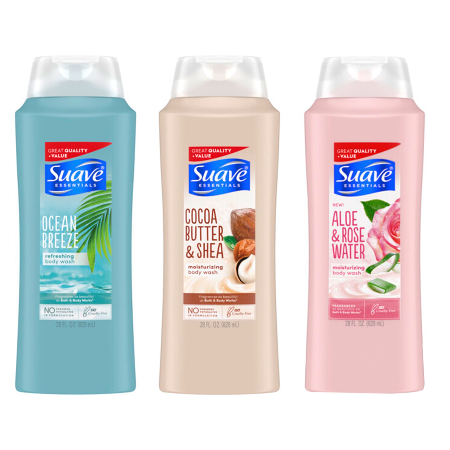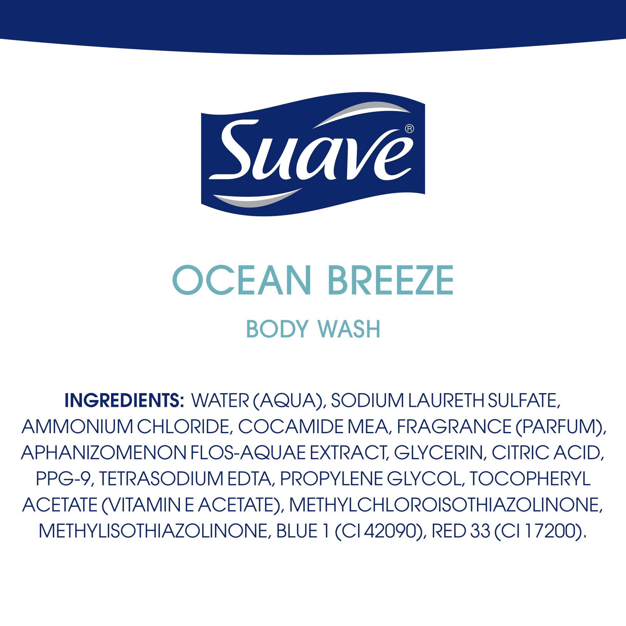 Get three times the fragrant power of Suave Essentials Body Wash with this money-saving three-pack Suave Essentials Moisturizing Body Wash uses aloe and rosewater to leave skin soft and nourished — more than most body soap Suave Moisturizing Creamy Cocoa Butter and Shea Body Wash has delicious scents of cocoa butter, coconut and vanilla that release in the shower Revel in the fresh scent of sandalwood with a splash of freesia with the Ocean Breeze Body Wash that burst in the shower when using this shower gel Enjoy a rich, creamy body soap lather that rinses off easily helping to leave skin feeling fresh and clean Use this body soap daily to help keep your skin feeling soft and smelling wonderful
