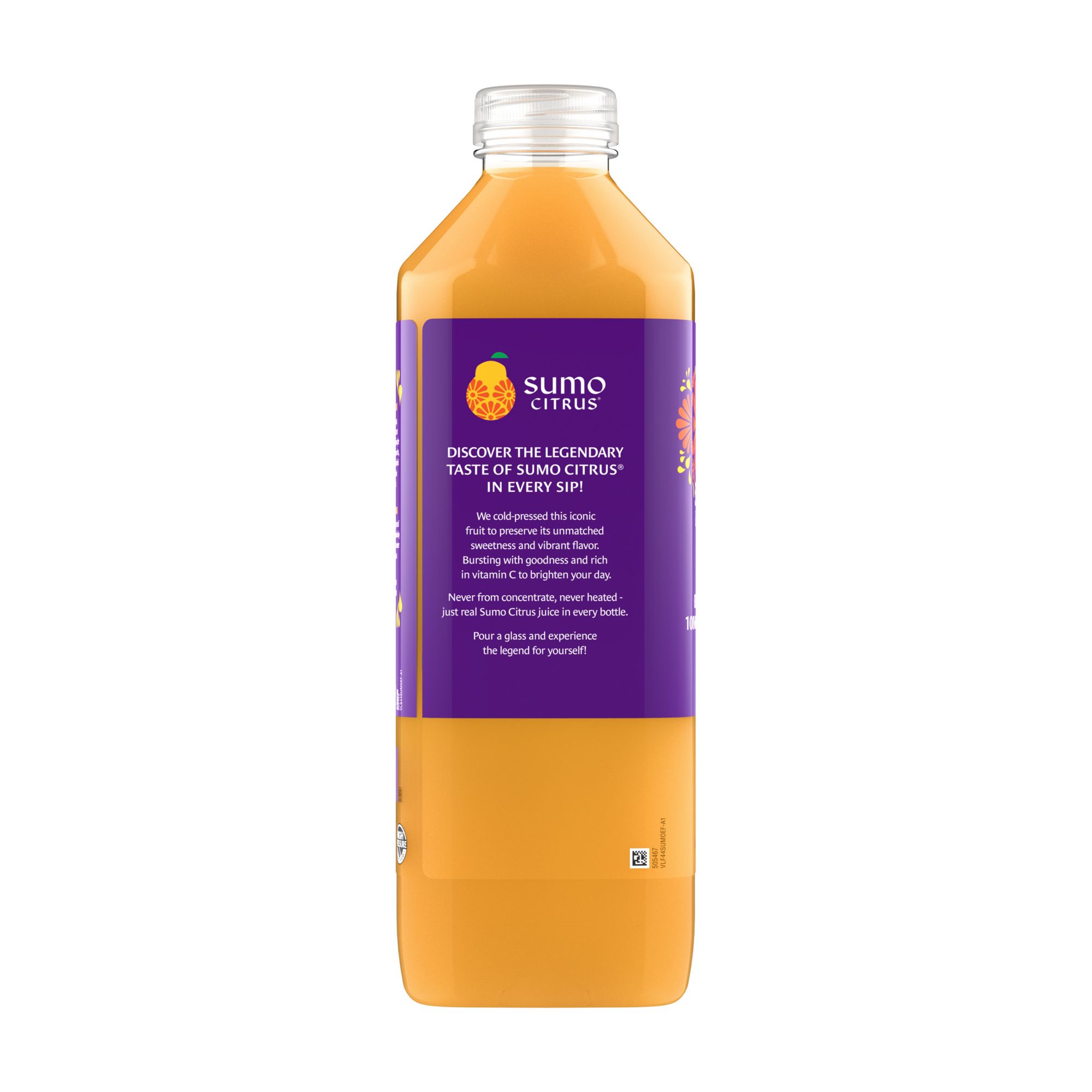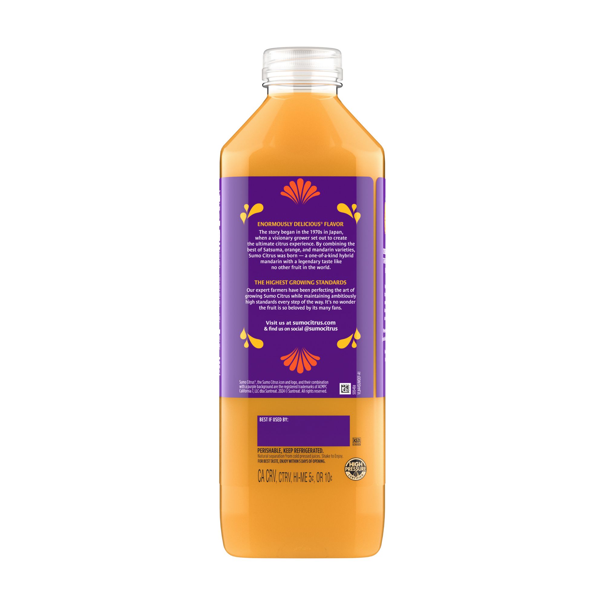 100% cold pressed mandarin juice. Sumo Citrus is an enormously delicious mandarin originally from Japan. Through passion, innovation, and our ambitious standards, we deliver a legendary taste for those seeking extraordinary foods, inspiring unexpected joy in everyday life. This product has about 5.5 servings per container, one serving size is 8 fl. oz. which contains 120 calories, low fat, low sodium, low cholesterol, 0g of added sugars, and 2g of protein. Sumo Citrus Mandarin Juice provides a healthy source of Vitamin C.