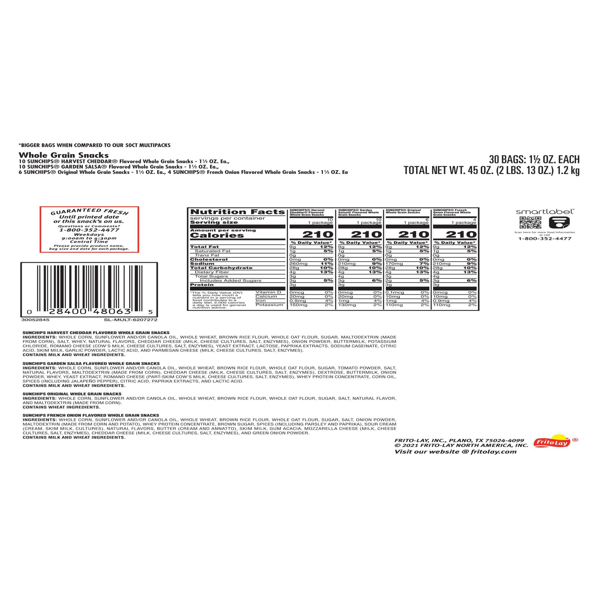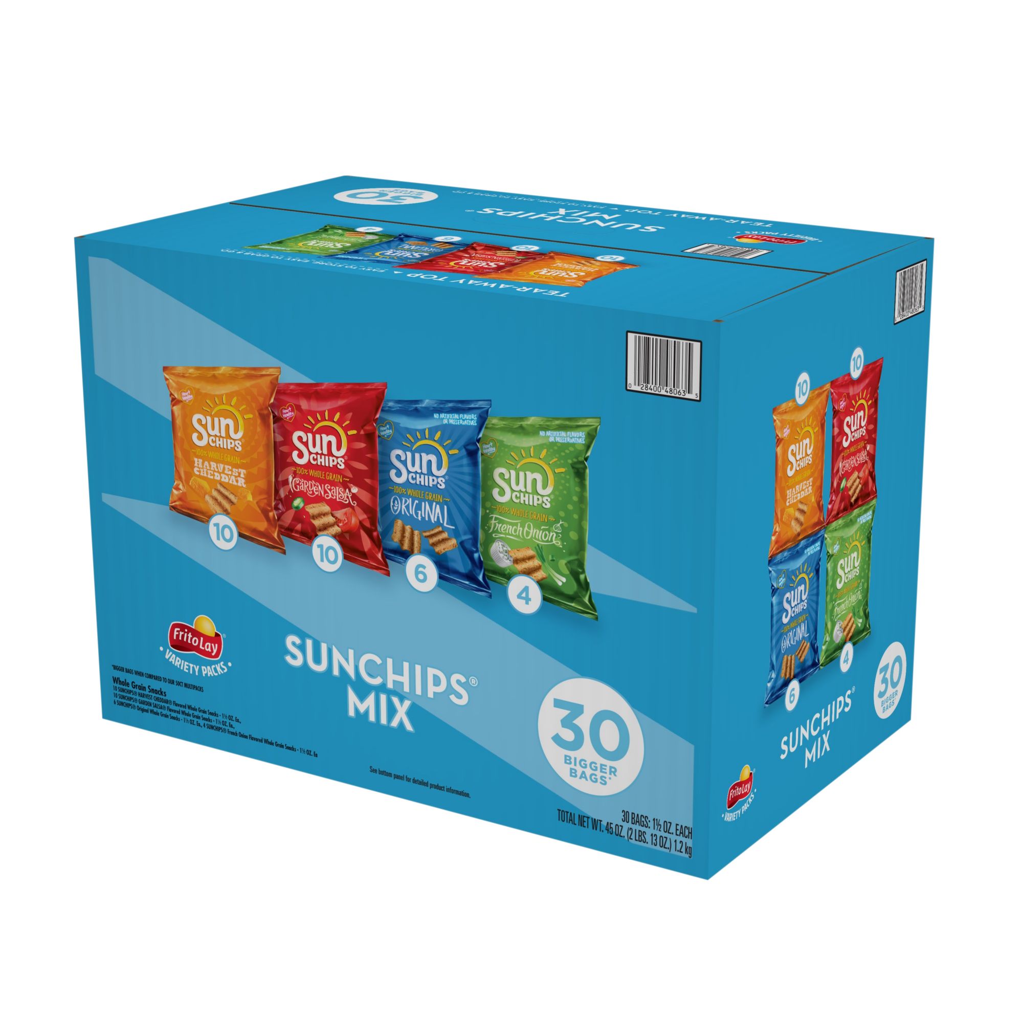 30 bags in one convenient pack Includes 10 Harvest Cheddar, 10 Garden Salsa, 6 Original, and 4 bags French Onion flavored SunChips Made with 100% whole grains Variety pack lets you choose your favorite - there's something for everyone Single-serve packs help with portion control Portability ensures fresh tasting chips every time Perfect for on-the-go snacking or lunch bags