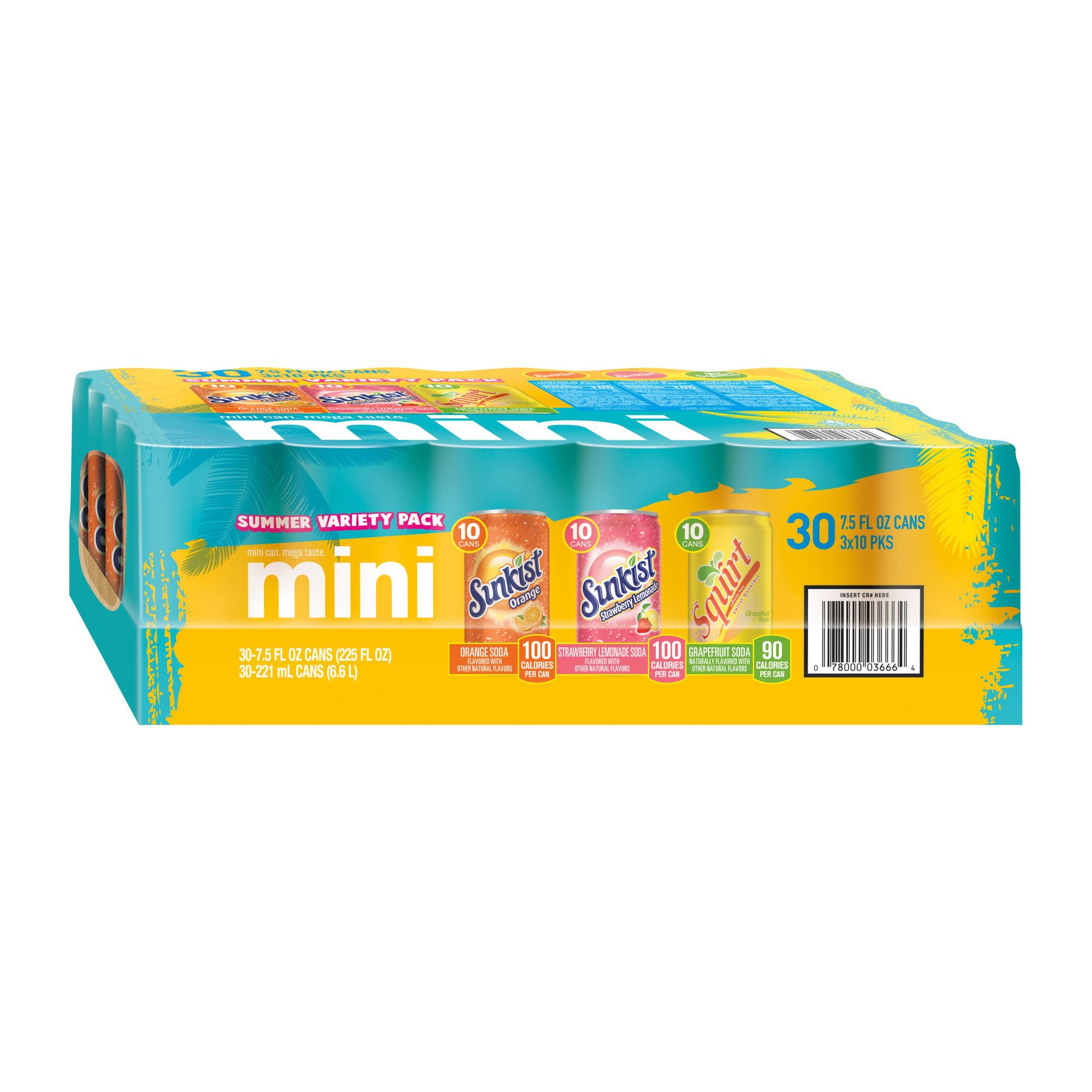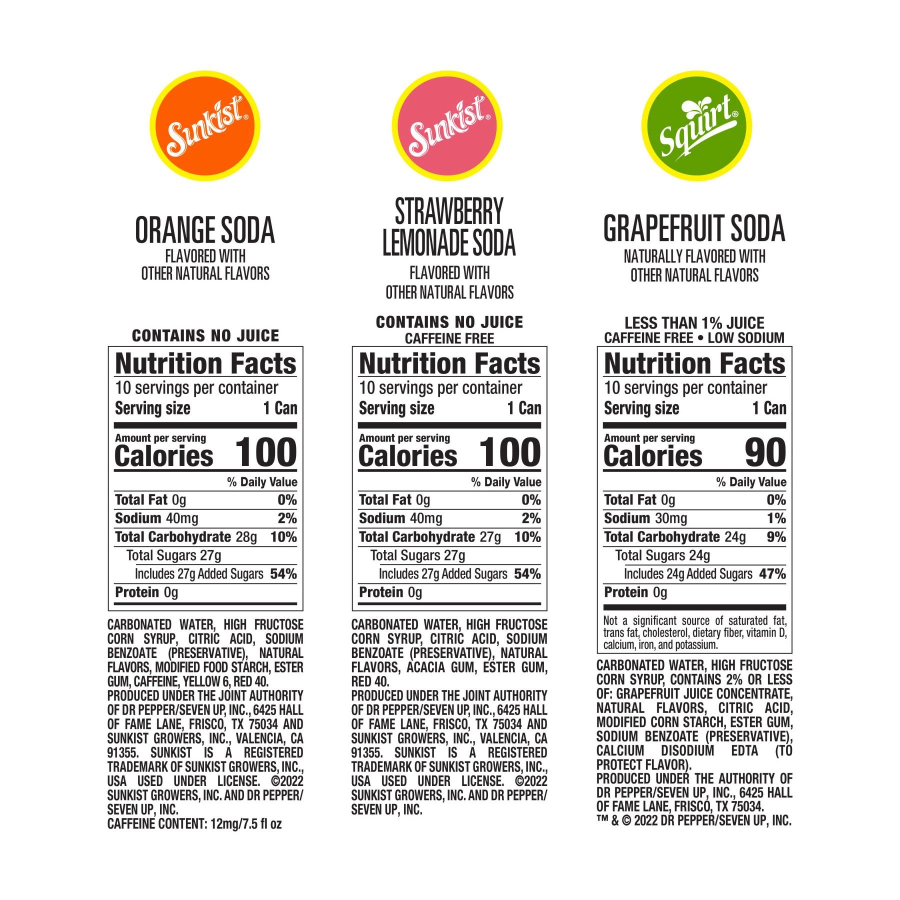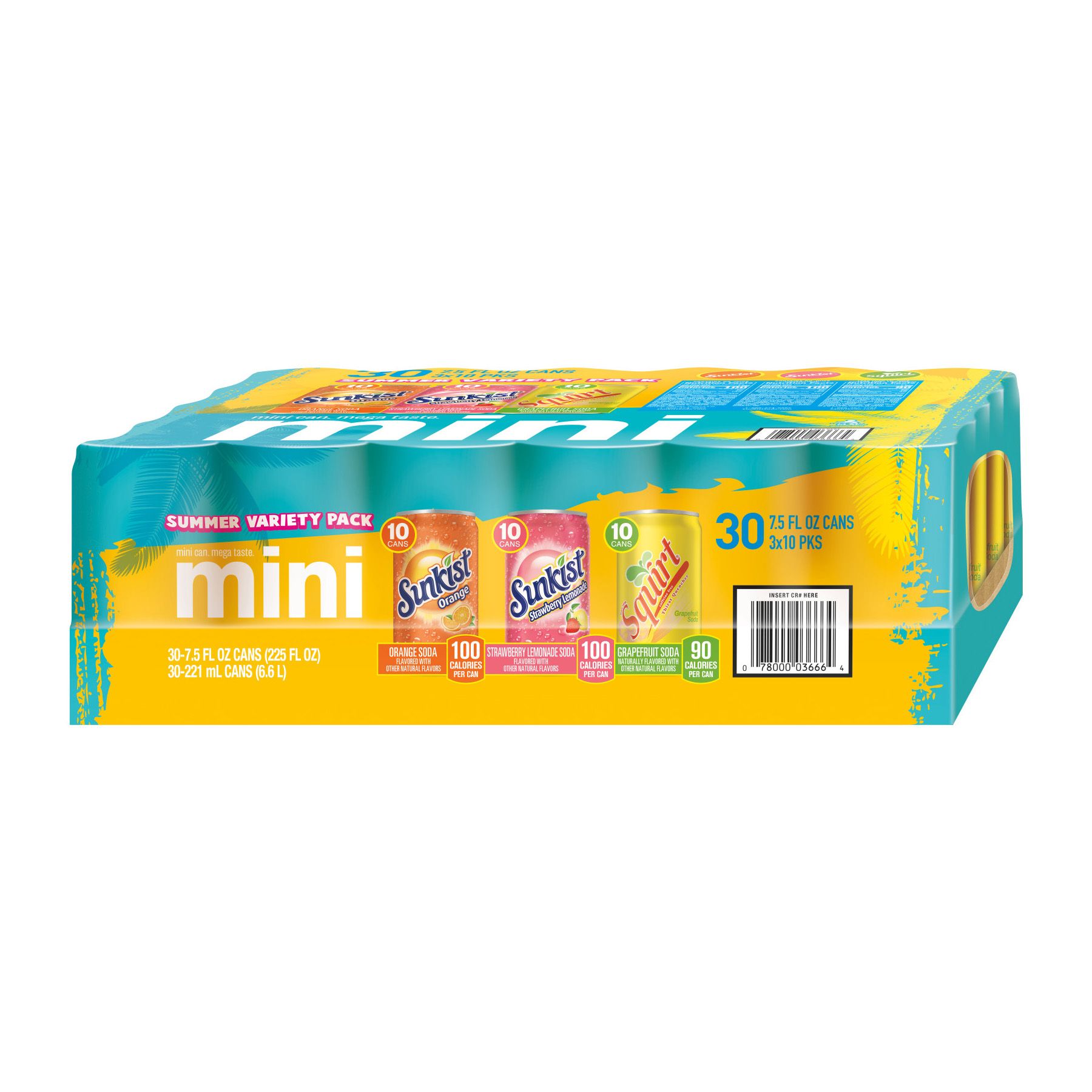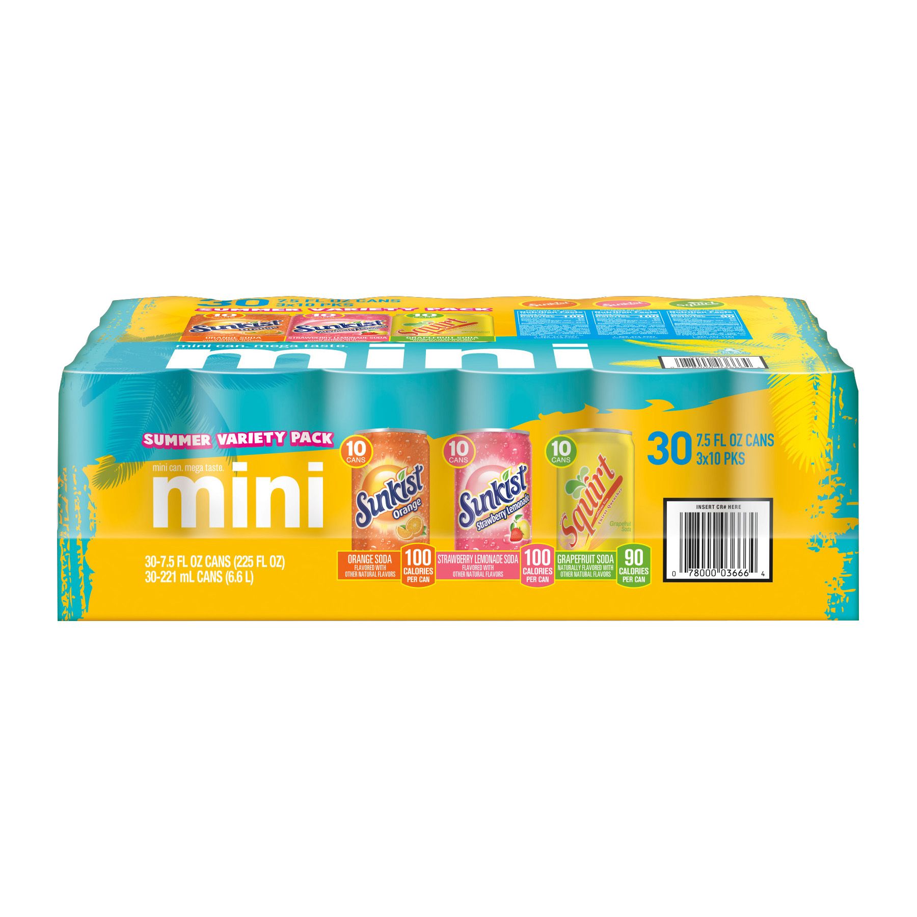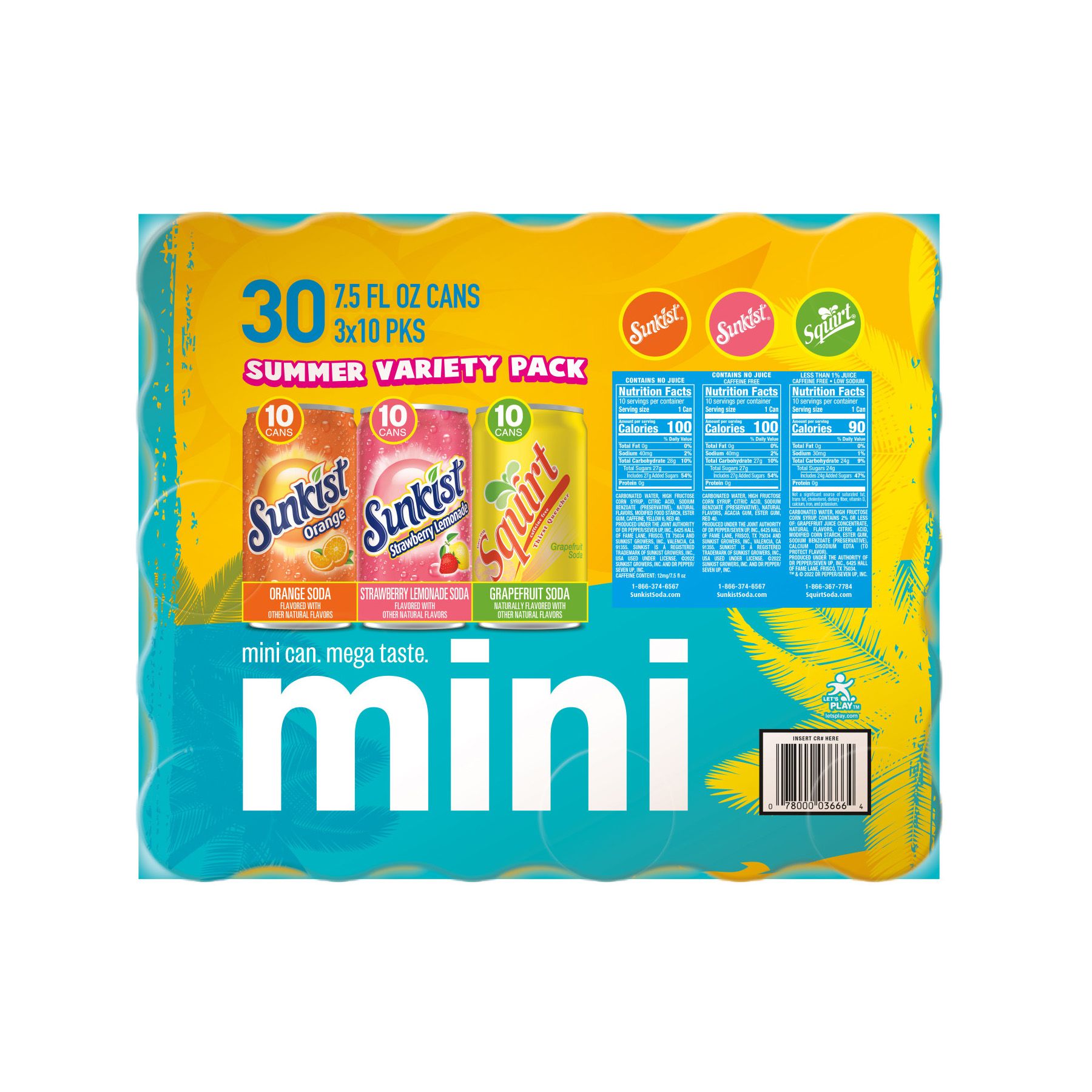 10 mini cans each of Sunkist Orange, Sunkist Strawberry Lemonade, and Squirt for the ultimate summer refreshment the whole family will love These mini cans are the adorably refreshing treat you can enjoy again and again Soak up the sunny orange soda taste that always satisfies your thirst A favorite since its creation in 1979, it’s the only caffeinated orange soft drink on the market for that little bit of extra kick you won’t find anywhere else Caffeine-free and beaming with fruity strawberry and citrusy lemon, Sunkist Strawberry Lemonade is the perfect summery blend for any occasion Sunkist and Squirt have been summer staples throughout the years for a reason