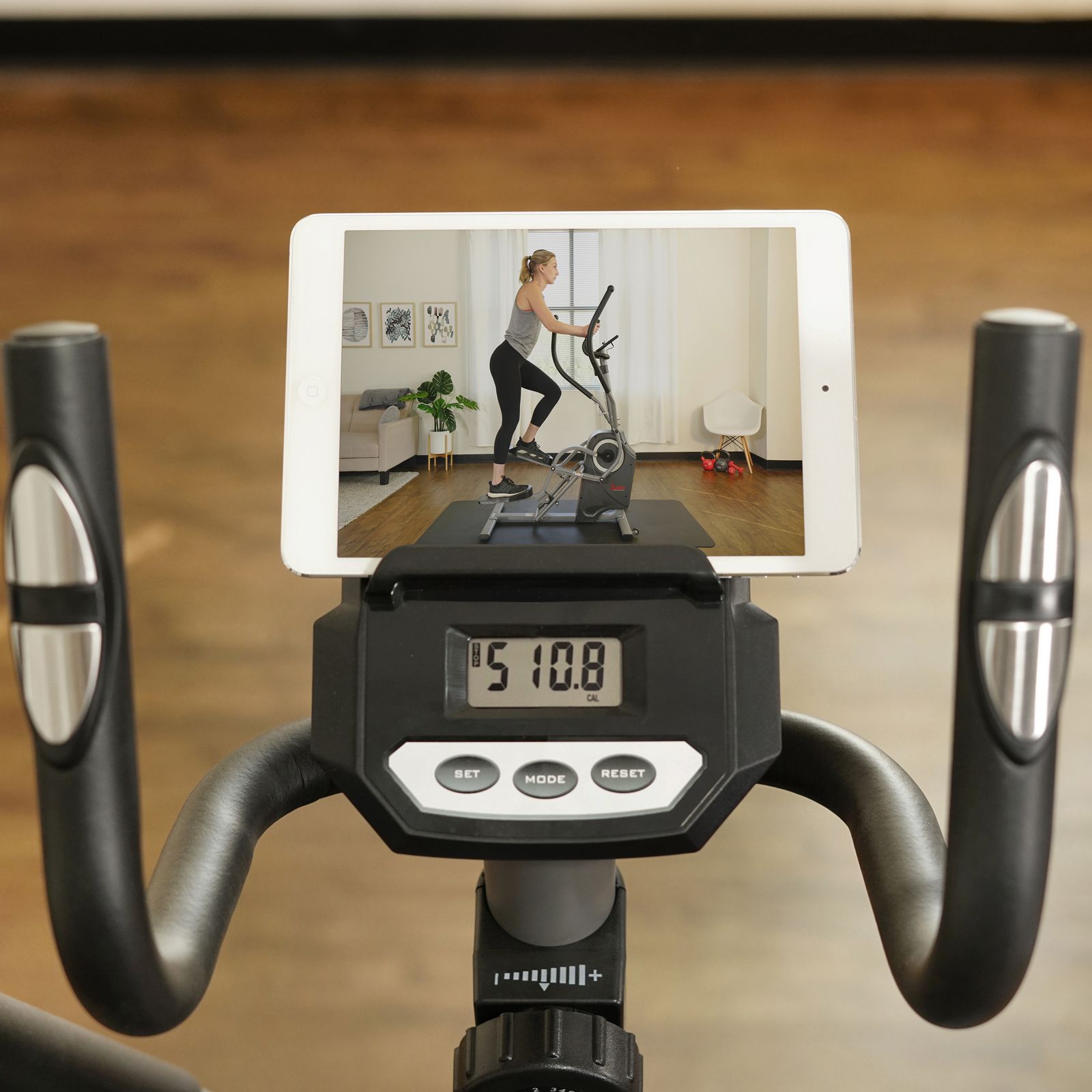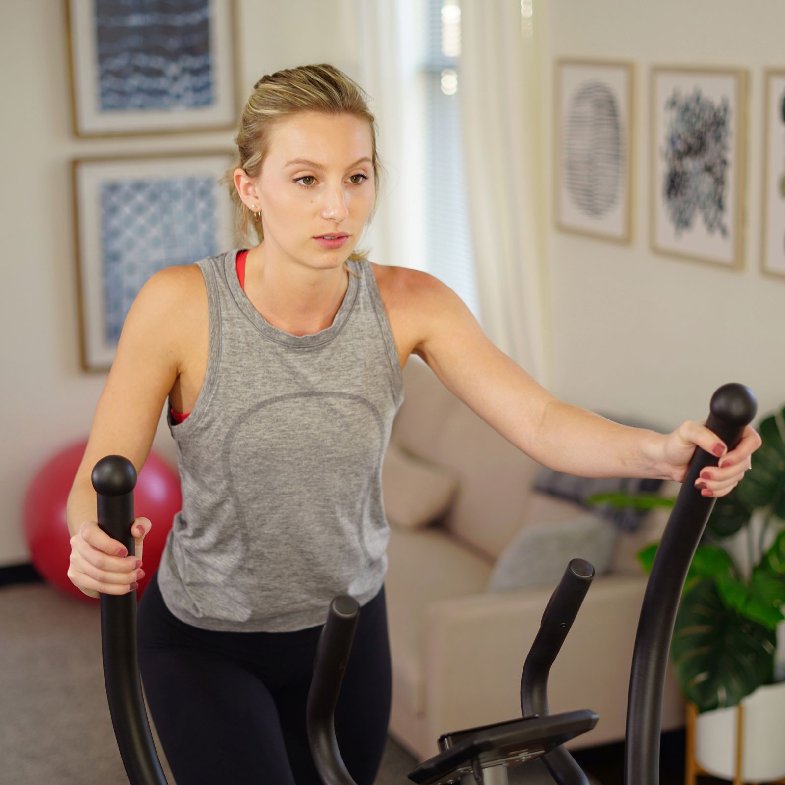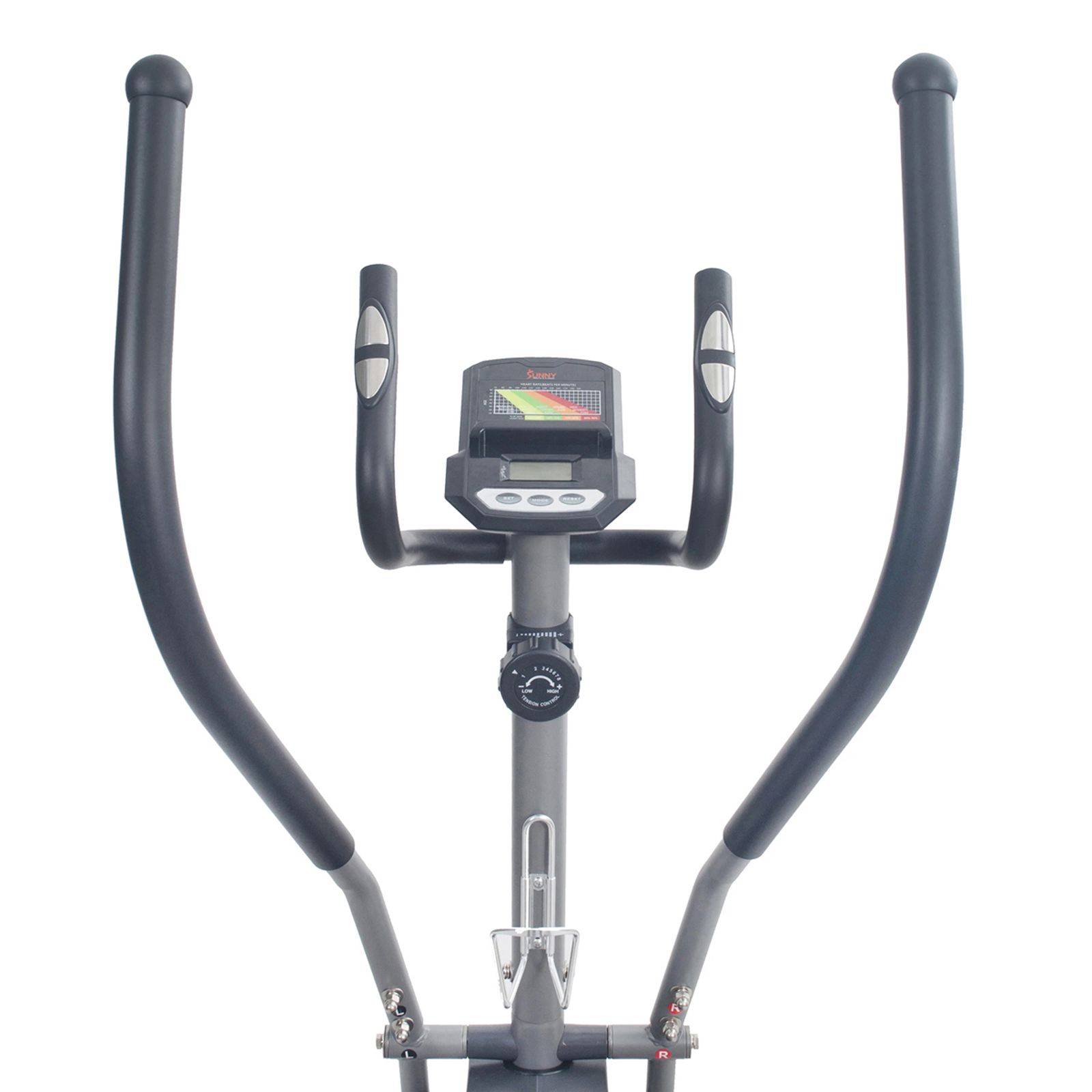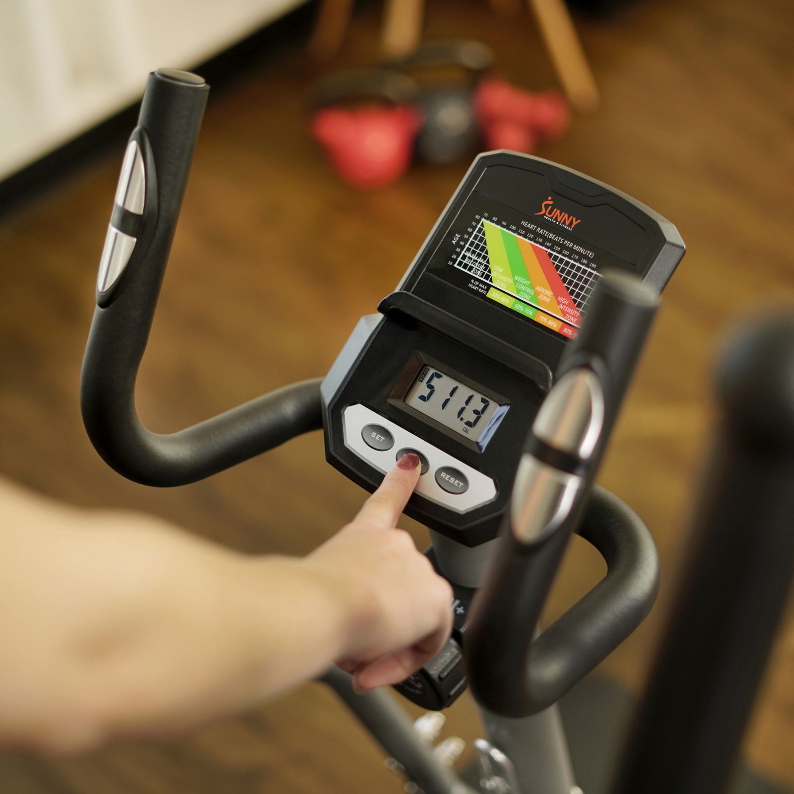 The Sunny Health & Fitness SF-E3914 Pro Cardio Climber combines all the benefits and advantages of a traditional home elliptical machine with the small footprint and intense workout potential of a stair stepper. The smooth motion of the SF-E3914 puts users in a rhythmic full-body calorie-burning workout. Isolate and target your lower body muscles by cranking up the resistance to focus on your hamstrings, glutes, quads, and more. Track your exercise sessions by measuring time, speed, distance, calorie, odometer, and pulse.