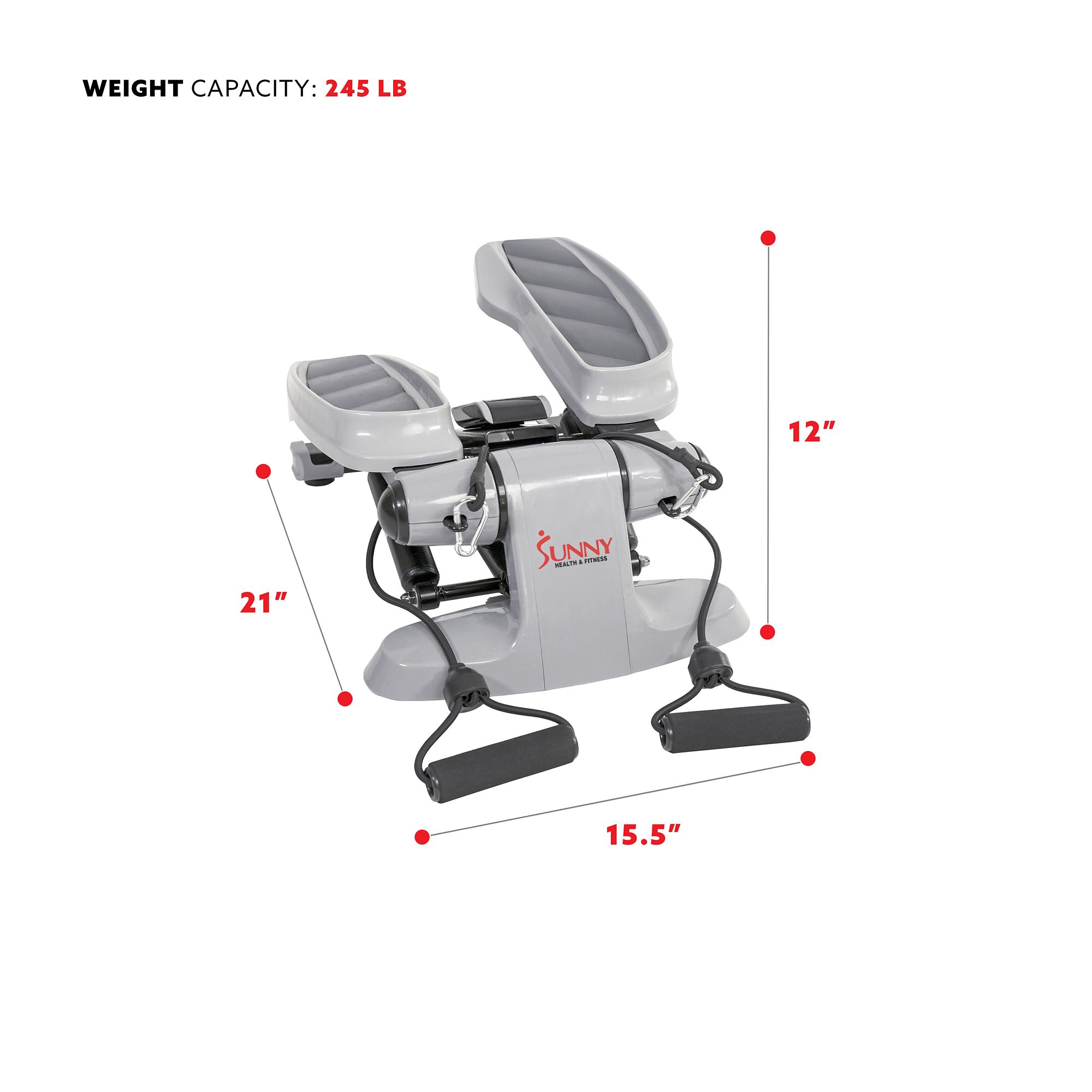 Convenient Display: Keep track of your progress by using the battery-powered LCD to cycle through time, calories burned, total steps, and steps-per-minute Resistance Bands: Get a total body workout when you attach the included resistance bands to the stepper. Use the bands, which have a weight equivalent of 15 lbs. when stretched, or attach your own removable bands, to perform exercises like crossovers and bicep curls Maximum Portability: This stepper weighs just under 22 lbs., which makes it easy to move and store in your home or office Ultimate Comfort: The wide-body design and ensure maximum stability with each step. And the oversized foot pedals have a textured finish that can reduce slippage while on the machine. The stabilizing feet make it easy to level to stepper on uneven surfaces Dual Hydraulic-Drive System: Experience quiet and powerful steps when you engage with the hydraulic drive system. The mechanism on the exercise stepper, which supports up to 245 lbs., is designed to assist you in challenging your glutes, thighs, and calves as you step Includes product, user manual, hardware, batteries
