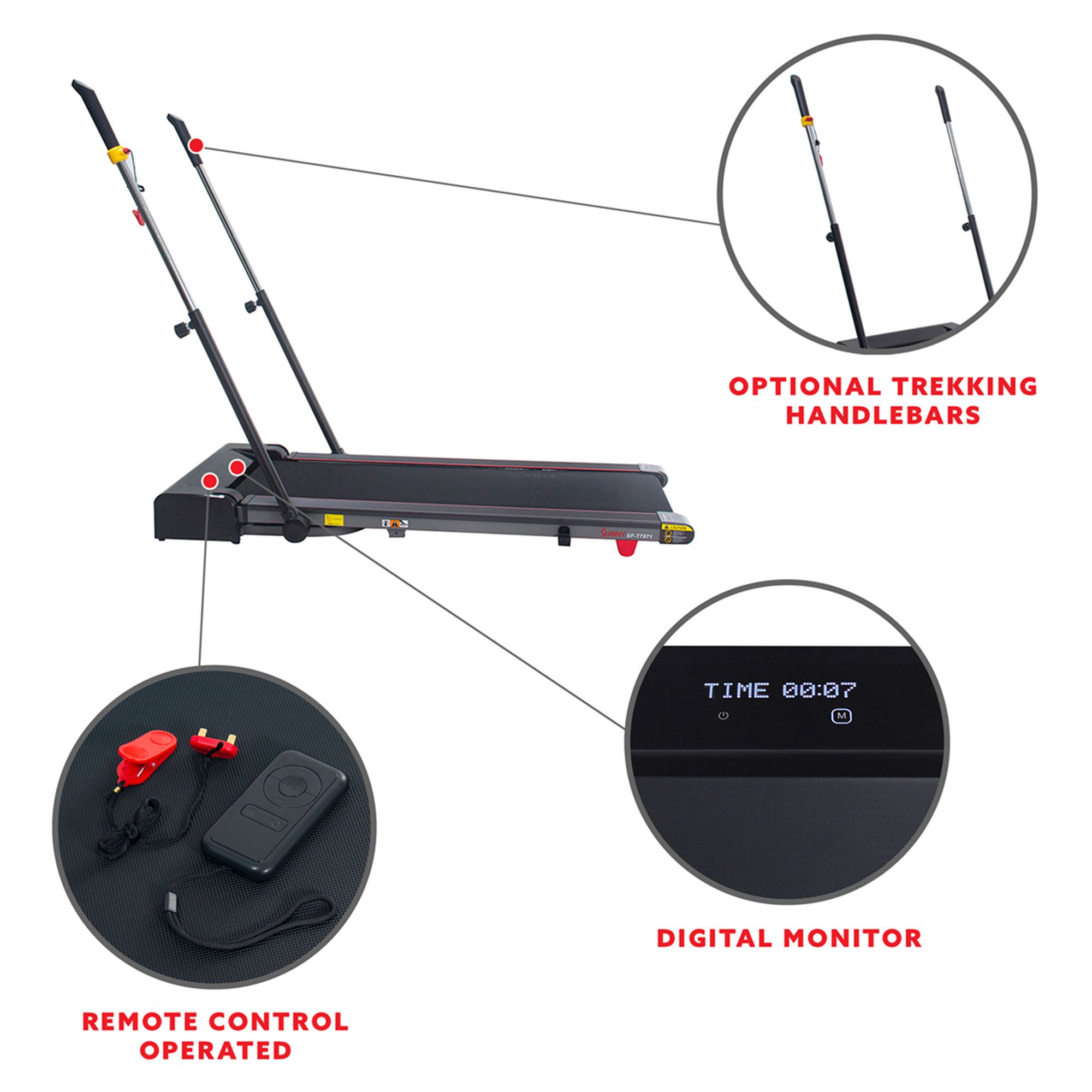 Includes arm exercisers for a total body workout. Convenient controls on the handlebar lets you start and stop and changes speeds on the fly 13.5" x 5.5" digital display tracks your Speed, Time, Distance, Calories Burned and Total Steps Flat walking surface on the treadmill allows for ample room to walk, jog or trek Trekpad conveniently folds to be space efficient Soft-drop mechanism gently and safely unfolds the treadmill when you’re ready for your next workout session When the treadmill is not in use for over 10 minutes, it will automatically enter into a energy-conserving power saving mode Treadmill is preassembled, just plug in and jump on Can be used under desk or stand alone, great for light cardio Easy stop and go controls with the included convenient remote Includes fully assembled slim flat treadmill, arm exercisers, remote, and product manual