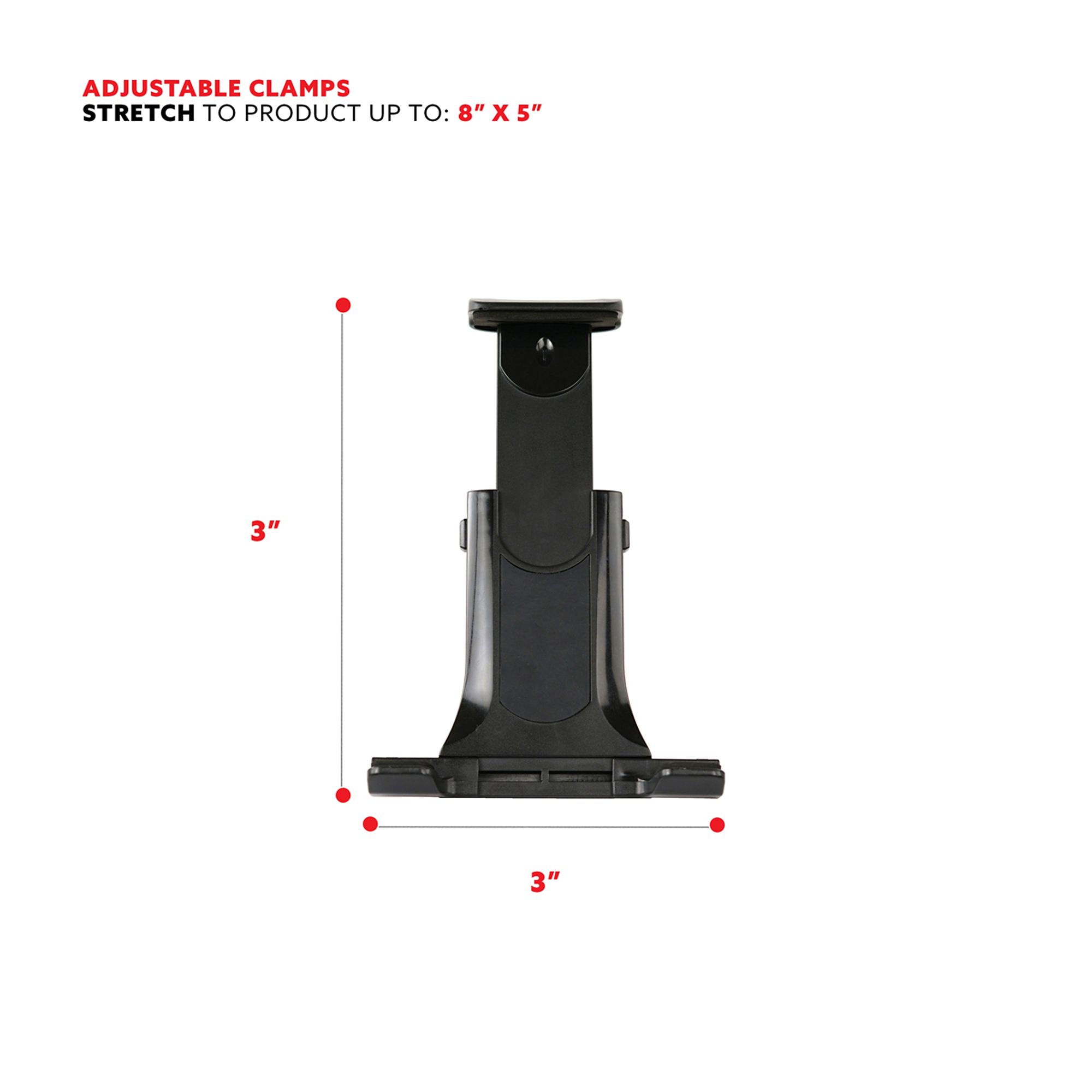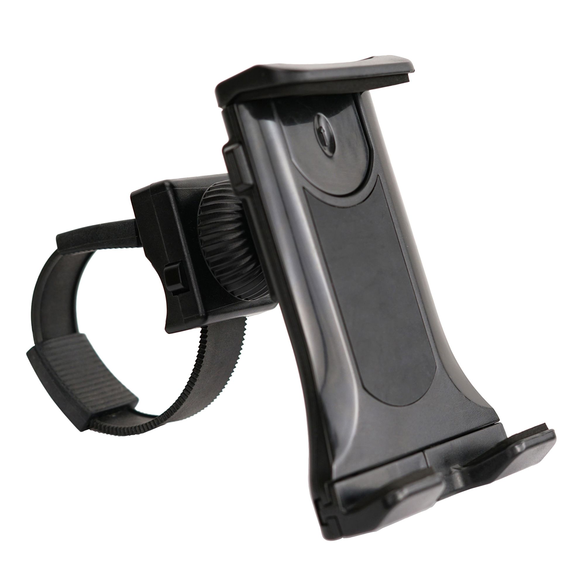 Device Holder Fits: iPad 3, iPad 4, iPad mini, iPad mini 3, iPad Air, iPad Air 2, iPad Pro 9.7 in, iPad Pro 10.5 in, iPhone 6, iPhone 7, iPhone 8, iPhone X. Measure your device to ensure an accurate fit. Press and hold the two buttons on the side to pull the retractable arm up to create room. For a secure and snug-fit, pull the retractable top clamp upward while placing your device in the open clamps Device holder pivots and rotates 360° to allow for various viewing angles Universal Bike Mount: The sleek design makes the tablet carrier great for most devices and tablets. Now you can follow your favorite fitness videos, listen to music, or read a book on your digital reading device while you work out. The device holder for ellipticals, indoor stationary bikes, or other exercise equipment with a rounded bar is sized at 4" in length and 3" in height and can stretch to 8" in length and 5" in width Durable Clamp: The durable clamp and grip ensure that your smartphone will stay securely fastened to your stationary bike or other fitness equipment that has a handlebar. The device band piece that wraps around your exercise machine can adjust to fit your indoor cycling bikes Handlebar for stability Adjustable: The top of the clamp holder easily slides up or down to fit the height of your device. The adjustable leg clamps adjust 3" in width to match your larger tablet devices. The cushioned accessory keeps your cellular device or tablet safe and secure from accidentally dropping while you're exercising. The swivel ball head attached to the strap allows you to adjust your device horizontally or vertically to better suit your viewing needs Includes product, user manual, hardware