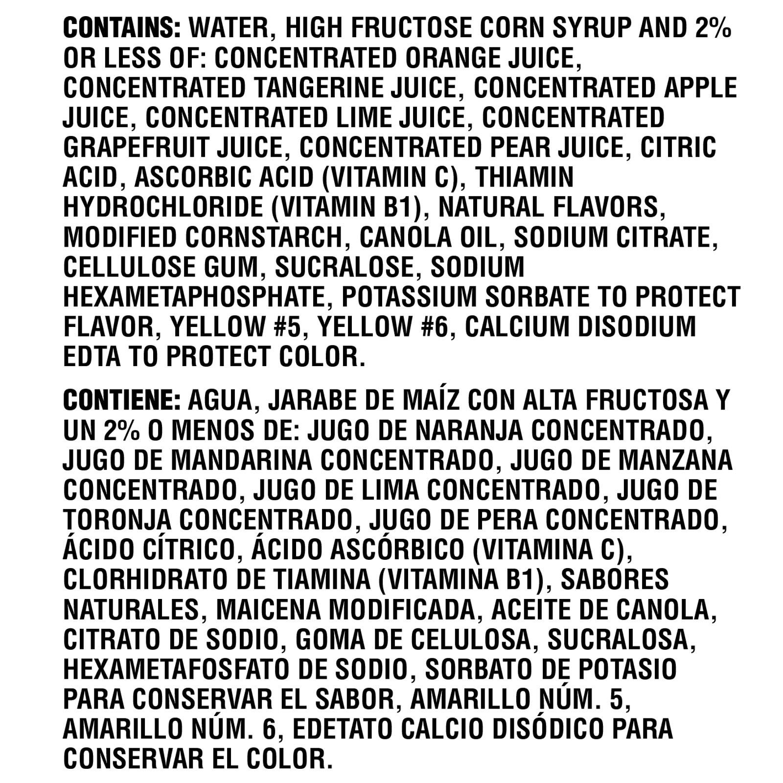 Water, high fructose corn syrup, and 2% or less of : Concentrated orange juice, concentrated Tangerine Juice, Concentrated apple juice, concenrated grapefruit juice, concentrated pear juice, citric acid, ascorbic acid, thiamin hydrachloride, Natural flavors, modifed cornstrach, canola oil, sodium cirate, cullulose gum, sucaralose, sodium hexametaphospahte, potassium sorbate to protect flavor, yellow #5 and Yellow #6, calcium disodium EDTA to protect color.