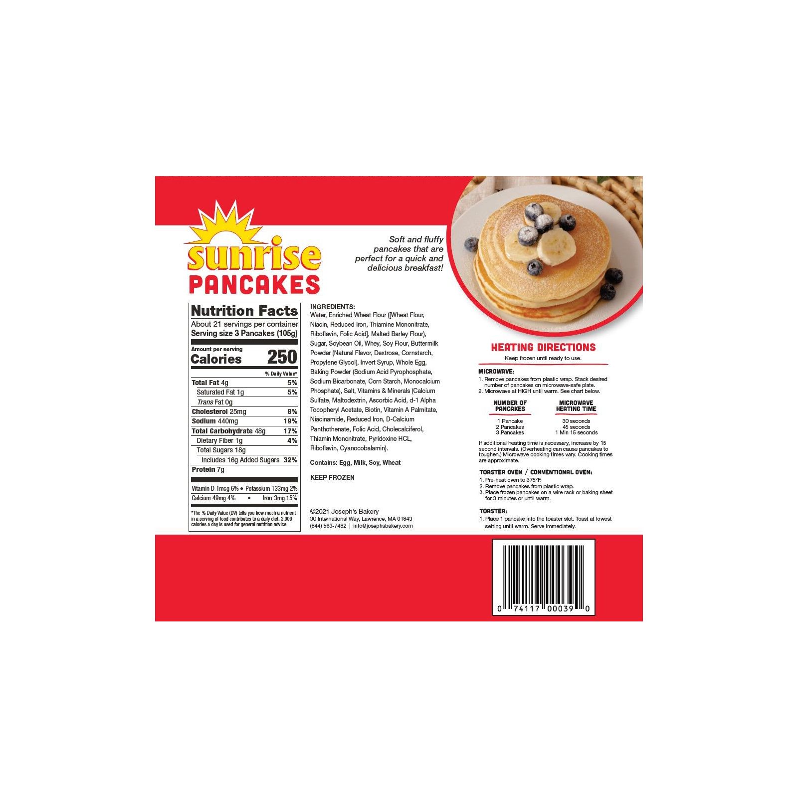 Sunrise Buttermilk Pancakes are golden brown and ready for your toaster. No artificial colors or flavors and ready to heat and enjoy. Just heat in your toaster on the lowest setting or pop in the microwave for 30-45 seconds. Great for Breakfast, Lunch, Dinner, and snacks. Your children, friends, and family will thank you for serving this quick and easy pancake regardless of the time of day. Great for after-school snacking or a tasty treat to take off the pre-meal hunger. Try with fresh fruit or just syrup. The product contains 64 Pancakes.