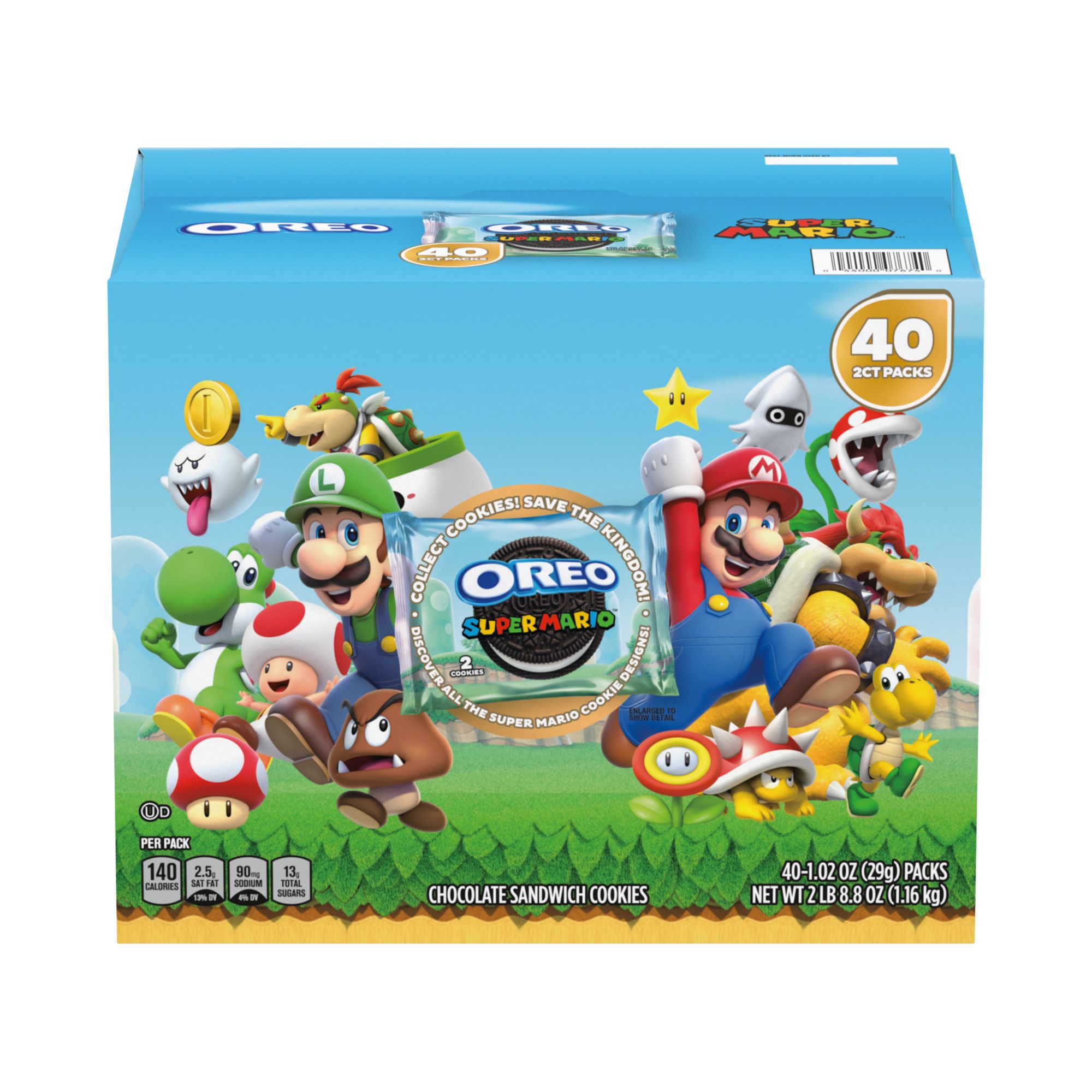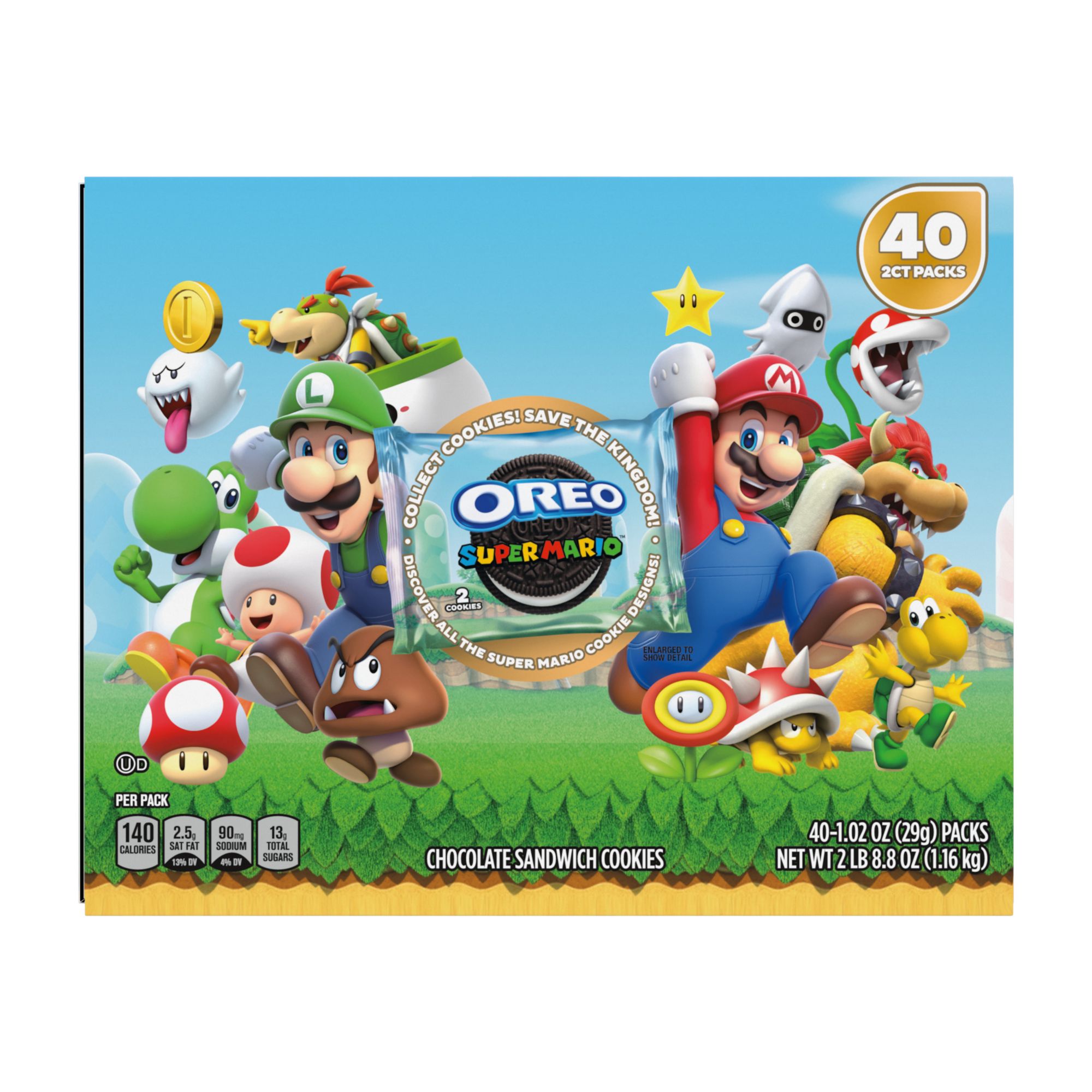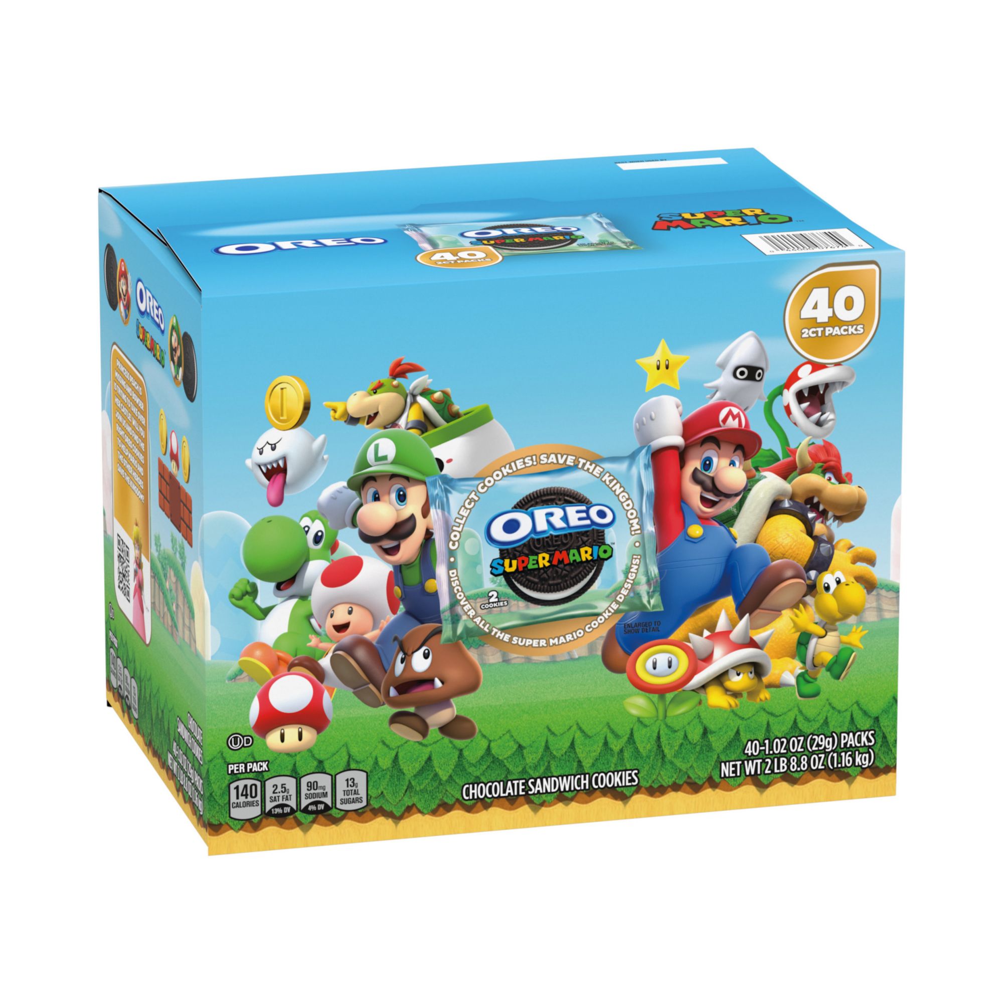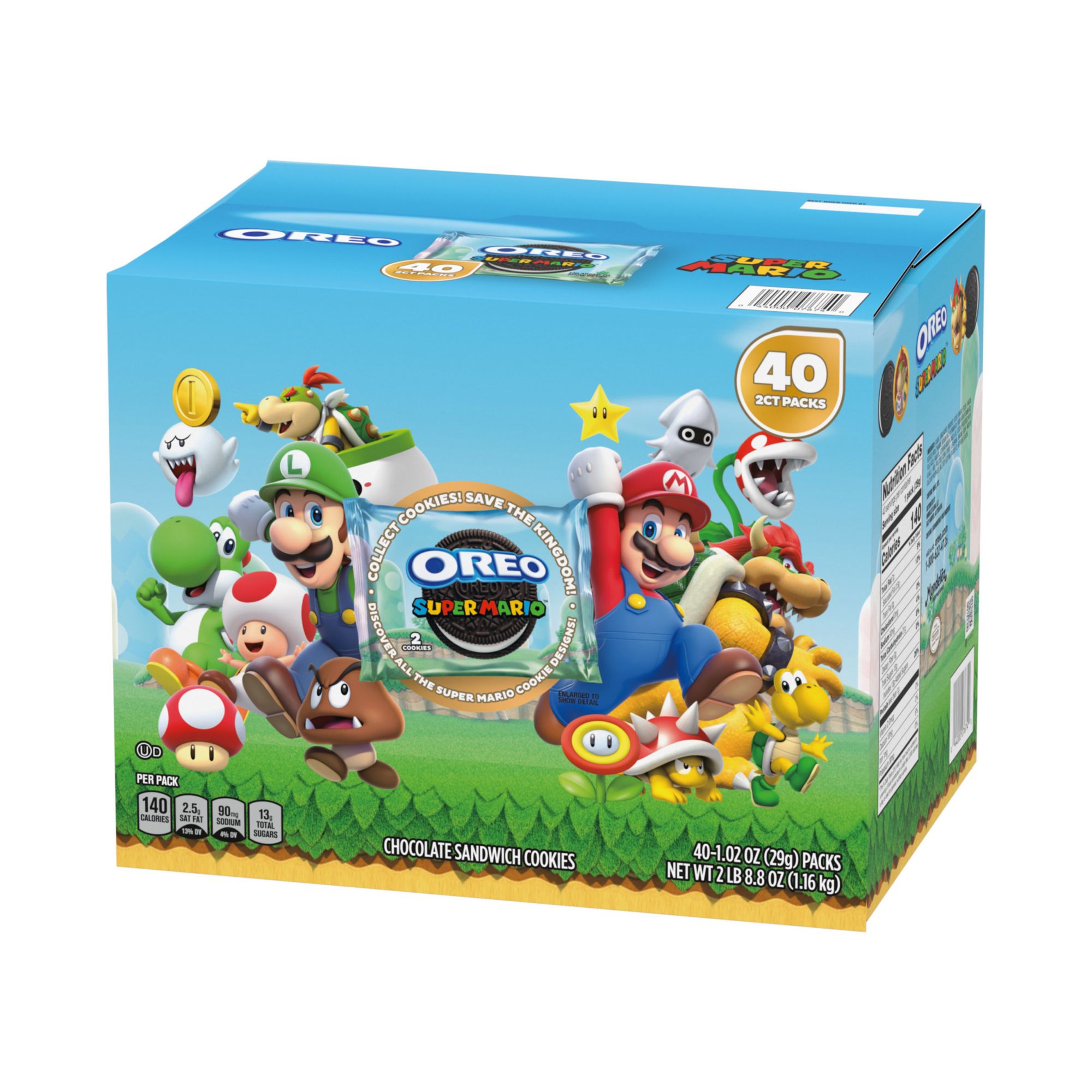 Includes chocolate sandwich cookies with Super Mario theme, 40 pk.