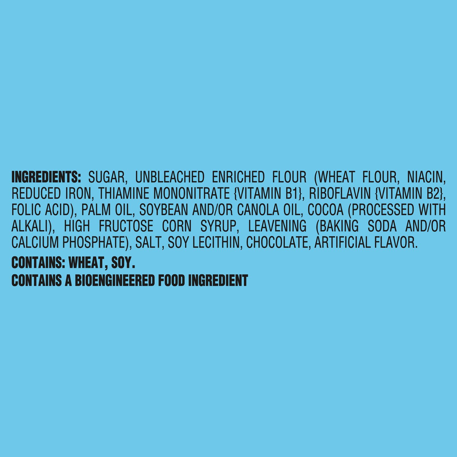 Ingredients: Sugar, Unbleached Enriched Flour (Wheat Flour, Niacin, Reduced Iron, Thiamine Mononitrate {Vitamin B1}, Riboflavin {Vitamin B2}, Folic Acid), Palm Oil, Soybean And/or Canola Oil, Cocoa (Processed With Alkali), High Fructose Corn Syrup, Leavening (Baking Soda And/or Calcium Phosphate), Salt, Soy Lecithin, Chocolate, Artificial Flavor.