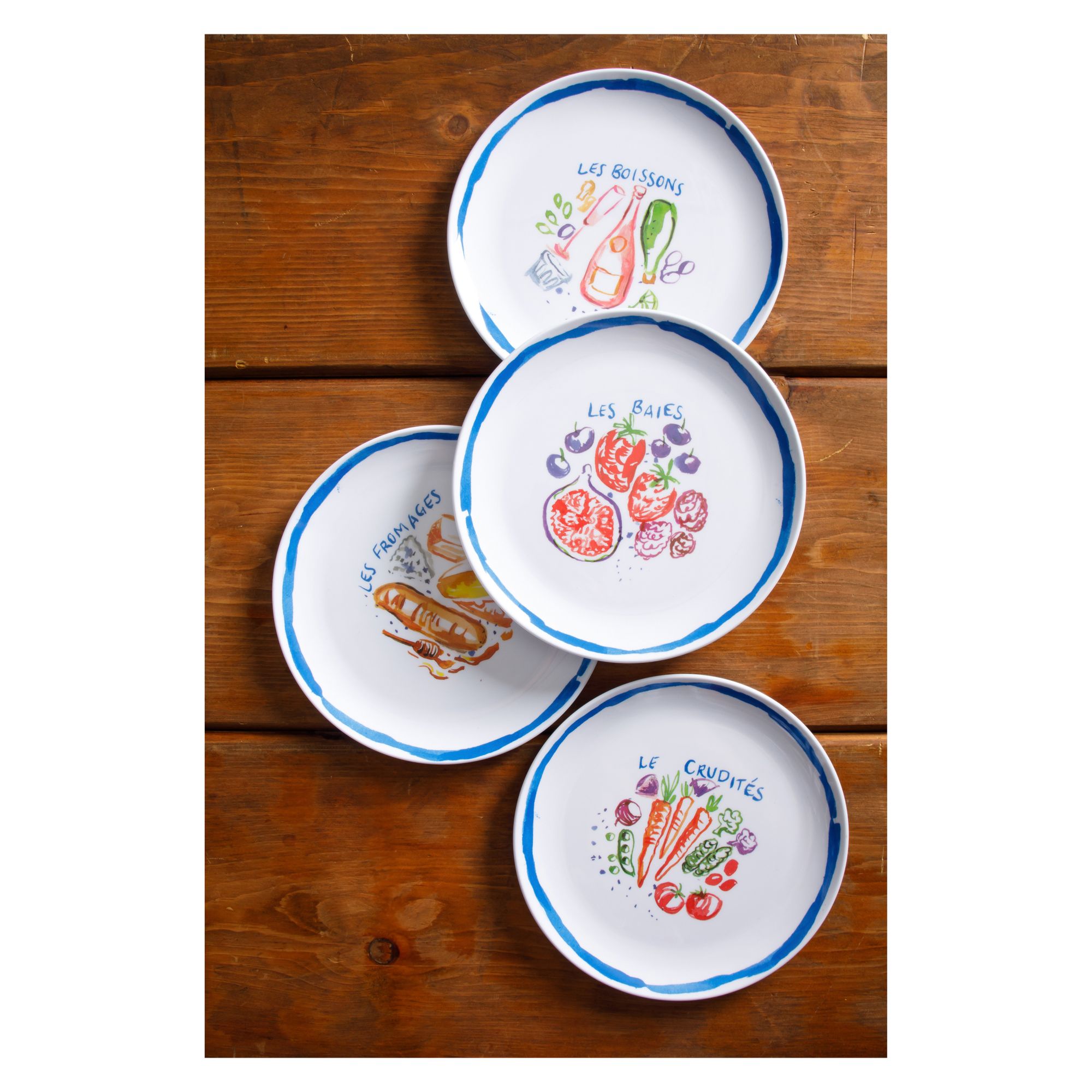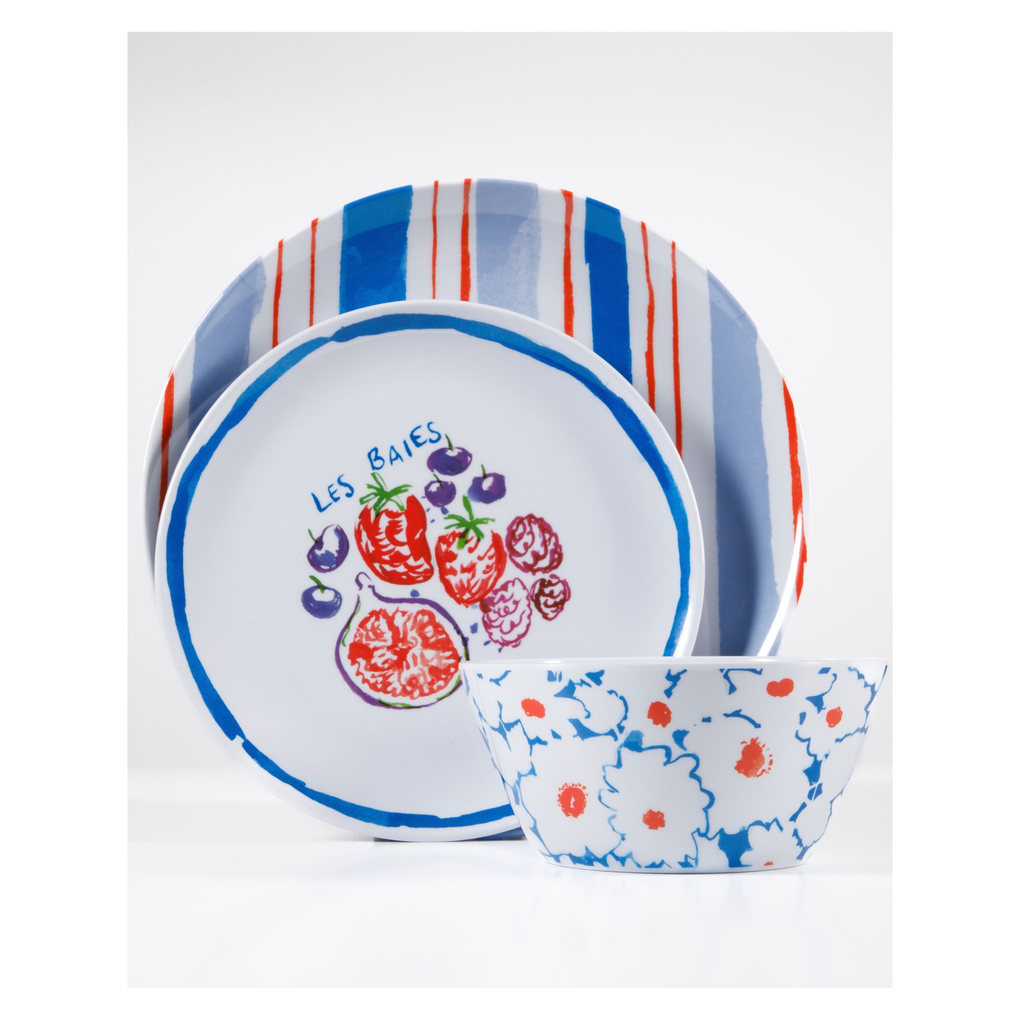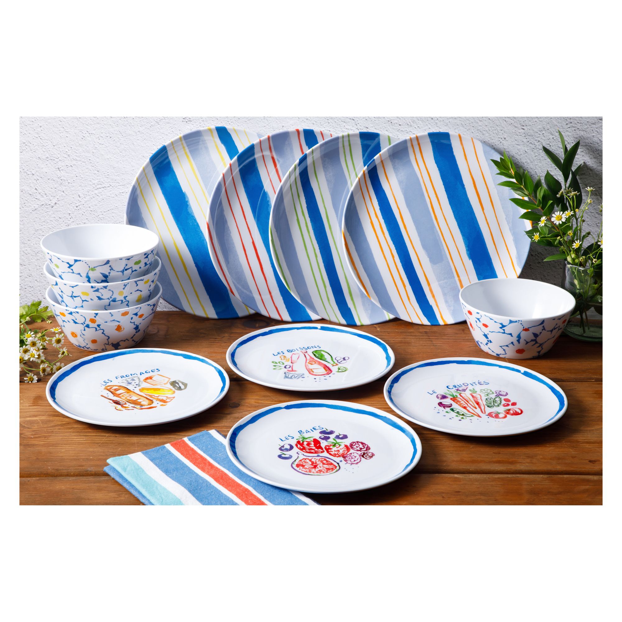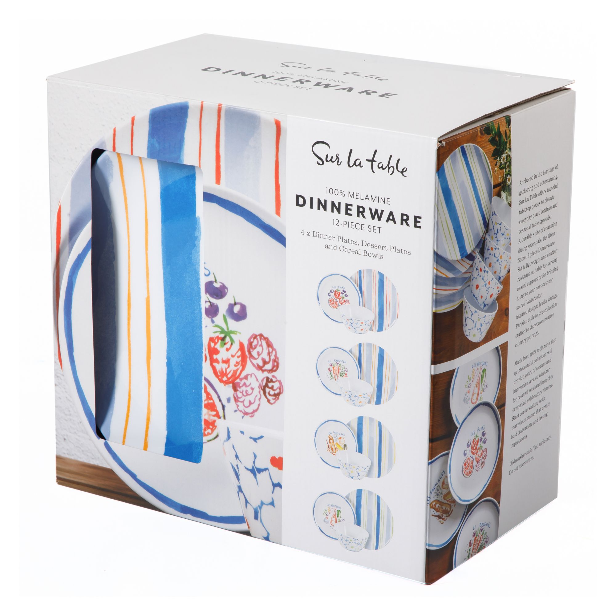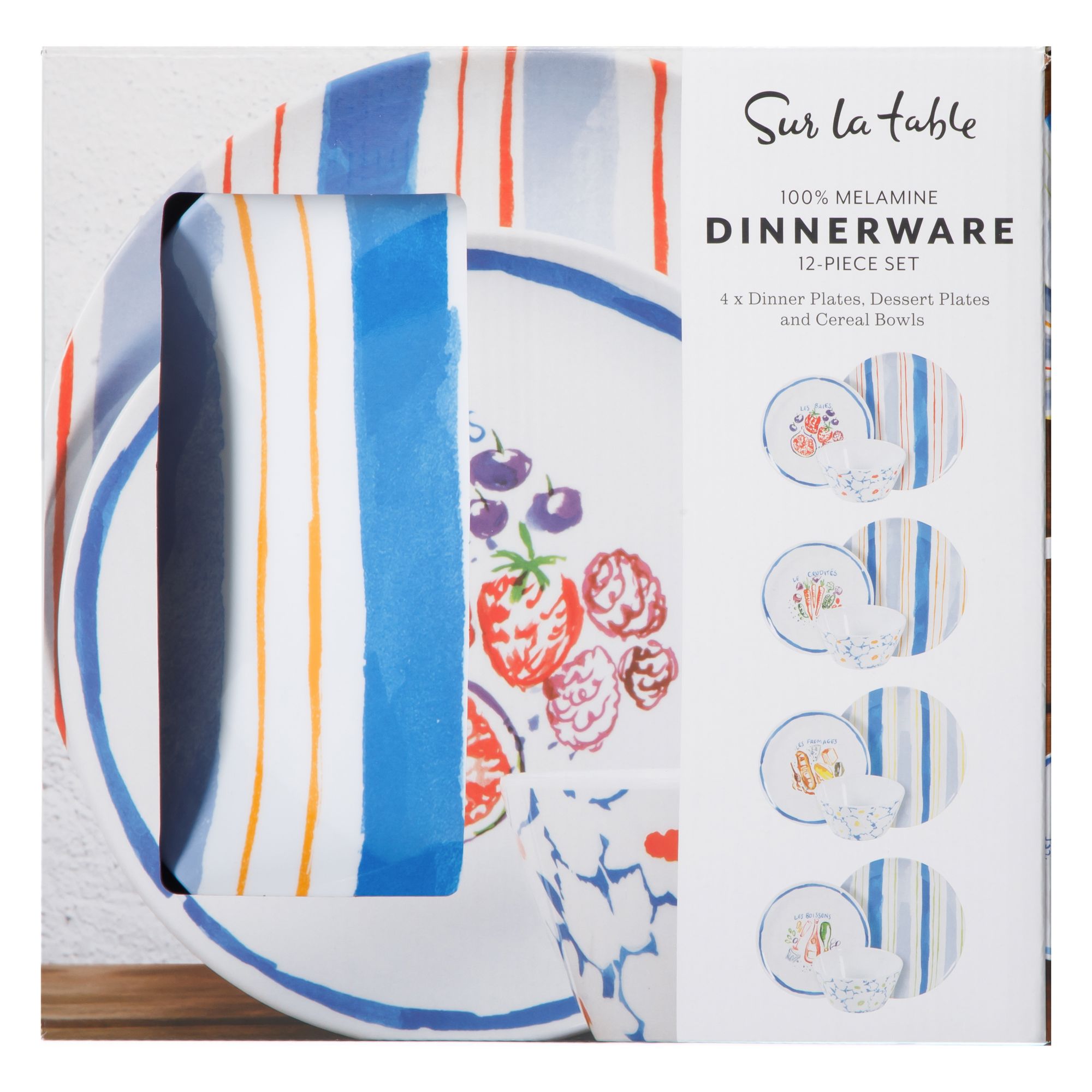 Alfresco entertaining is in order with patio-friendly melamine plates and bowls from Sur La Table. The River Seine 12-piece Dinnerware Set is crafted from 100% melamine to offer worry-free service for everyday dining, outdoor entertaining, and after-party cleanup. With vibrant colors and impressive weight, each piece of dinnerware lends a vintage, Parisian style–from beautiful watercolor-inspired designs that play well with other dining pieces to styles of tablescaping. Casual weeknight meals or seasonal outdoor parties receive an easy, upscale update from this colorful and chip-resistant collection. Dishwasher safe. Top rack only. Do not microwave.