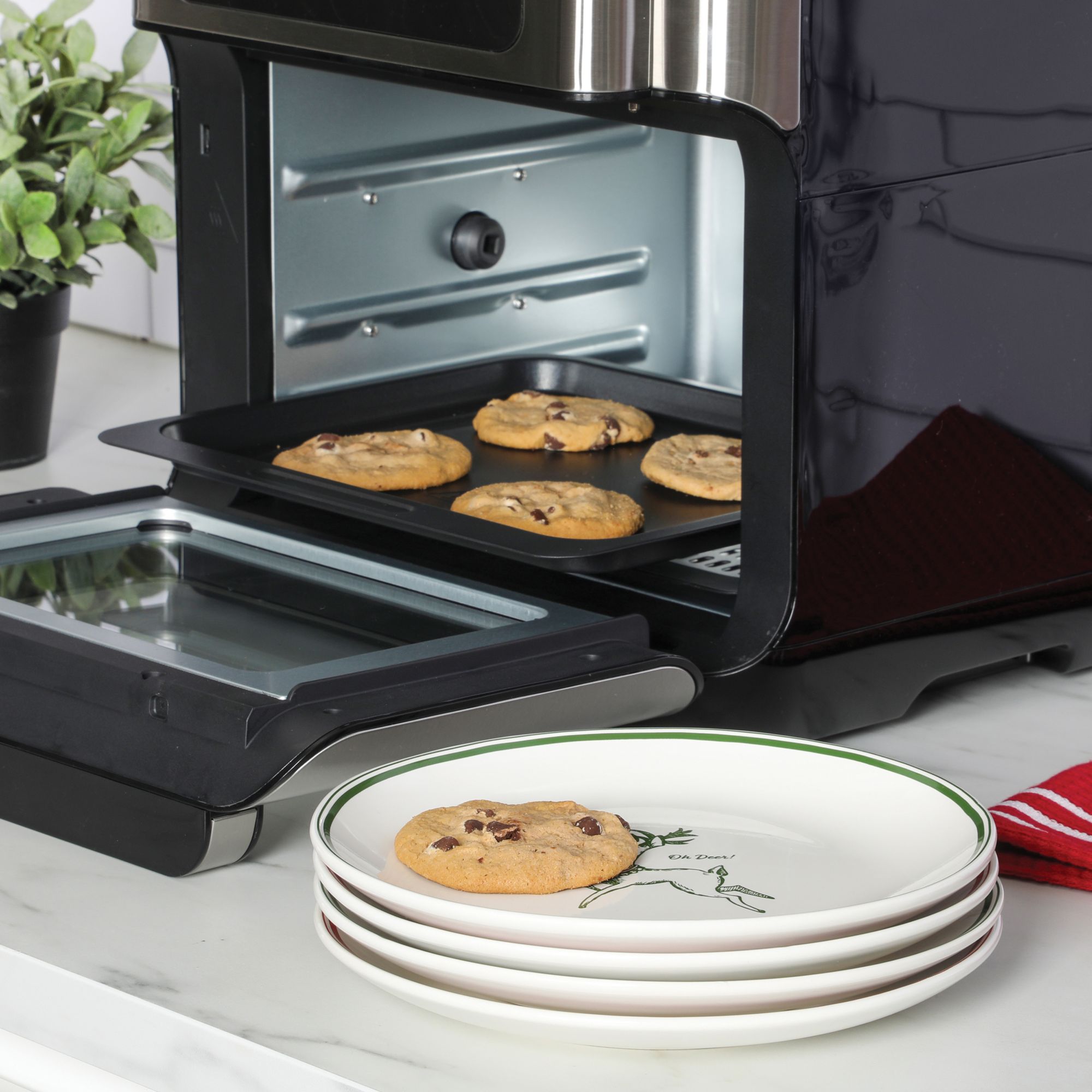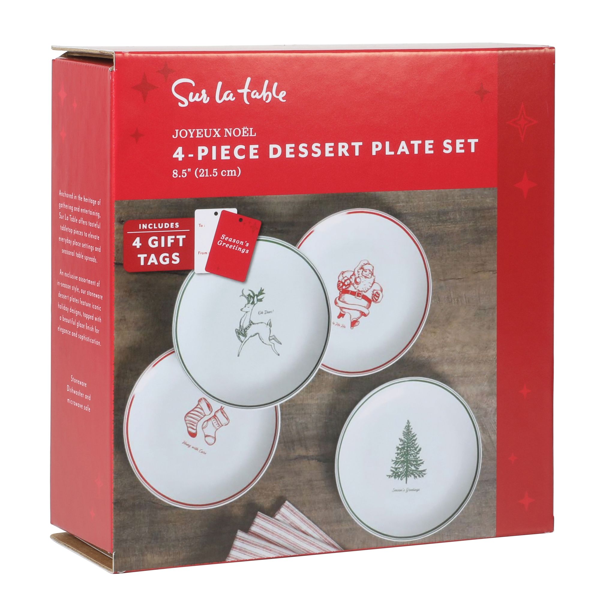 Deck the halls with the Sur La Table Holiday Dessert Plate Set. Crafted from durable stoneware, each 9” plate features a cute holiday design in festive colors, topped with a beautiful glaze finish for elegance and sophistication. Set the table with all four plates or mix and match them with other tabletop pieces to complete a welcoming holiday spread. Dishwasher and microwave safe.