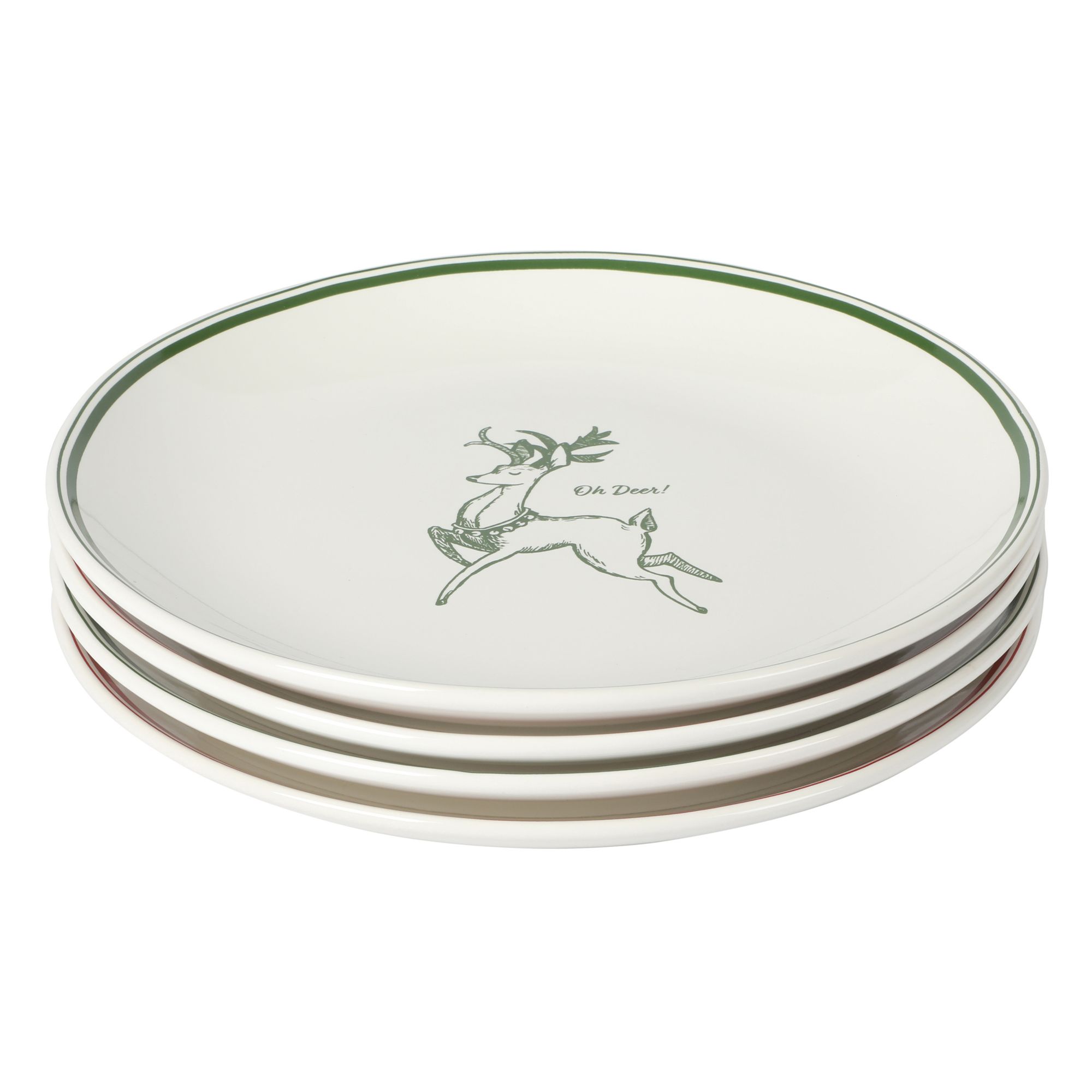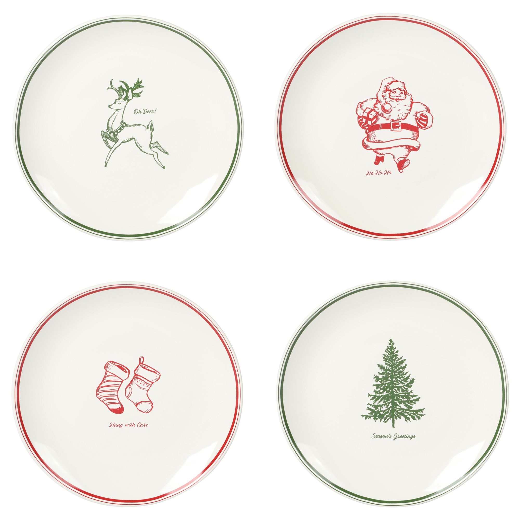 Includes set of four 9” stoneware plates with assorted holiday designs