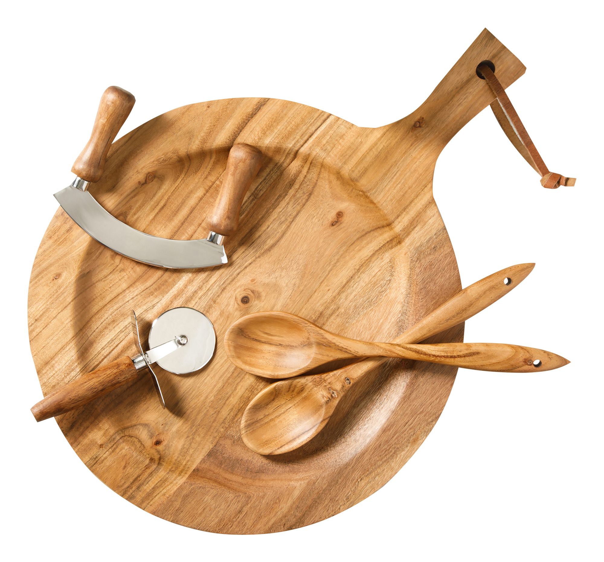 A SET INCLUDES: One 19-inch reversible acacia wood charcuterie board, one 5-inch pizza cutter, one 6.4-inch mezzaluna and two 11-inch wood serving spoon ACACIA WOOD BOARD: Italian-inspired acacia wood board designed to prepare and display charcuterie, cheese and other accoutrements for a relaxed style of entertaining and socializing. REVERSIBLE DESIGN: The flat side is perfect to use as a cutting or a charcuterie board, while the scooped side is suitable for mincing herbs with a mezzaluna, tossing salads or pasta using the wood spoons or simply serving fruits as a beautiful centerpiece. THOUGHTFULLY DETAILED GADGETS: The pizza cutter features a thumb guard to protect the hand from the rolling stainless steel blade, while the mezzaluna has a curved blade to allow for rocking motion to chop ingredients and mince herbs. Both have sturdy wood handles to provide a strong grip when slicing pizzas and flatbreads with precision. CARE INSTRUCTIONS: Hand wash only. Do not soak in water to prevent from splitting. Apply a thin layer of food-grade oil to maintain the wood's natural smoothness and rustic finish. Includes Serving Board, 2x serving Spoon, Pizza Cutter, Mezzaluna