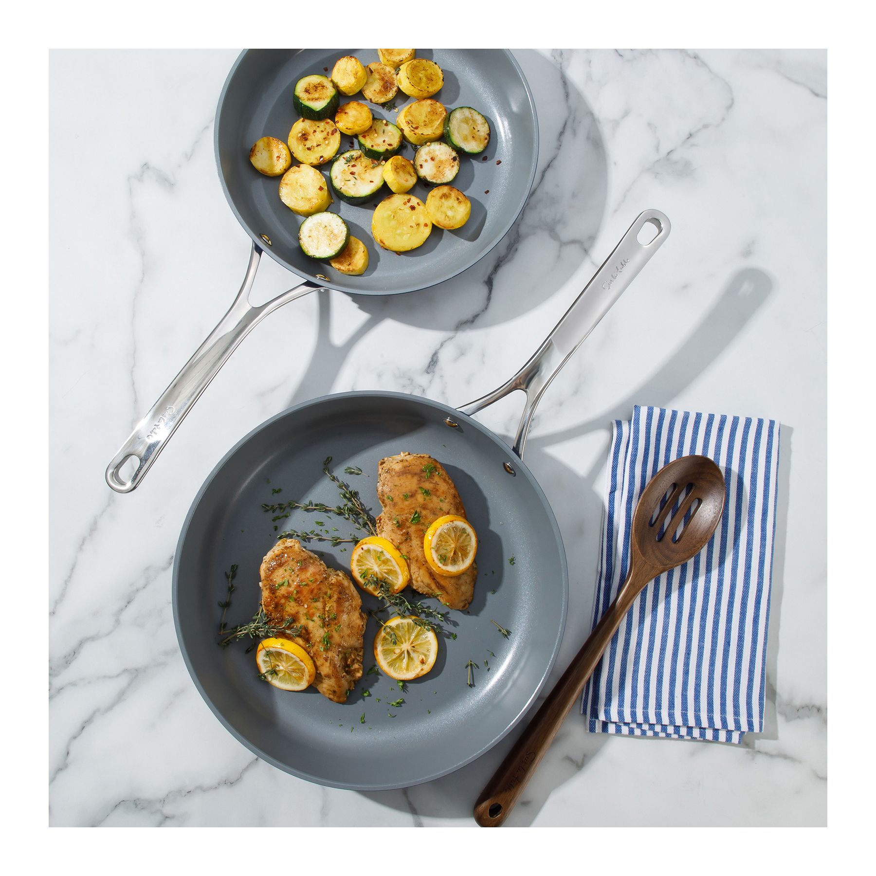 Exclusively at BJ's Heavy-Gauge Aluminum Cookware: Aluminum construction ensures uniform heat distribution and consistent culinary homeruns Made Without PTFE, PFOA, Lead OR Cadmium: Ceramic nonstick interior has an easy-release finish to reduce oil or fat to cook healthier but still flavorful meals Induction Safe: Suitable to use on induction, gas, electric, halogen, glass, and ceramic stoves Glossy Enameled Exterior: Bright enameled exteriors resist scratches to keep your cookware looking new and vibrant Y-Shaped Handles: Double-riveted stainless steel handles feature a Y-shaped design to dissipate heat and help keep them cool to the touch A Top Registry Pick: A practical yet thoughtful gift for weddings and other special occasions Oven Safe: Up to 500°F Includes two ceramic nonstick aluminum skillets (10 inches & 12 inches)