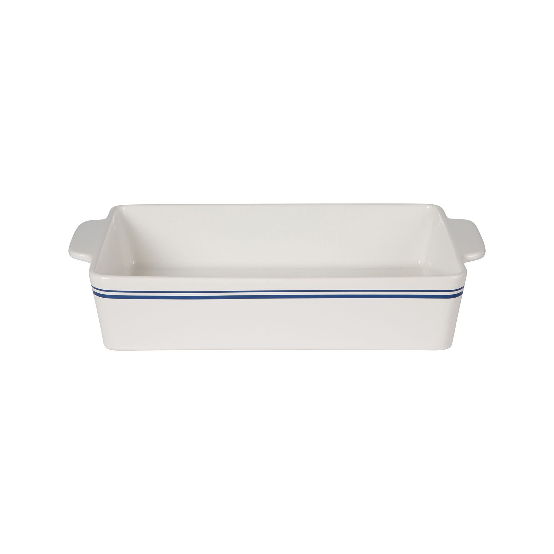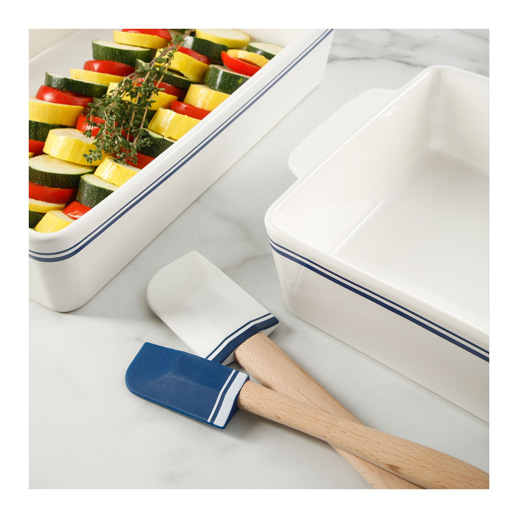 Crafted to Last: Stoneware construction provides strength and durability Tres Elegant: Solid, tailored bands add a classic, French bistro-inspired charm to any table Serve in Style: Sturdy side handles provide a comfortable grip when lifting and serving au gratin dishes, casseroles, baked desserts, and more An All-Occasion Gift: An impressive and thoughtful gift idea for birthdays, weddings, special occasions, and memorable milestones Includes two rectangular bakers (11" and 13") and two silicone spatulas with wood handles