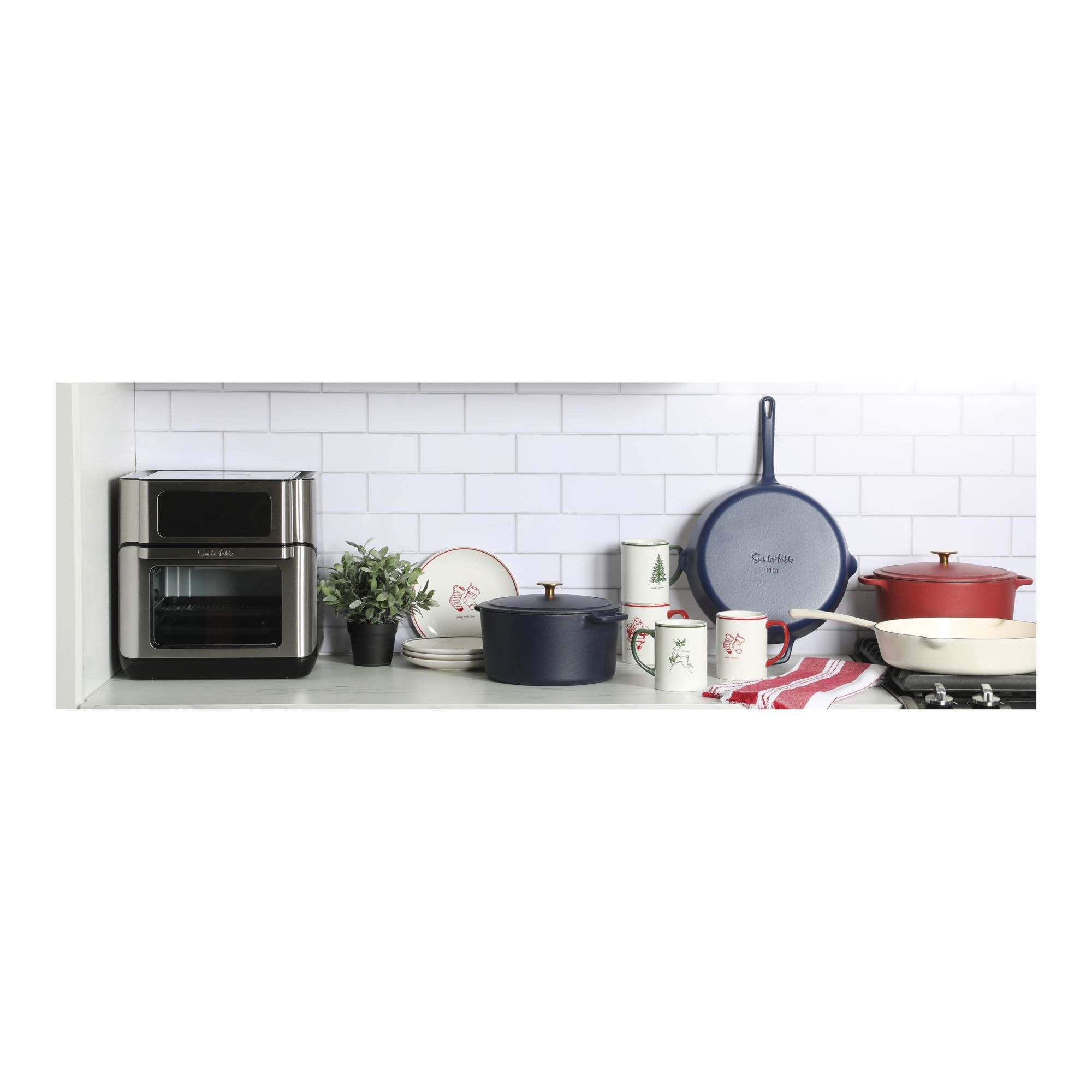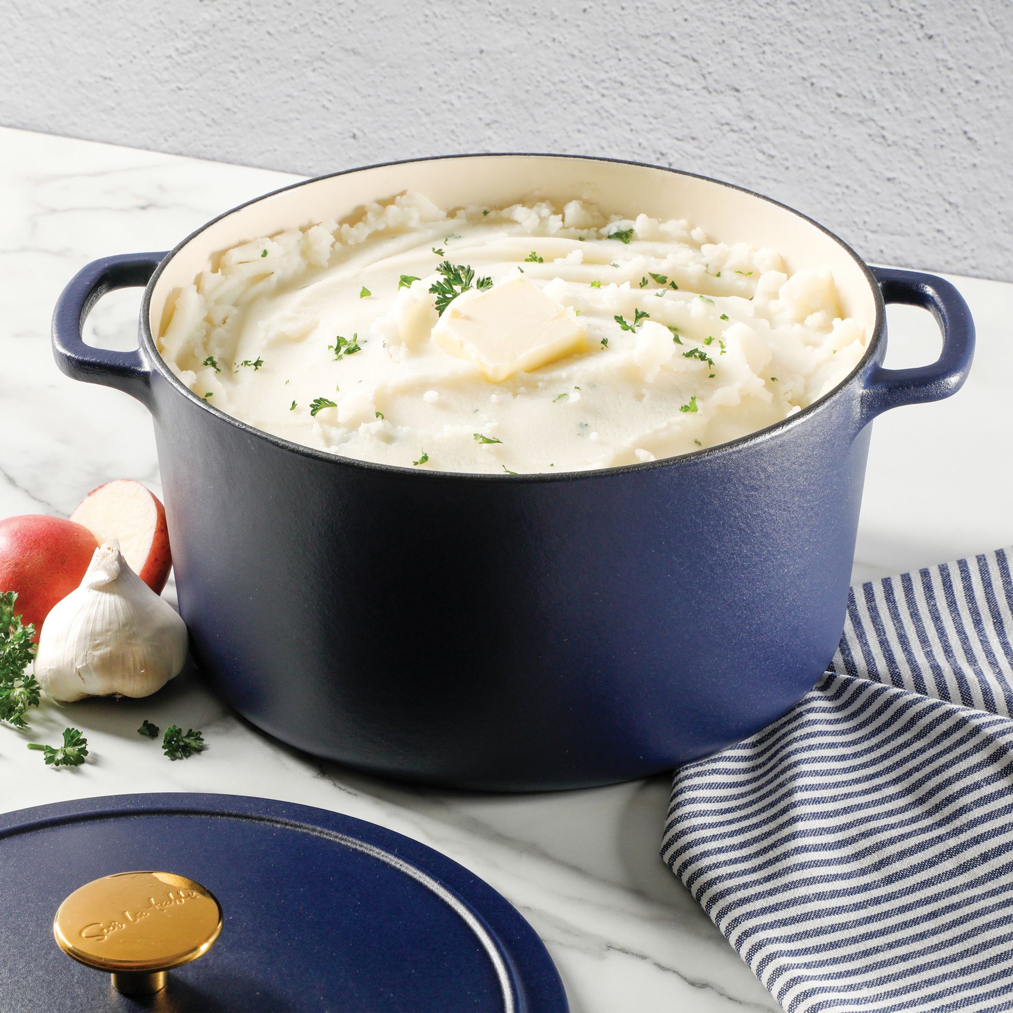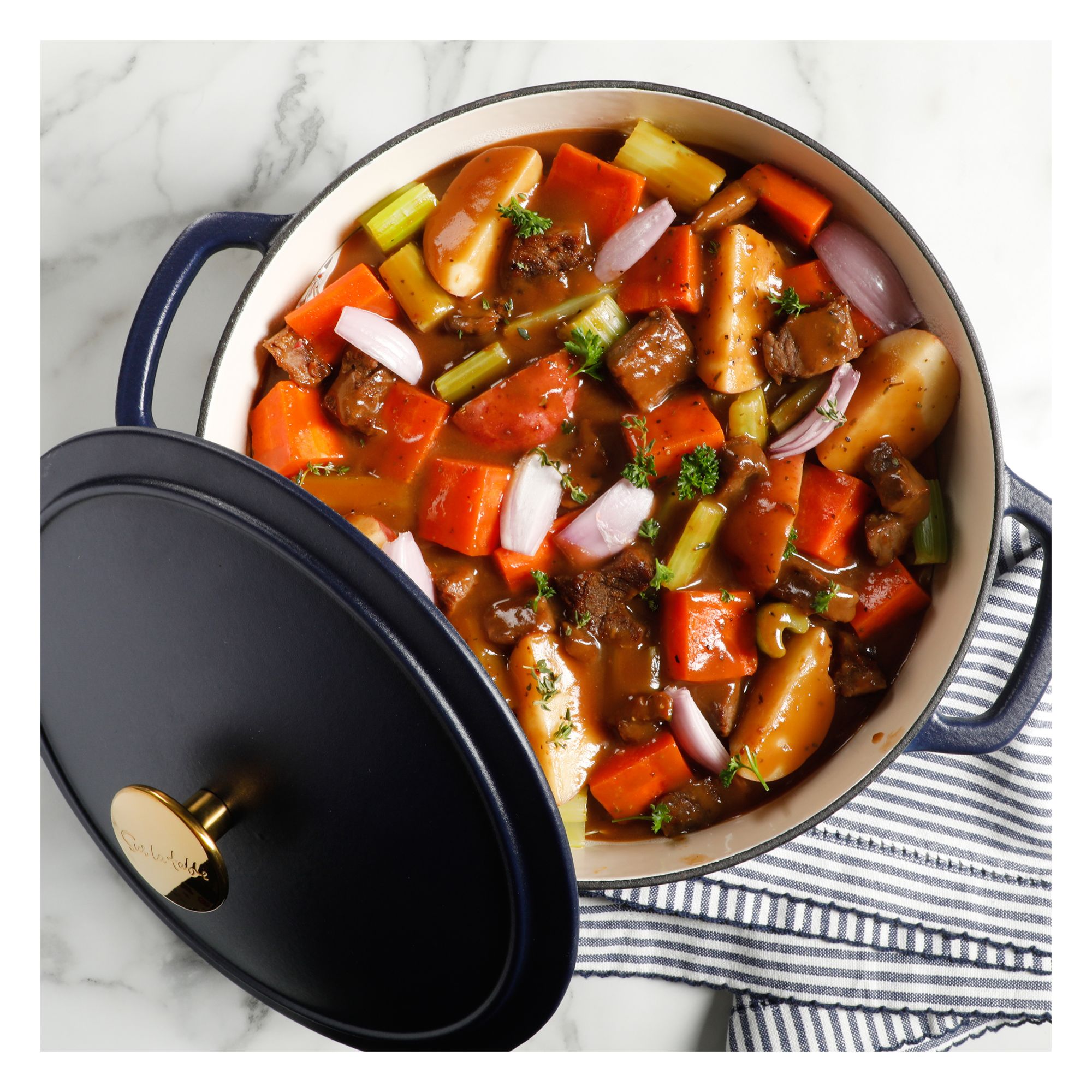 The Sur La Table Millau 5.5-quart Enameled Cast Iron Dutch Oven is a versatile kitchen workhorse that provides robust durability and timeless elegance all in one heirloom-quality piece of cookware. Well-loved for many generations in many home kitchens, the enameled cast iron Dutch oven promotes efficient heat distribution to serve up marvelous menus for everyday suppers and fancier fares. Safe on all stovetops and in the oven (up to 500 degrees), it features a matte enameled exterior for show-stopping serving presentations. You can even bring your signature dishes straight from the oven to the table. Simply use a pair of oven mitts or potholders to grab the sturdy side handles for a safe and supported grip. The self-basting lid ensures that the flavors and juices stay inside for tender, delicious results. Embossed nubs underneath the lid catch and redirect moisture back onto the food to create a self-basting cooking environment suitable for slow cooking, braising, and simmering.