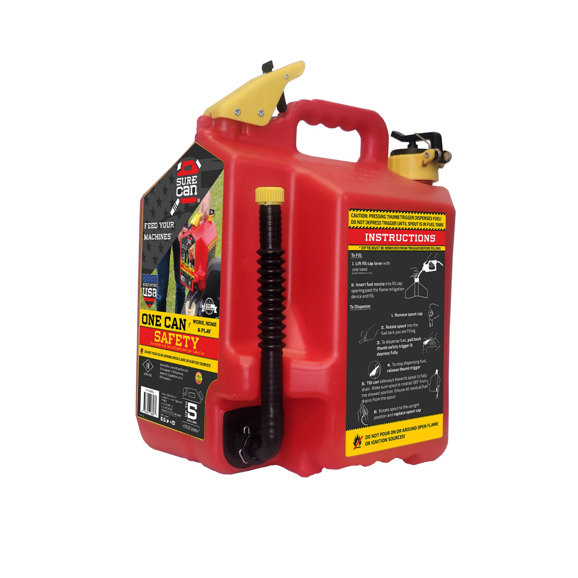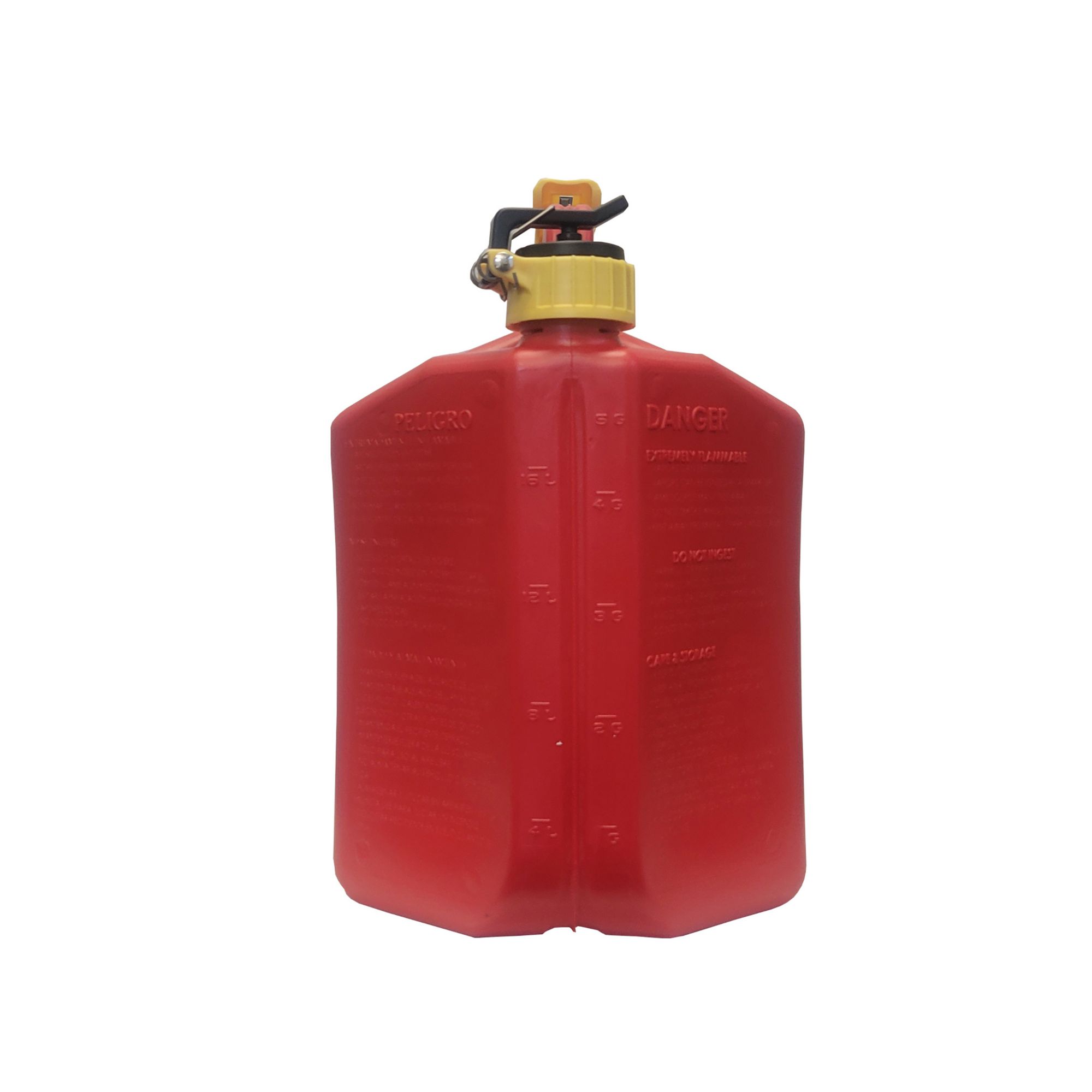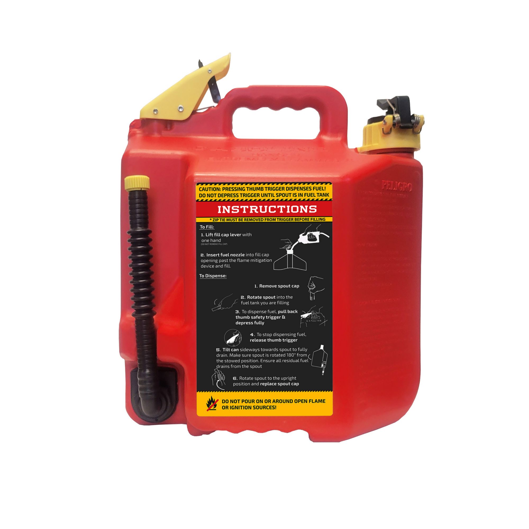 This gas can has plenty of capacity and is easy to use. The flexible spout rotates down more than 180 degrees and fits perfectly into any machine's fill location. When you notice your fill tank is almost full slowly release the thumb button and allow the excess fuel to drain from the top of the spout before rotating it back up. No more bending over and tipping your fuel can forward and holding it in an awkward position!