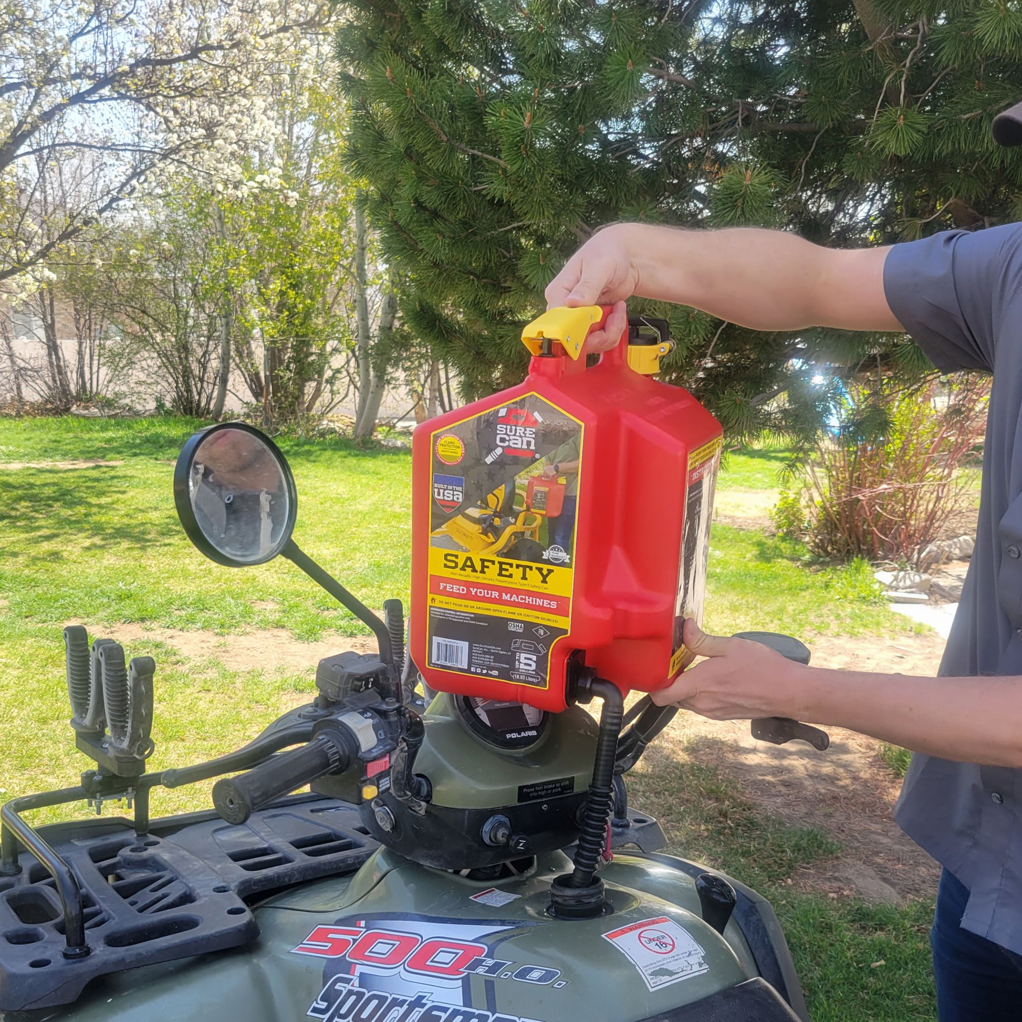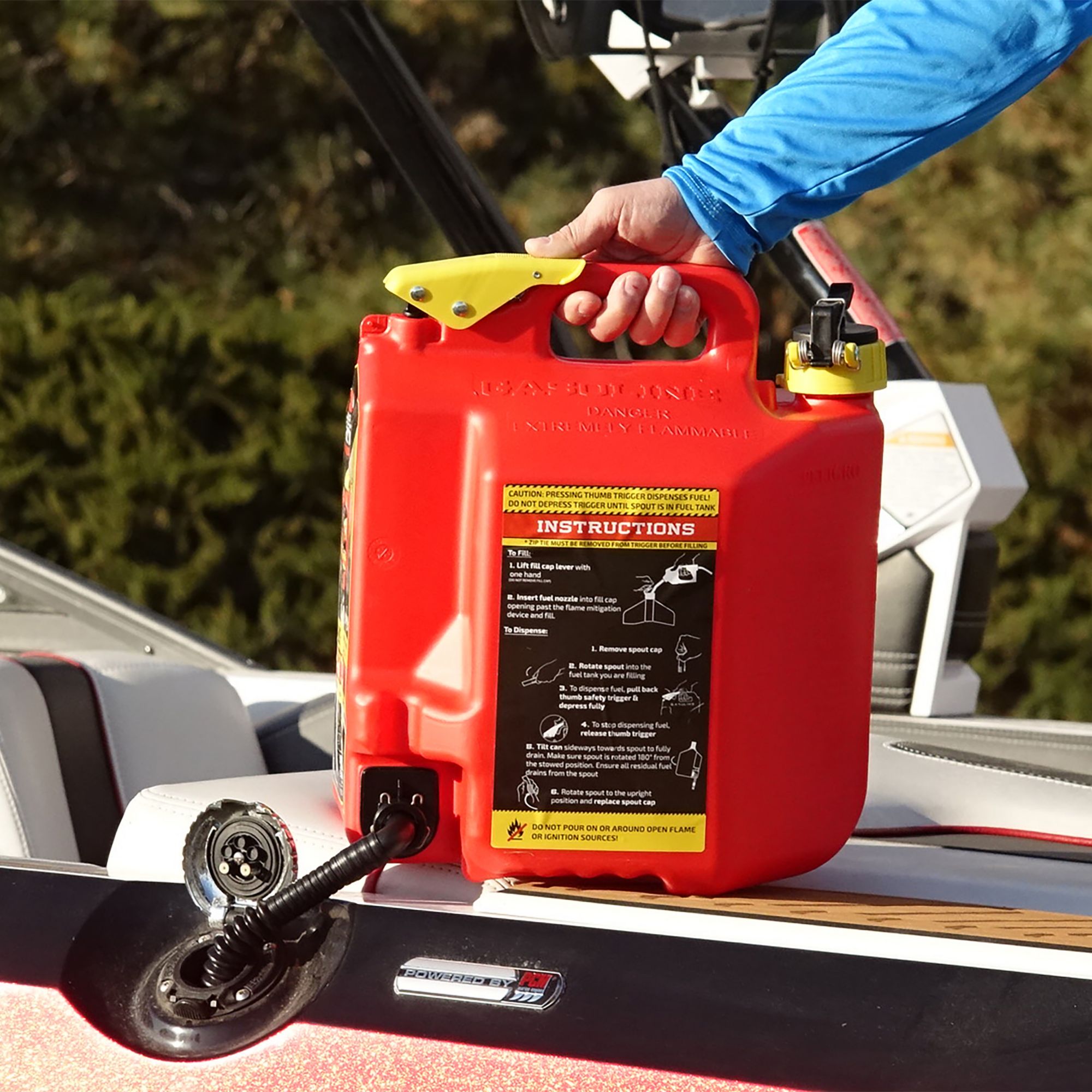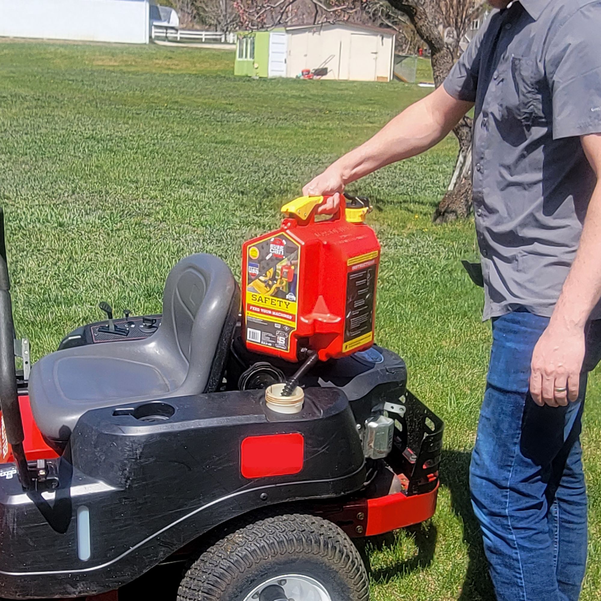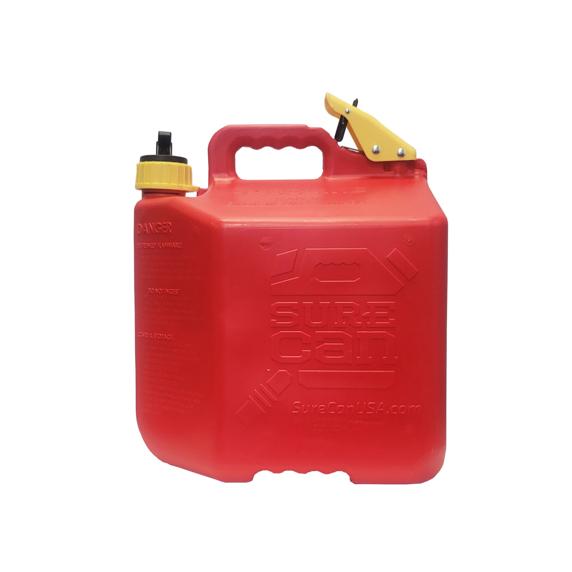This gas can has plenty of capacity and is easy to use. The flexible spout rotates down more than 180 degrees and fits perfectly into any machine's fill location. When you notice your fill tank is almost full slowly release the thumb button and allow the excess fuel to drain from the top of the spout before rotating it back up. No more bending over and tipping your fuel can forward and holding it in an awkward position!